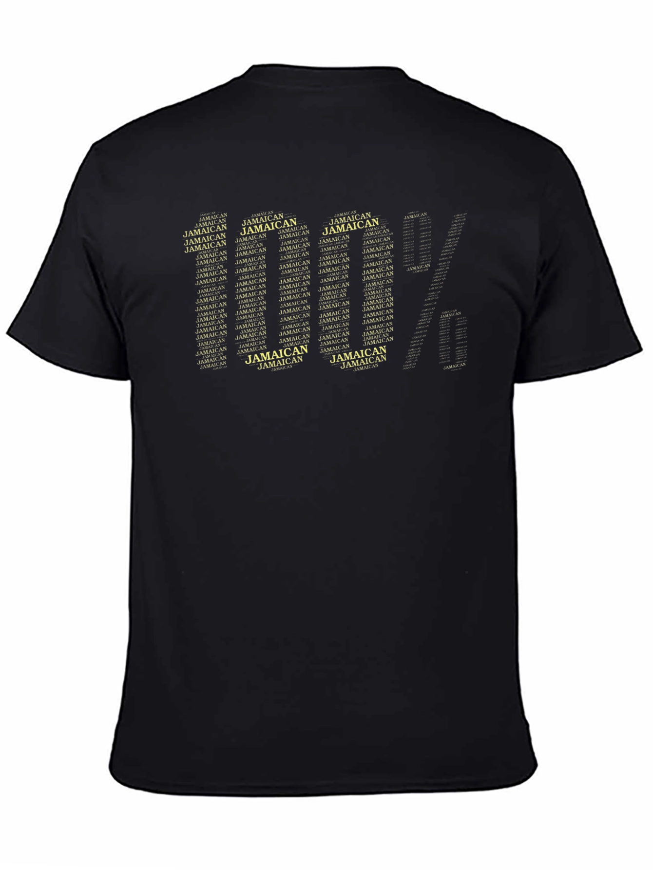 Showcase your Jamaican pride with this bold black t-shirt featuring a unique graphic design. The words "Jamaican" are cleverly arranged to form the phrase "100%", making a statement. The tee is constructed from a comfortable, soft-feel fabric, perfect for everyday wear. The classic crew neck and short sleeve cut offer a timeless, versatile fit for any occasion. Wear it casually with jeans, or dress it up with chinos for a more polished look. A great conversation starter and a must-have for anyone with Jamaican roots or an appreciation for the culture.