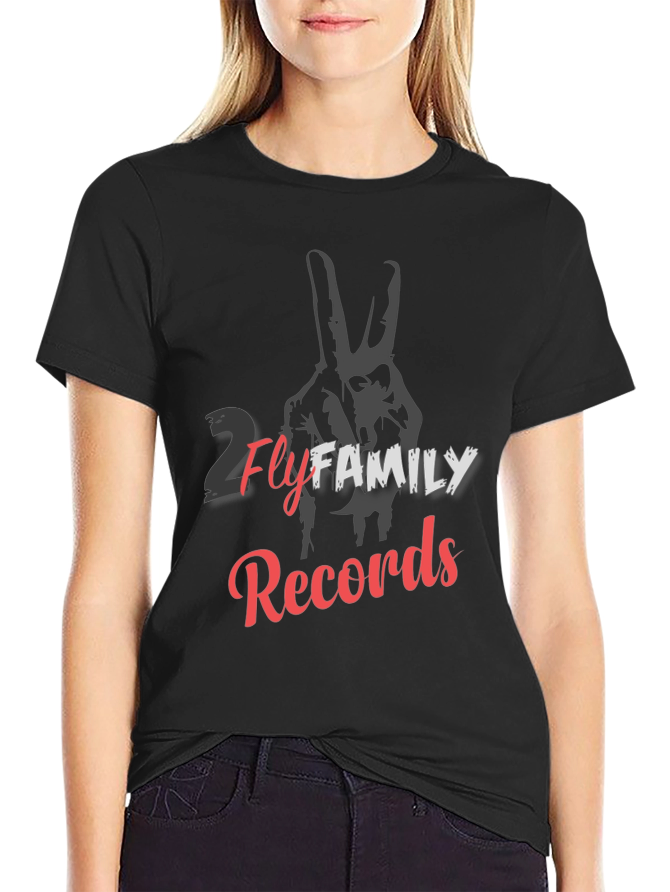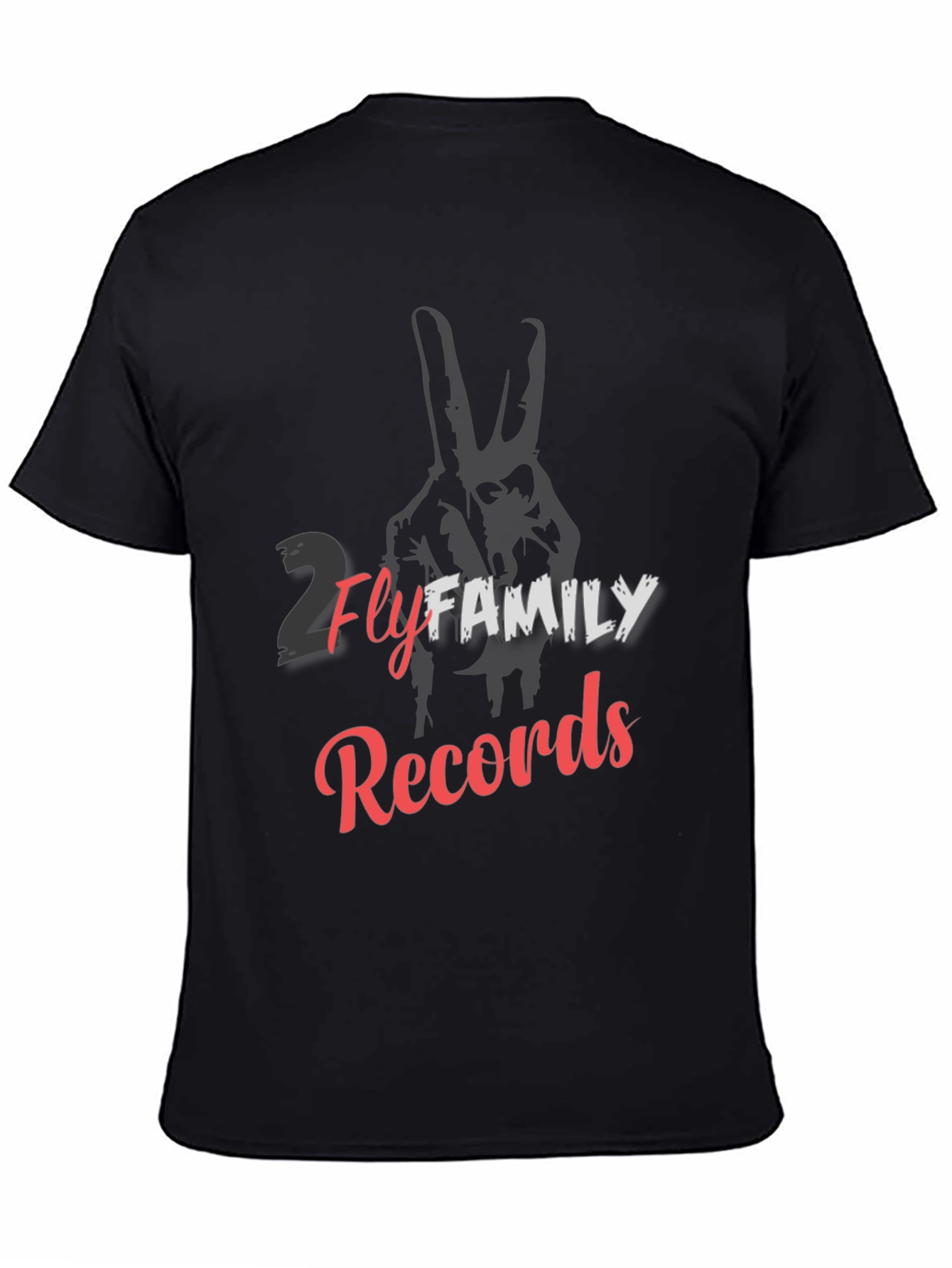 Show off your music taste with this stylish black t-shirt! Featuring the bold "2 Fly Family Records" graphic, this tee is perfect for music lovers. The design includes a faded hand peace sign behind the text, adding a touch of cool. Made from a comfortable-looking fabric, it's great for everyday wear, concerts, or just hanging out with friends. This unique shirt is sure to make a statement and showcase your appreciation for great music. Grab yours today and let the world know you're part of the 2 Fly Family!