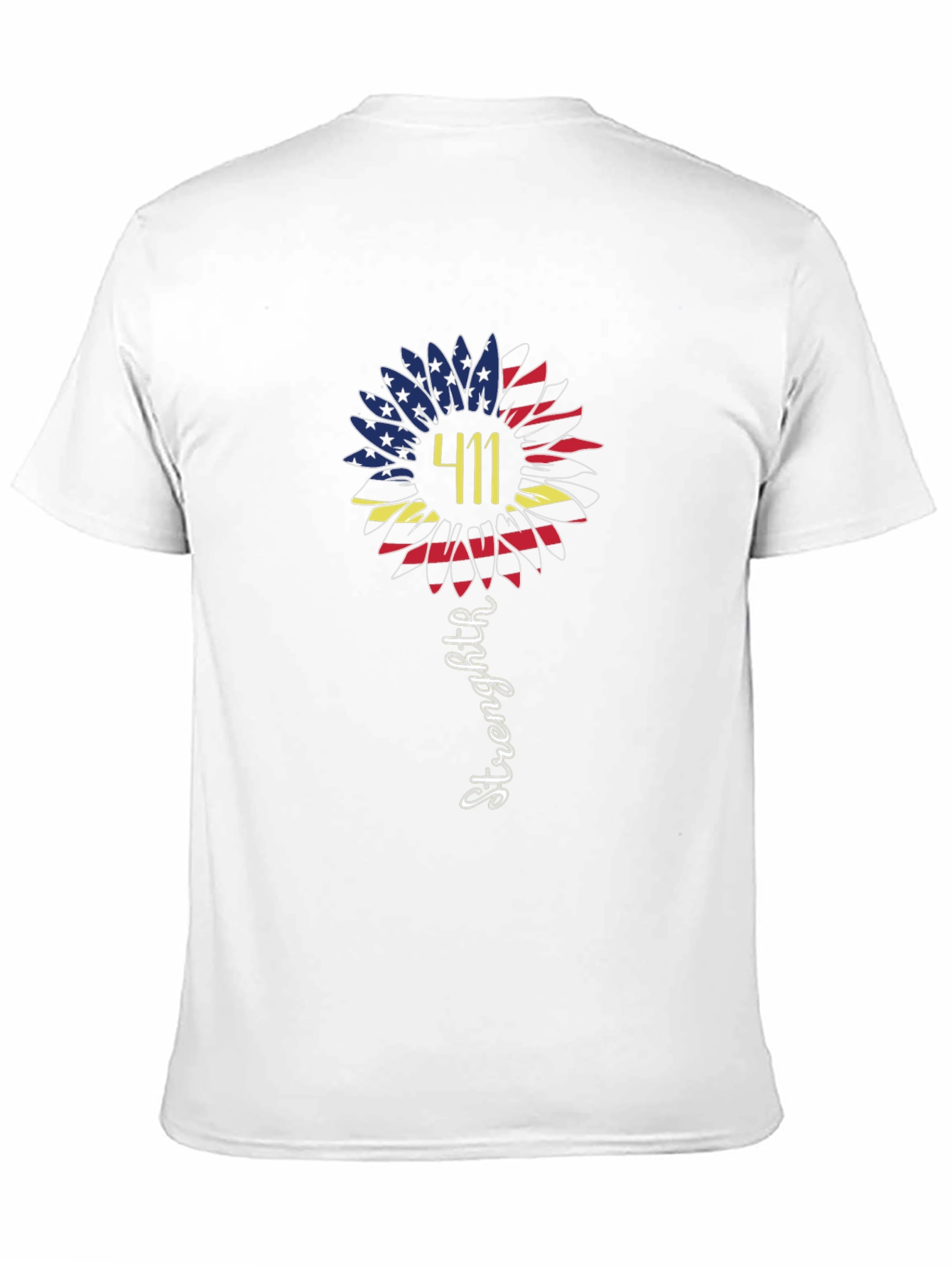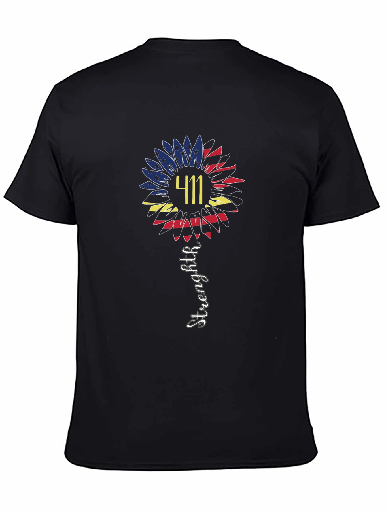 Show your support with this unique graphic t-shirt! This black tee features a striking sunflower design with American flag-inspired petals in shades of blue, red, and yellow. The number '411' is prominently displayed at the center, with the word 'Strength' elegantly written below, creating a meaningful statement. Made from a comfortable-looking fabric, this shirt is perfect for everyday wear and expressing your values. Ideal for casual outings, patriotic events, or as a thoughtful gift.