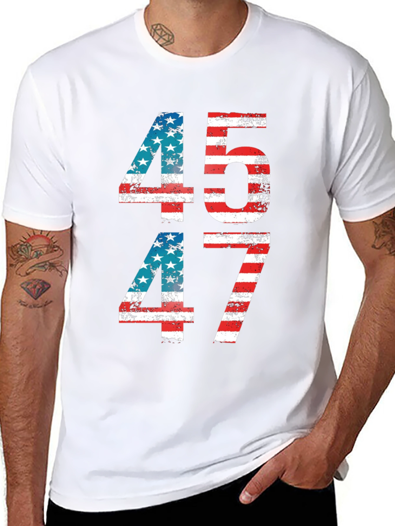 Show your patriotic spirit with this unique graphic t-shirt. The design features the numbers '45' and '47' with an American flag fill, combining stars and stripes in a distressed, vintage style. This short-sleeved shirt is made of a comfortable, black fabric. The regular fit and classic crew neck make it versatile for casual wear. Wear it to show your love for the USA, at rallies, or on any day you want to express your patriotism. A bold statement piece that blends style with national pride.