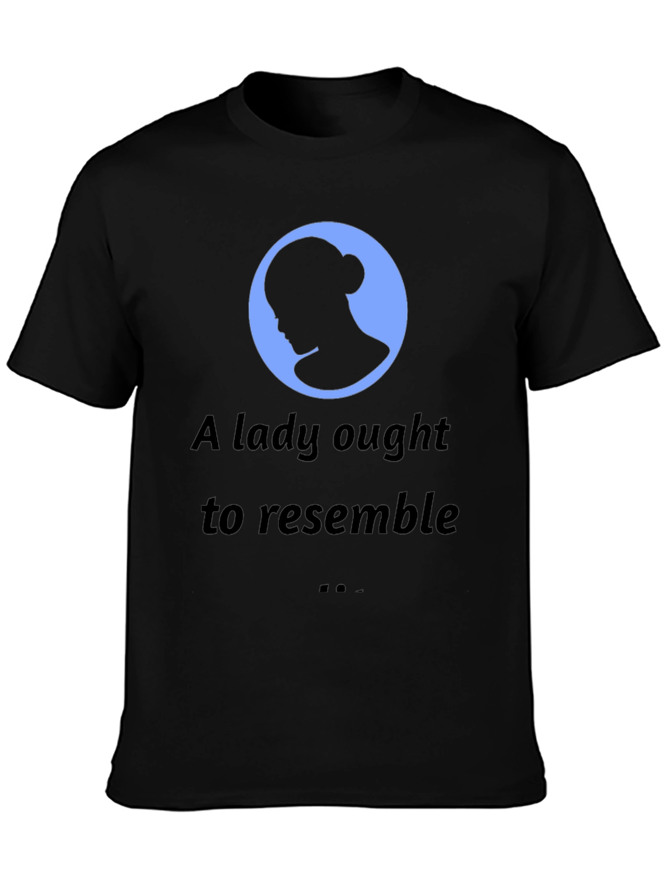 Show off your unique style with this classic black T-shirt! Featuring a striking graphic print of a woman's silhouette in a light blue circle, accompanied by the bold phrase "A lady ought to resemble...", this shirt is a statement piece. The soft fabric ensures all-day comfort, while the classic fit makes it a versatile addition to any wardrobe. Perfect for casual outings, social gatherings, or expressing your individuality, this T-shirt is sure to spark conversations. Get yours today and make a lasting impression!