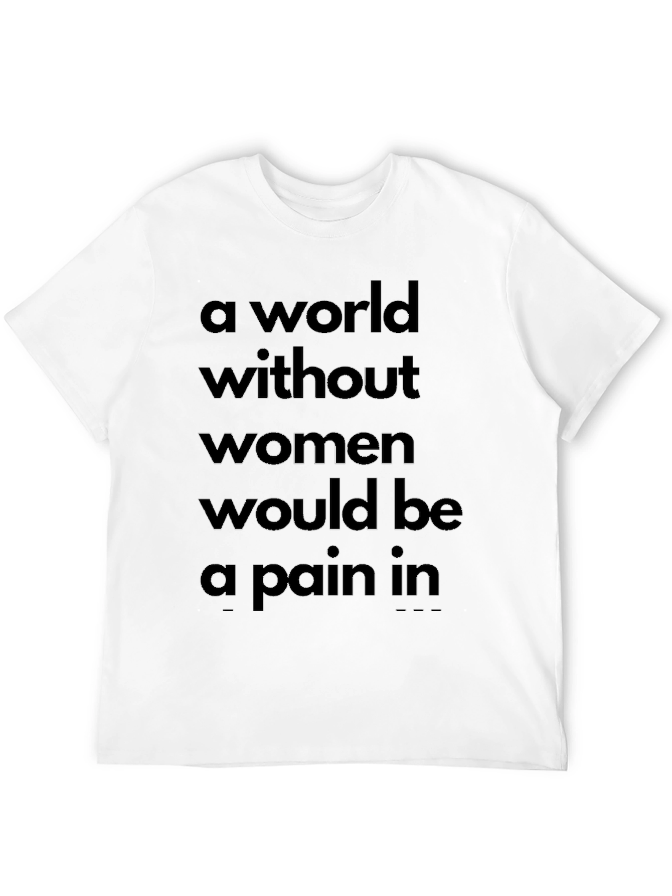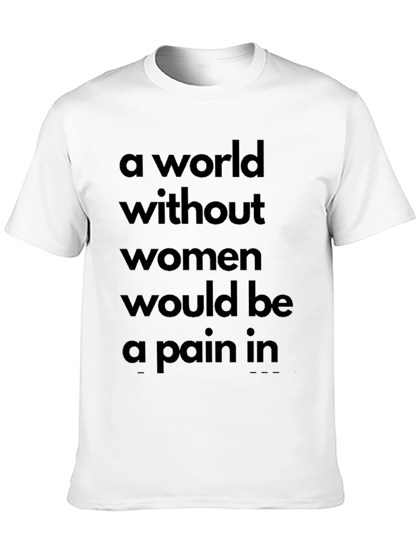 Declare your appreciation for women with this bold statement t-shirt! Featuring a black fabric, this tee showcases the saying "A world without women would be a pain in..." in a dark, prominent font across the chest. The classic crew neck and short sleeves make it a comfortable and versatile choice for everyday wear. Perfect for casual outings, social gatherings, or simply lounging at home. Show off your sense of humor and support for women with this eye-catching t-shirt. Makes a great gift for the man in your life with a witty side.