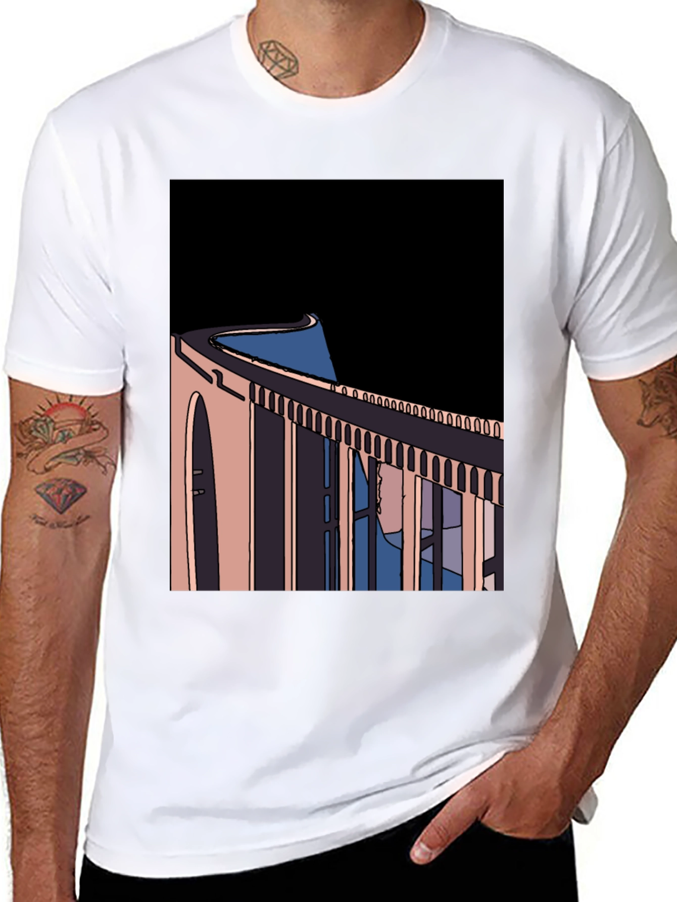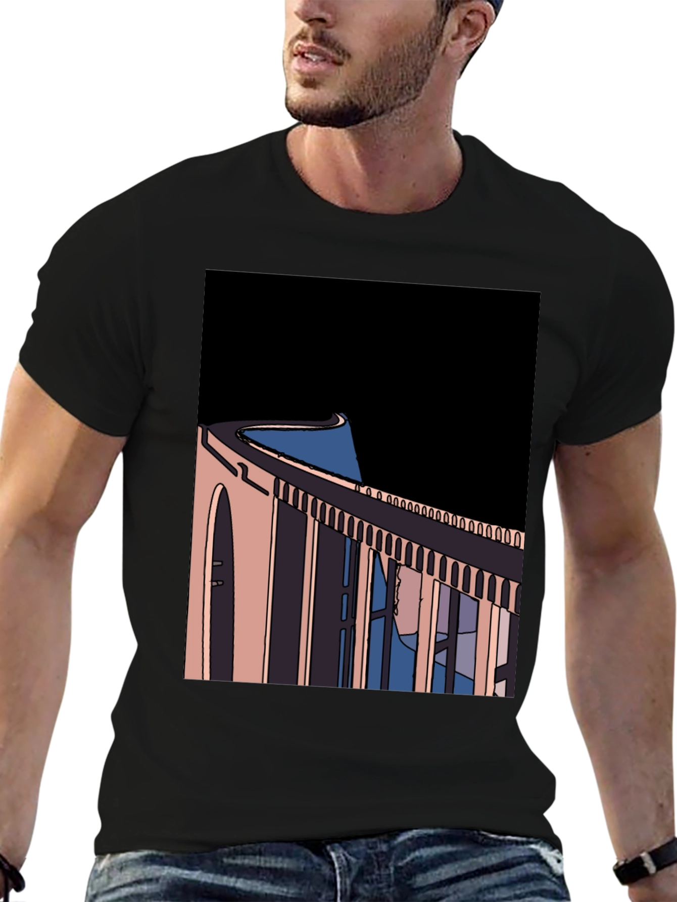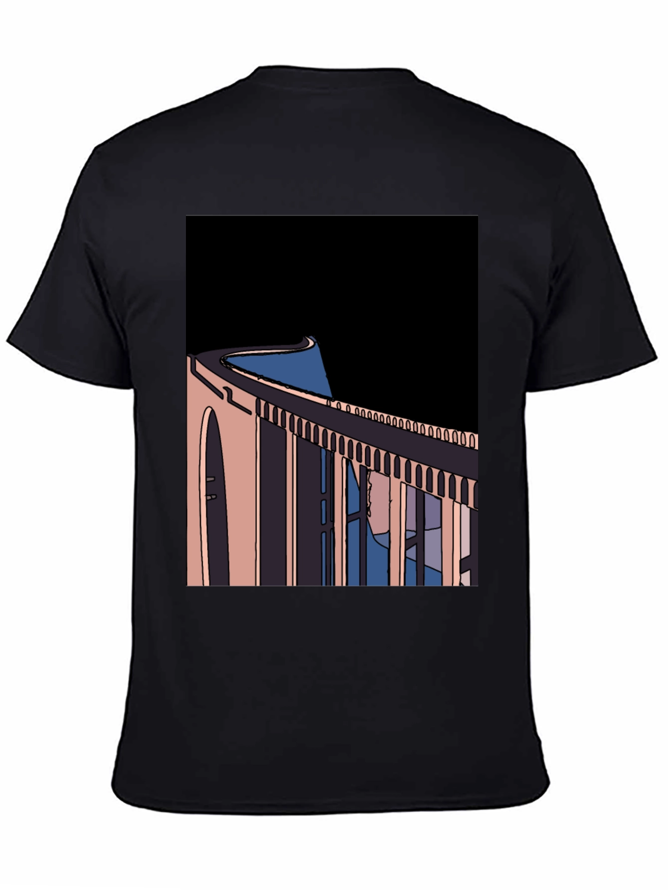 Elevate your wardrobe with this unique black graphic tee. The shirt features an eye-catching abstract design of a bridge, rendered in a modern, minimalist style with bold lines and contrasting colors. The design brings a touch of artistic flair to your everyday look. Made from comfortable, breathable fabric, this tee is perfect for casual wear. Pair it with jeans or shorts for a relaxed yet stylish outfit. This is a versatile piece for any modern individual seeking a blend of comfort and standout style.