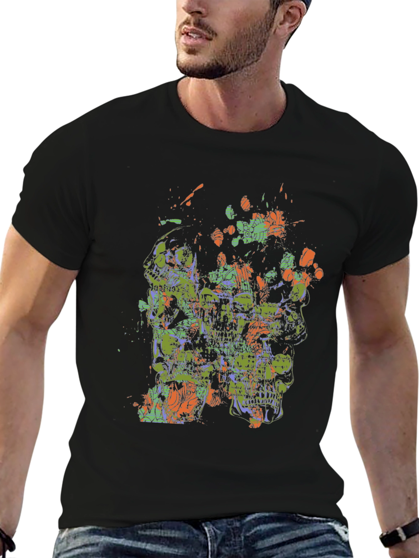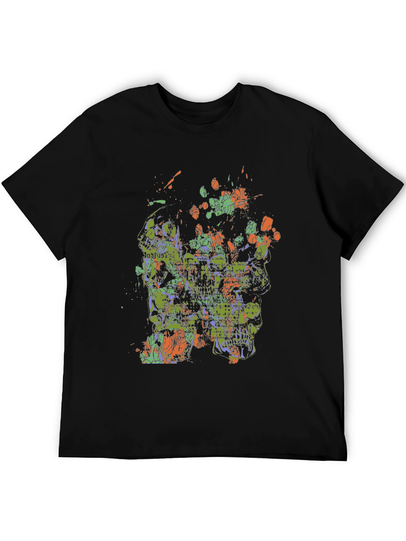 Make a statement with this eye-catching black graphic tee. Featuring an abstract skull design with vibrant green and orange accents, this shirt is perfect for expressing your unique style. The intricate graphic adds a touch of edgy sophistication. Crafted from comfortable, breathable fabric, this tee is ideal for everyday wear. Pair it with jeans or shorts for a casual yet cool look. This tee offers both style and comfort, making it a must-have addition to your wardrobe. Get ready to turn heads with this artistic and distinctive t-shirt.