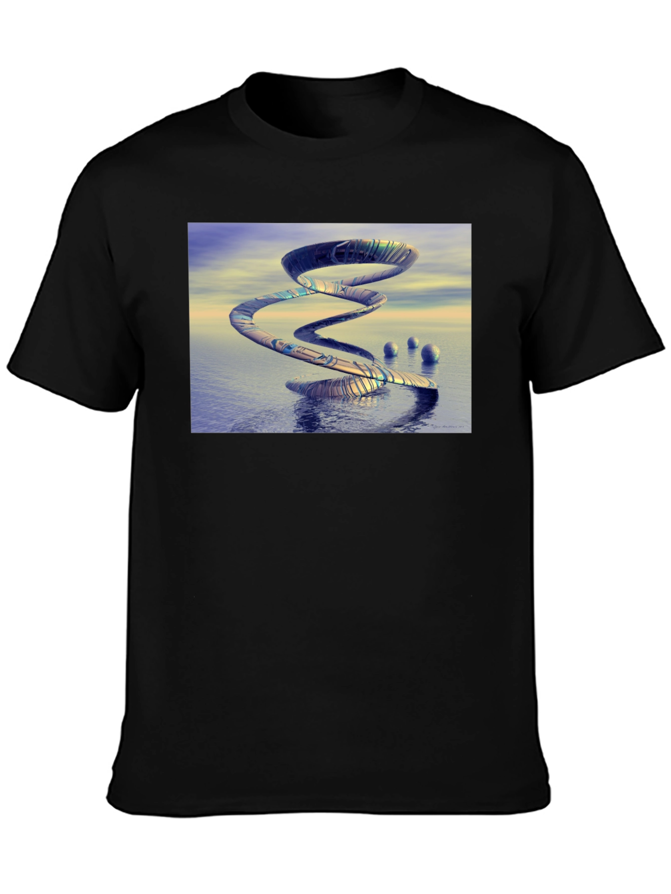 Make a statement with this eye-catching graphic t-shirt. Featuring a stunning abstract spiral design set in a surreal waterscape, this tee is sure to turn heads. The intricate pattern and calming color palette create a visually appealing and unique look. Made from a soft and breathable fabric, this shirt is comfortable enough for everyday wear. Ideal for casual outings, concerts, or simply expressing your individual style. Add this artistic piece to your wardrobe and elevate your look. This tee offers both style and comfort.