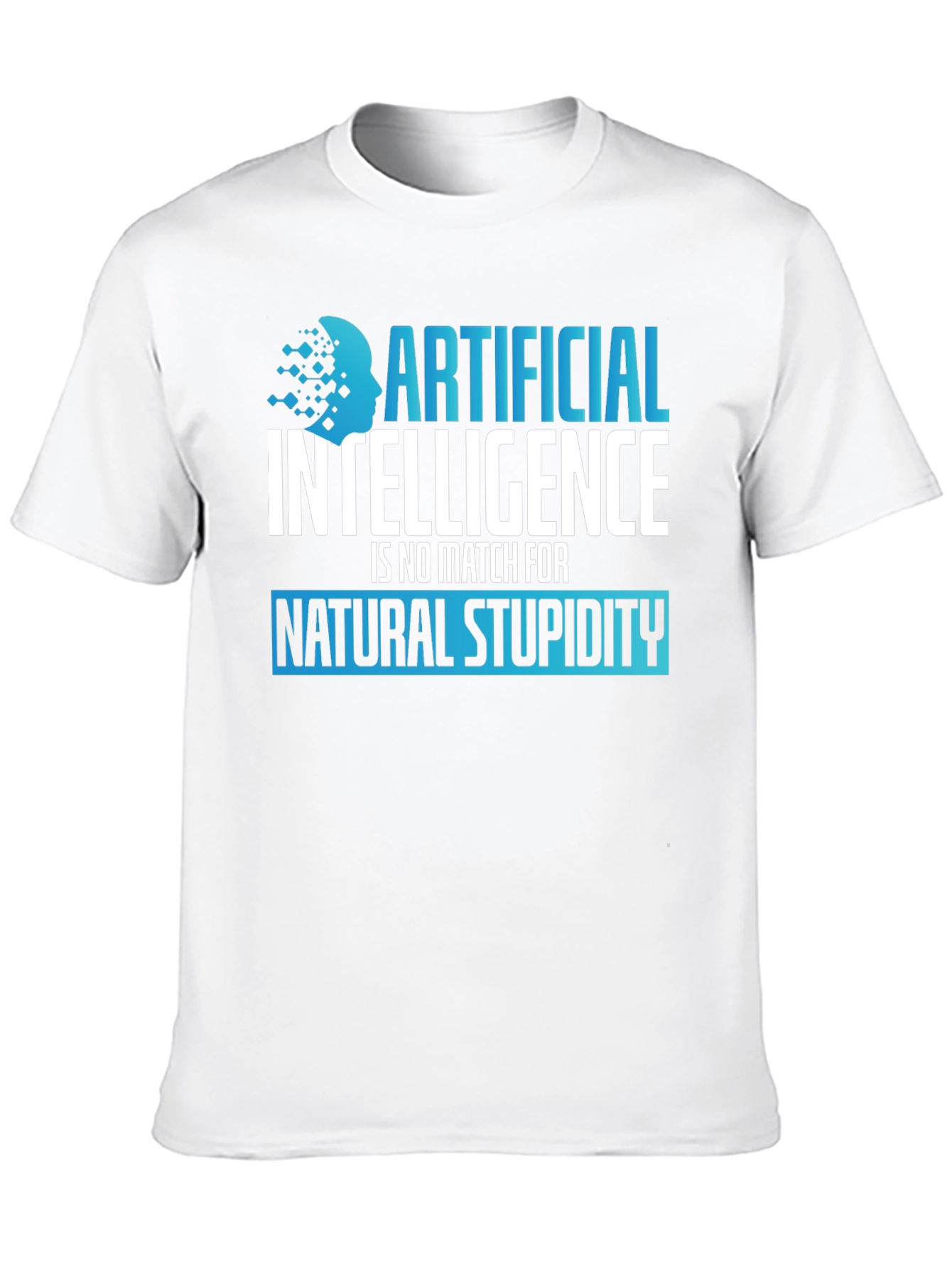 Show off your sense of humor with this black graphic t-shirt. The shirt features the text "Artificial Intelligence is no match for Natural Stupidity" in eye-catching blue and white fonts, along with a stylized AI head design. Crafted from comfortable cotton fabric, this tee is perfect for casual wear. Whether you're hanging out with friends or making a statement, this shirt is a fun and witty choice. Get yours today and let your personality shine!