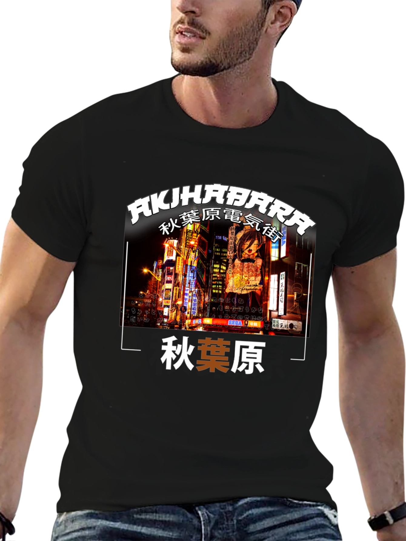 Showcase your love for Japanese culture with this eye-catching graphic tee. The black t-shirt features a vibrant print of Akihabara Electric Town at night, complete with glowing neon signs and Japanese text. Made from a comfortable fabric, this shirt is perfect for casual wear and is sure to turn heads. The design is centered, framed by graphic lines, and printed sharply on the garment. Wear it to conventions, outings with friends, or as a statement piece in your everyday wardrobe. The unique design captures the essence of Akihabara's electric atmosphere.