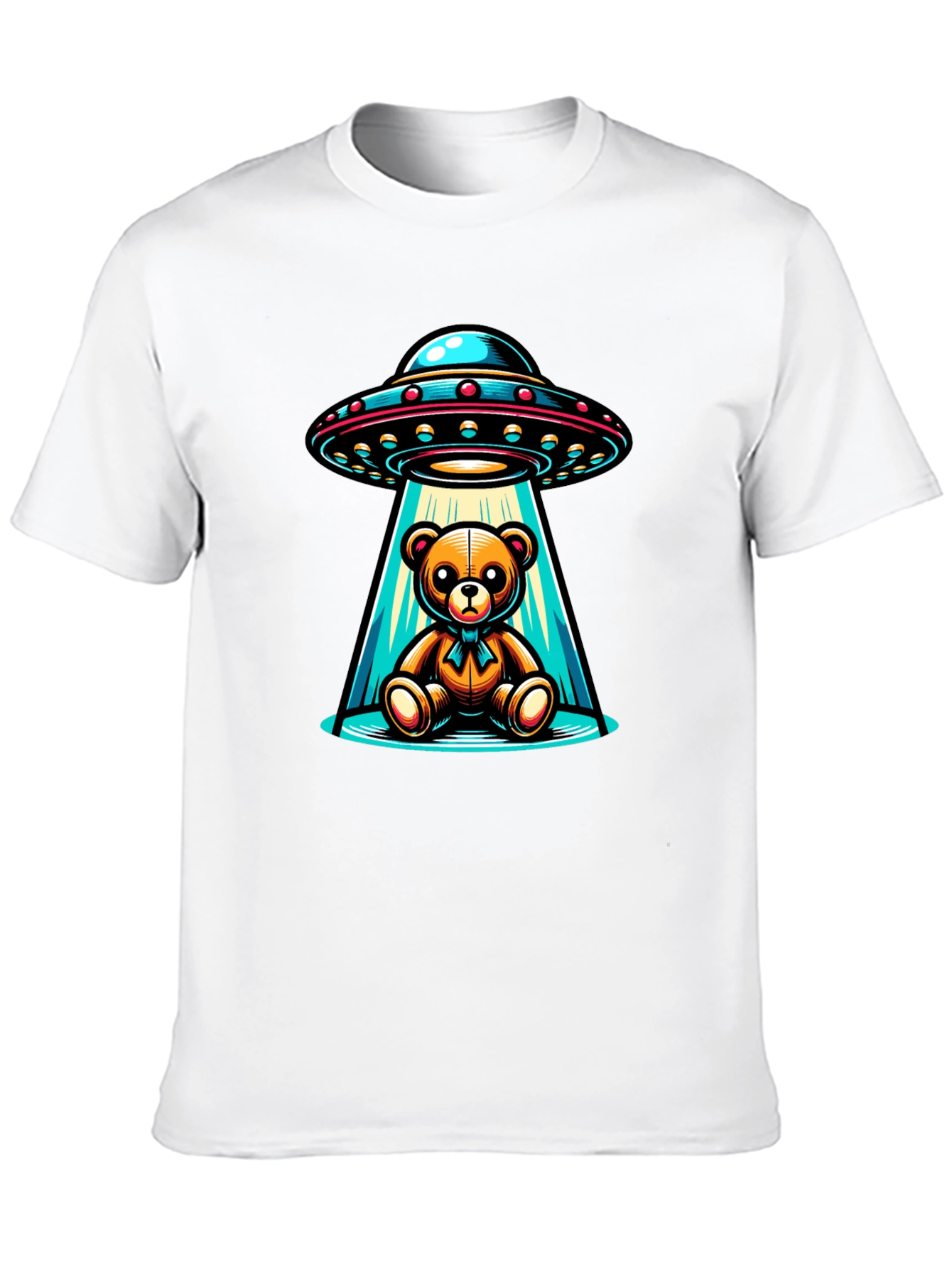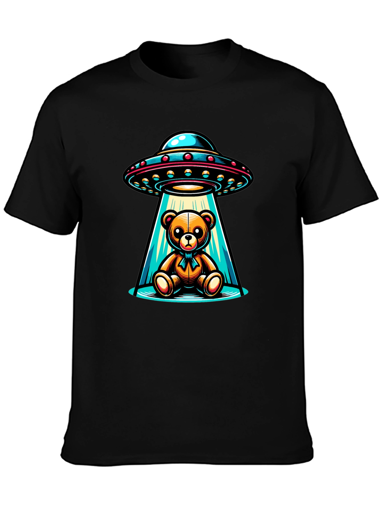 This unique black t-shirt features a captivating graphic of a teddy bear being abducted by a UFO. The vibrant design showcases a classic flying saucer with a beam of light enveloping the teddy bear, creating a playful yet intriguing image. Made from comfortable materials, this shirt is perfect for casual wear, adding a touch of whimsy to any outfit. Ideal for those who love quirky and eye-catching designs, this t-shirt is sure to be a conversation starter. Whether you're a fan of sci-fi, teddy bears, or just unique apparel, this t-shirt is a fun and stylish choice.