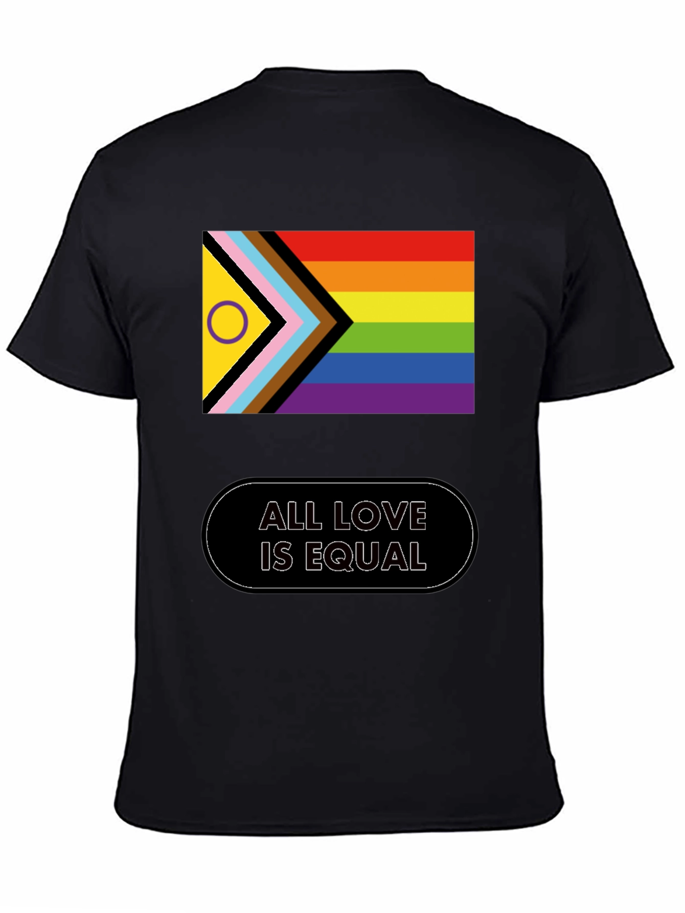 Show your support with this "All Love Is Equal" T-shirt. Made from a comfortable, breathable fabric, this classic tee features the progress pride flag design prominently displayed on the chest. The vibrant colors of the flag are sure to catch the eye and spark conversation. Perfect for pride events, rallies, or everyday wear. This shirt allows you to express your values and make a statement. Available in various sizes, it's a great way to spread awareness and show solidarity. Get yours today!