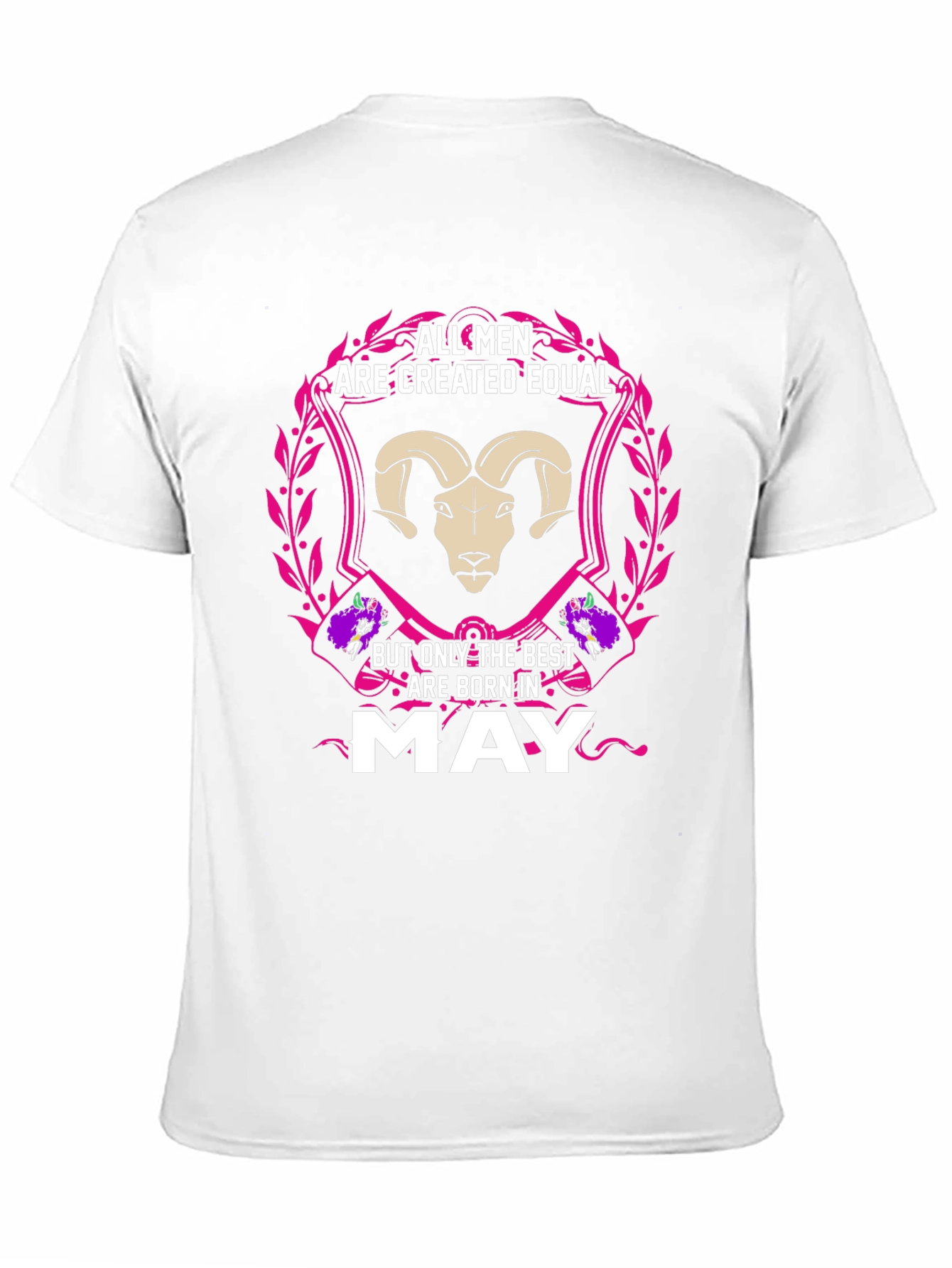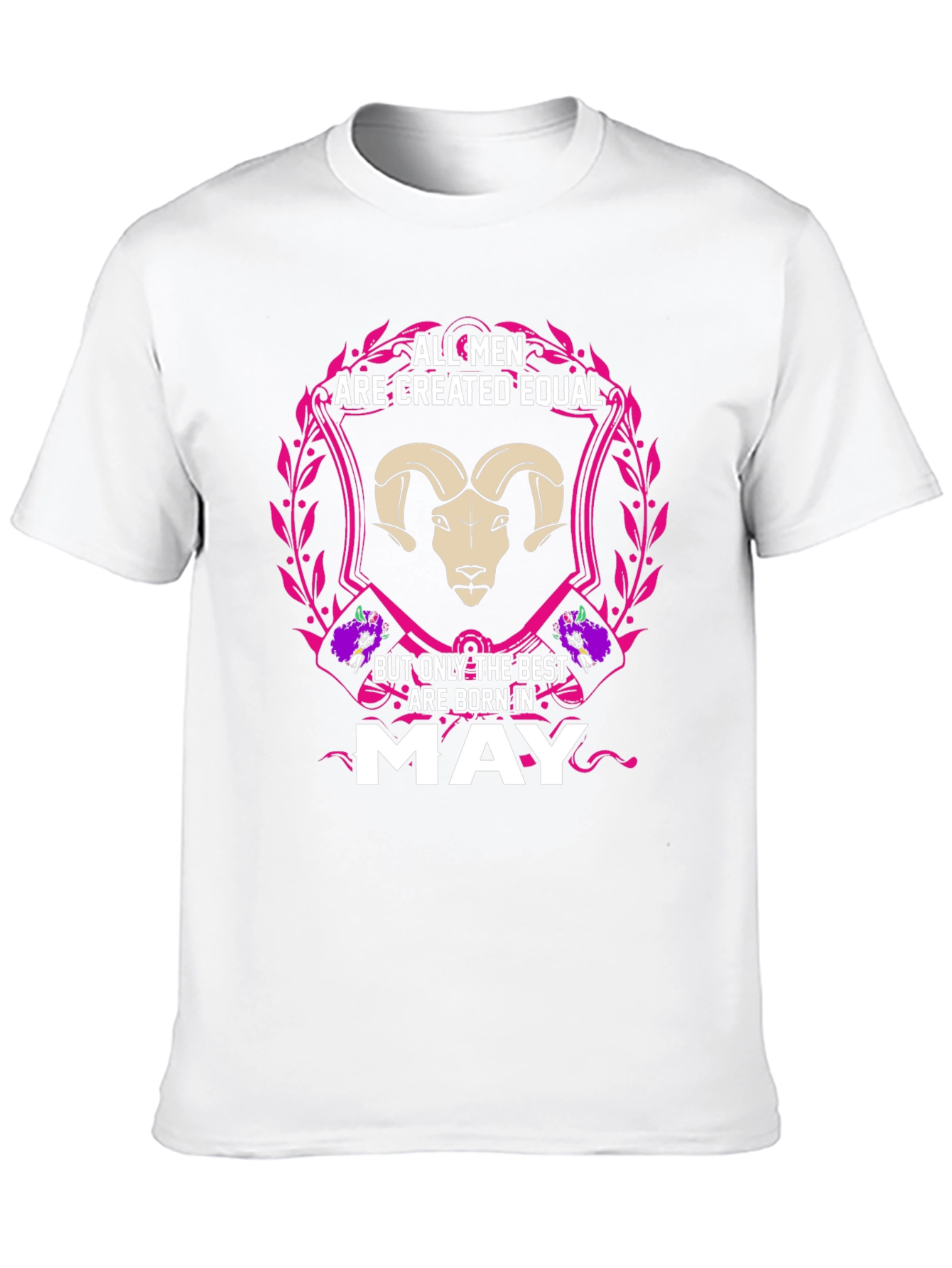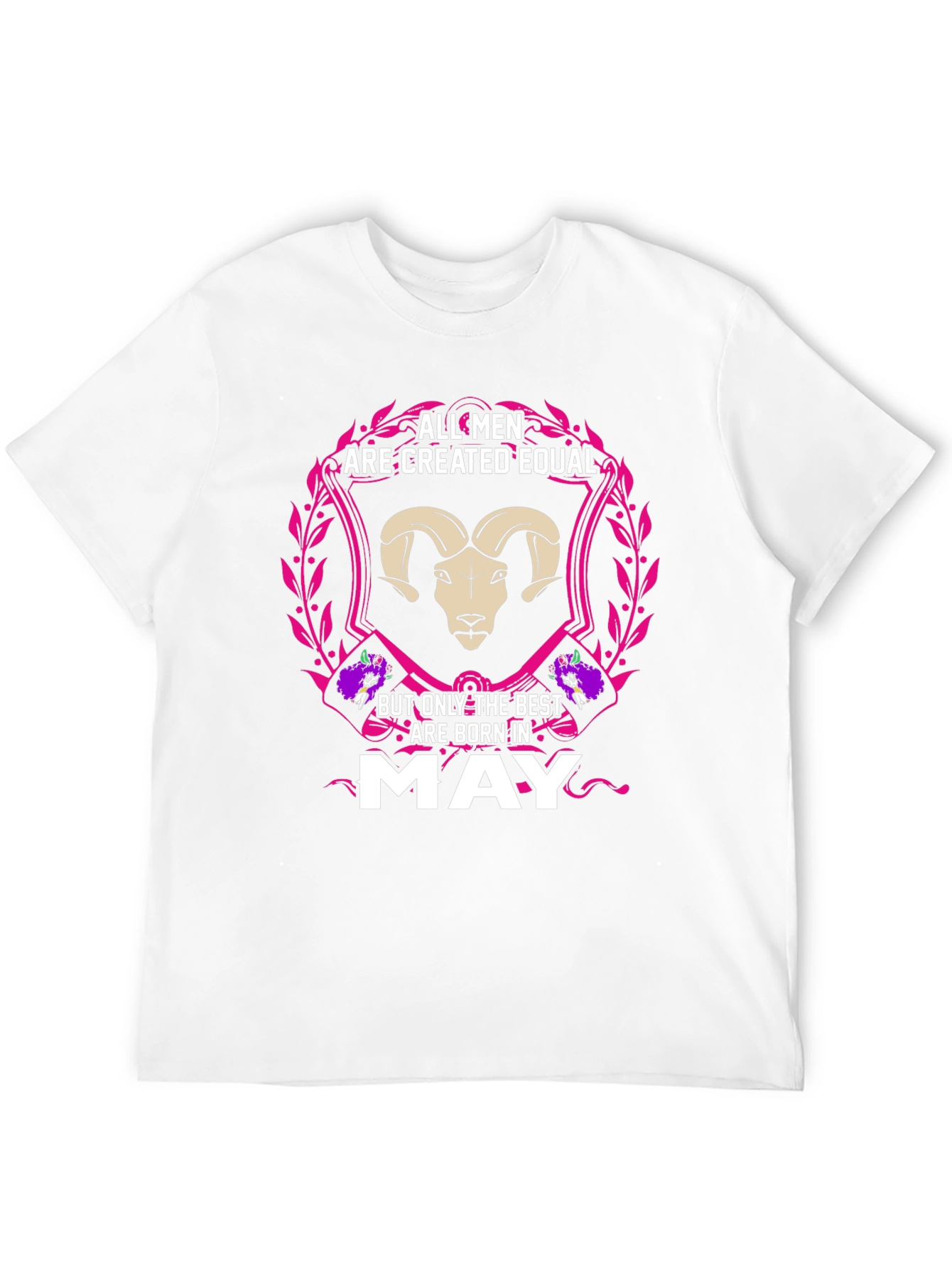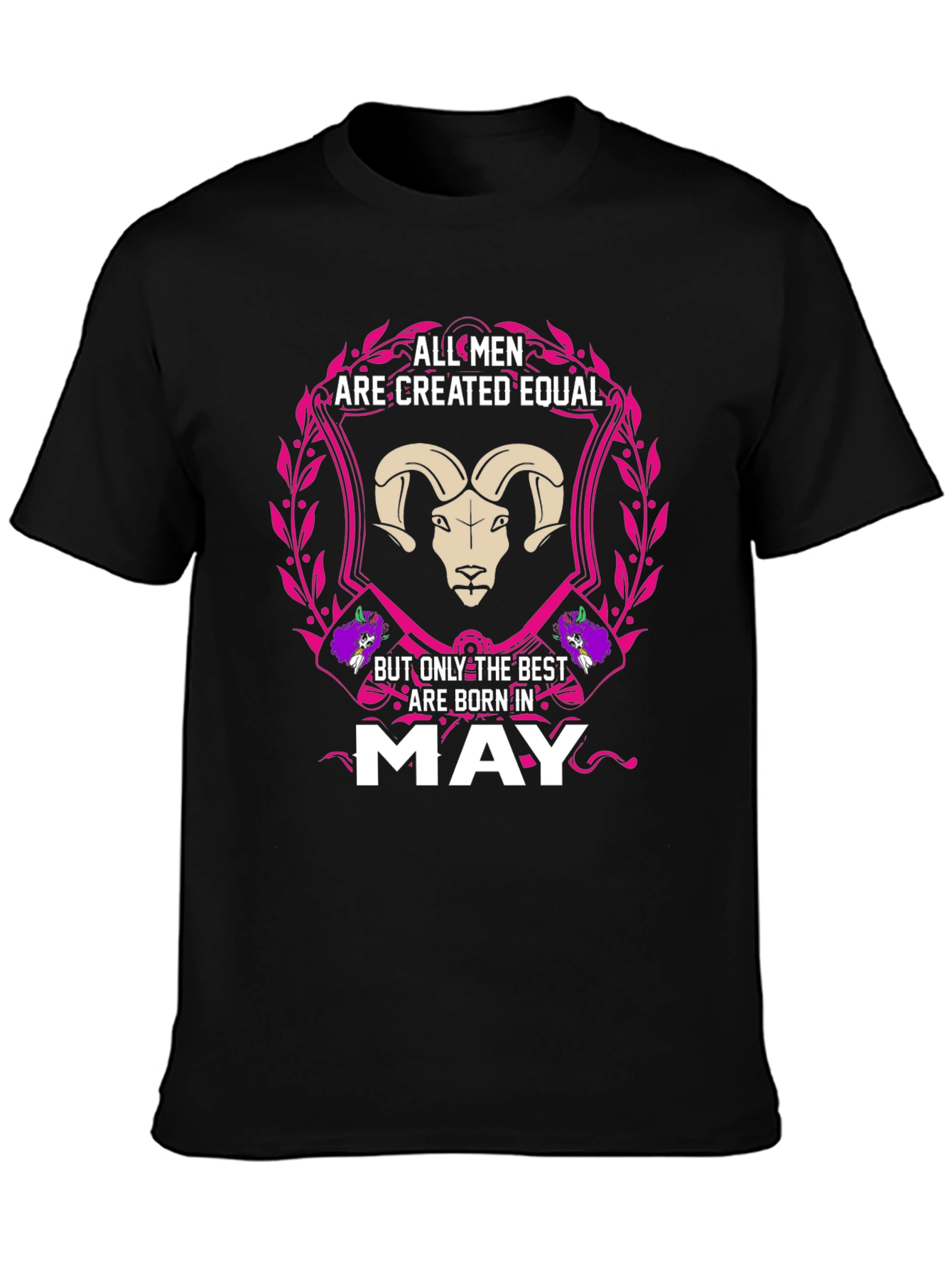 Celebrate your May birthday with this unique and stylish black t-shirt. Featuring a bold graphic design with the text "ALL MEN ARE CREATED EQUAL, BUT ONLY THE BEST ARE BORN IN MAY," this tee makes a statement. The central ram emblem, framed by a decorative pink floral wreath and shield, adds a touch of flair. Perfect for casual wear, birthday celebrations, or as a gift for the special man in your life who was born in May. Made from comfortable materials, this t-shirt offers a great fit and lasting durability.