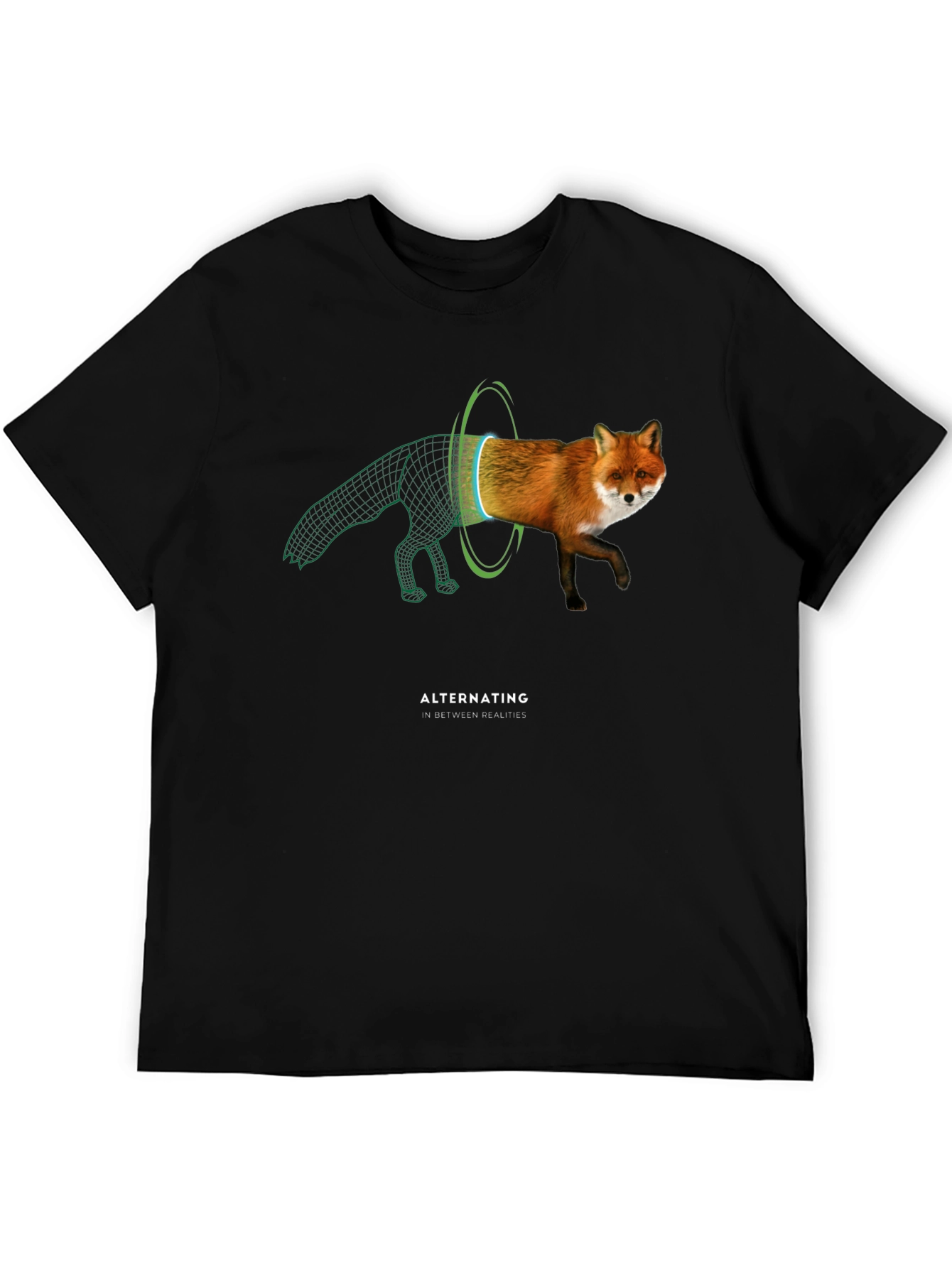 Step into a world where reality blends with the digital with this unique graphic tee. The design features a fox striding through a portal, transitioning between its physical form and a wireframe rendering. The shirt is made from a soft, breathable black fabric, ensuring all-day comfort and style. The bold graphic makes it a great conversation starter, while the relaxed fit ensures a comfortable wear. Perfect for casual outings, or expressing your love for innovative art and tech-inspired fashion. Get ready to turn heads and make a statement with this eye-catching t-shirt. It's more than just apparel; it's a glimpse into another dimension.