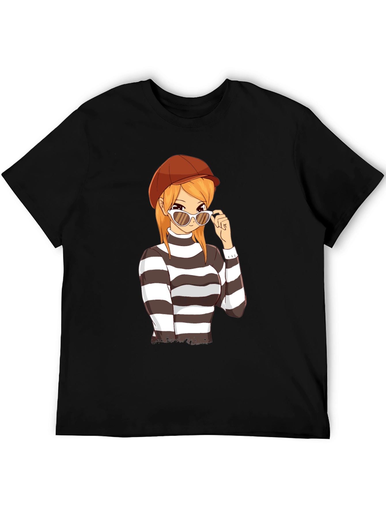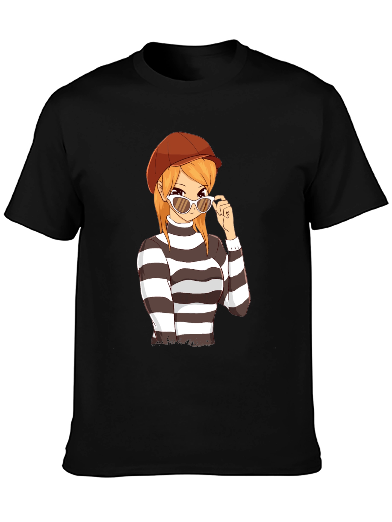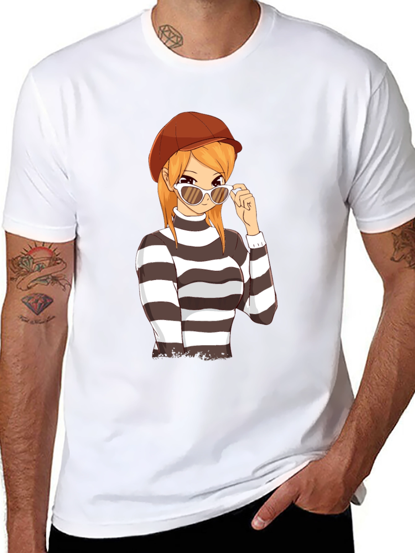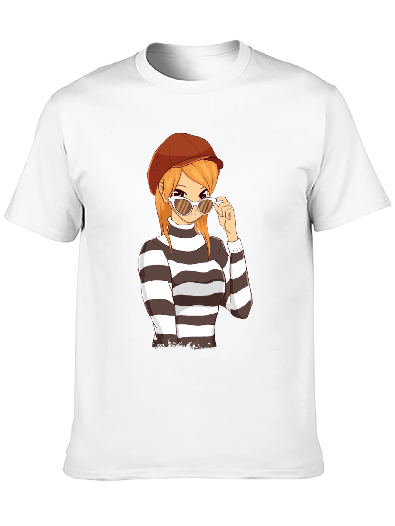 This eye-catching t-shirt features a stylish anime girl design. The girl is depicted wearing a brown and white striped turtleneck sweater and a brown beret. She has on white sunglasses. The artwork is prominently displayed on the front of the shirt. The shirt itself appears to be made of a soft, comfortable material, perfect for casual wear. This t-shirt is a fun and unique way to express your personality and interests. Wear it to your next anime convention or style it into your everyday wardrobe. A unique way to spice up any outfit!