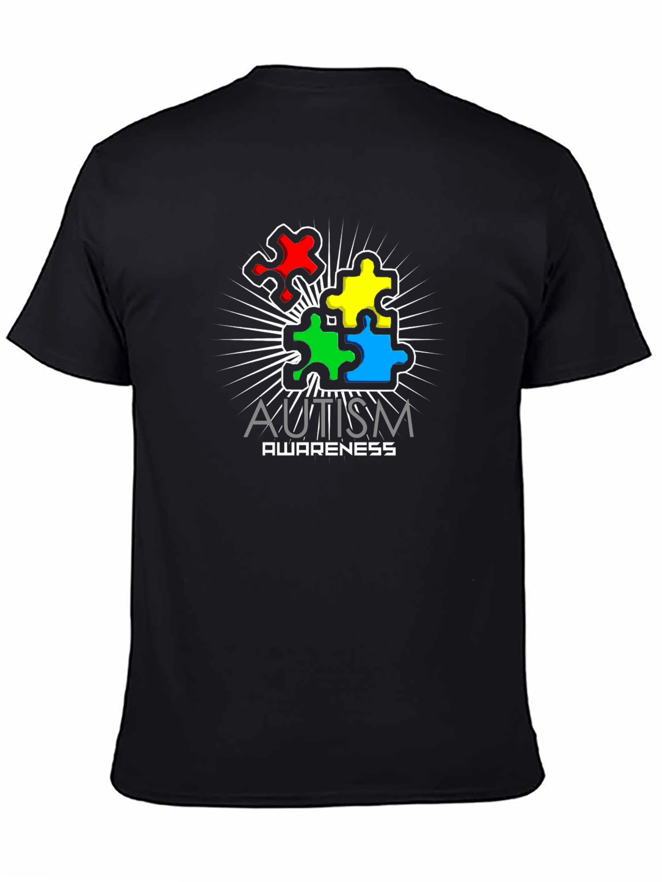 Show your support with this Autism Awareness T-shirt! This classic black tee features a vibrant design of four puzzle pieces �red, yellow, green, and blue �symbolizing the complexity and diversity of autism. The design is set against a radiating burst, accompanied by the words "Autism Awareness." Made from what appears to be a comfortable, breathable fabric, this T-shirt is perfect for everyday wear and advocacy events. Let your clothing make a statement and spread awareness with this stylish and meaningful shirt. A great conversation starter to promote understanding and acceptance!