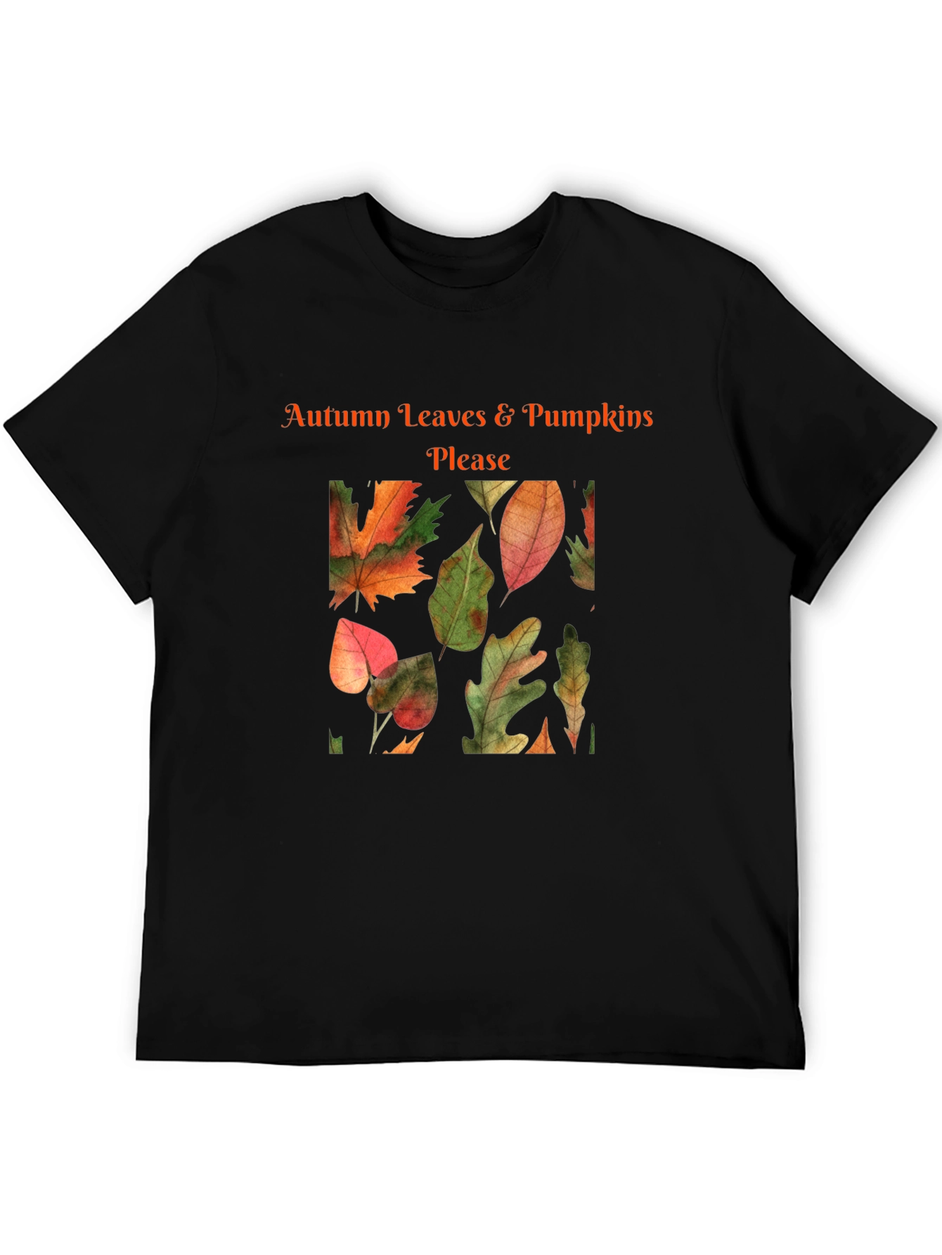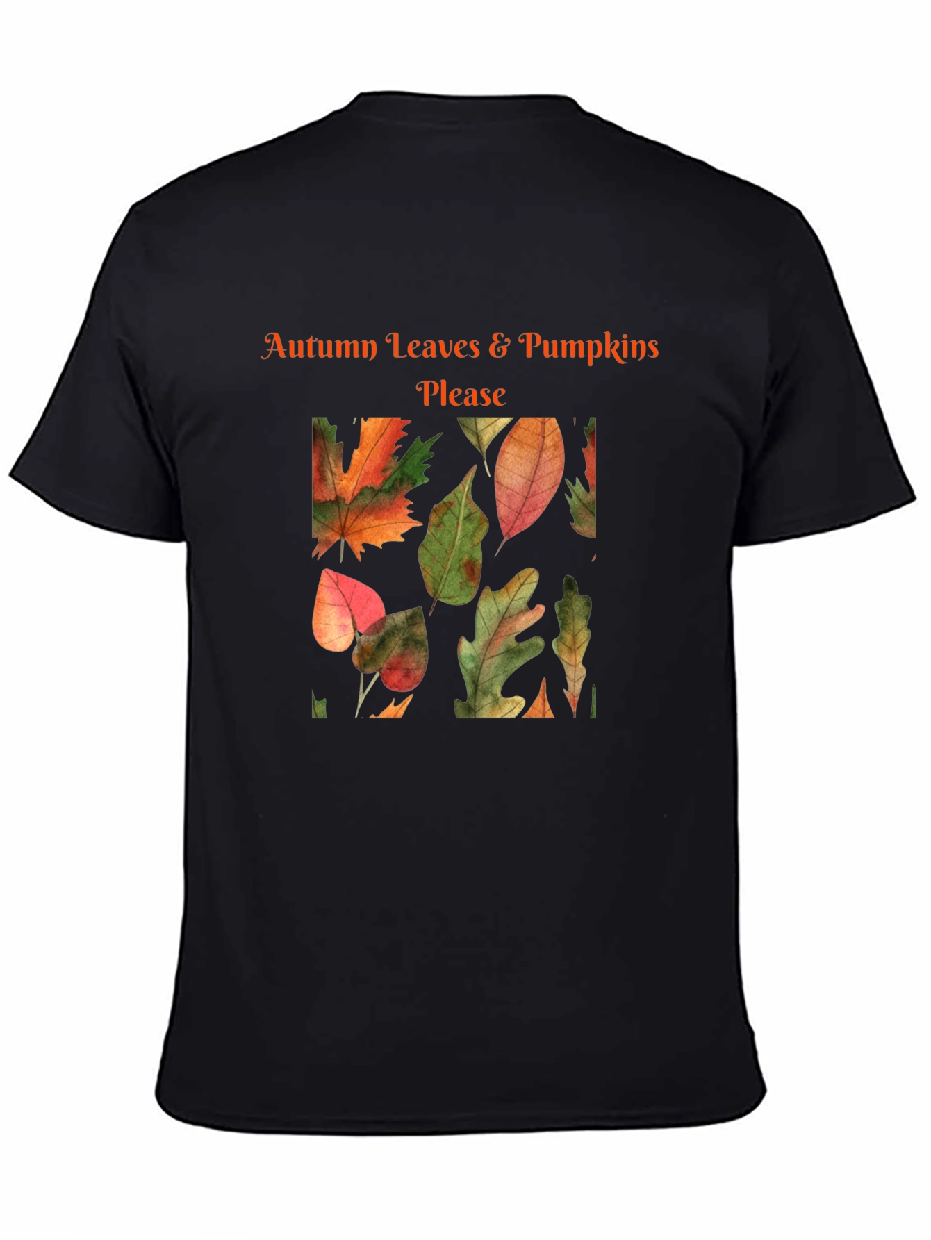 Embrace the fall season with this stylish black t-shirt featuring a vibrant autumn leaves design. The phrase "Autumn Leaves & Pumpkins Please" is printed above a colorful collage of orange, red, and green fall foliage. Made from comfortable, breathable fabric, this tee is perfect for everyday wear. Show off your love for autumn with this unique and eye-catching shirt. Great for pumpkin patch visits, cozy evenings, or casual fall outings. Get yours today and celebrate the season in style!