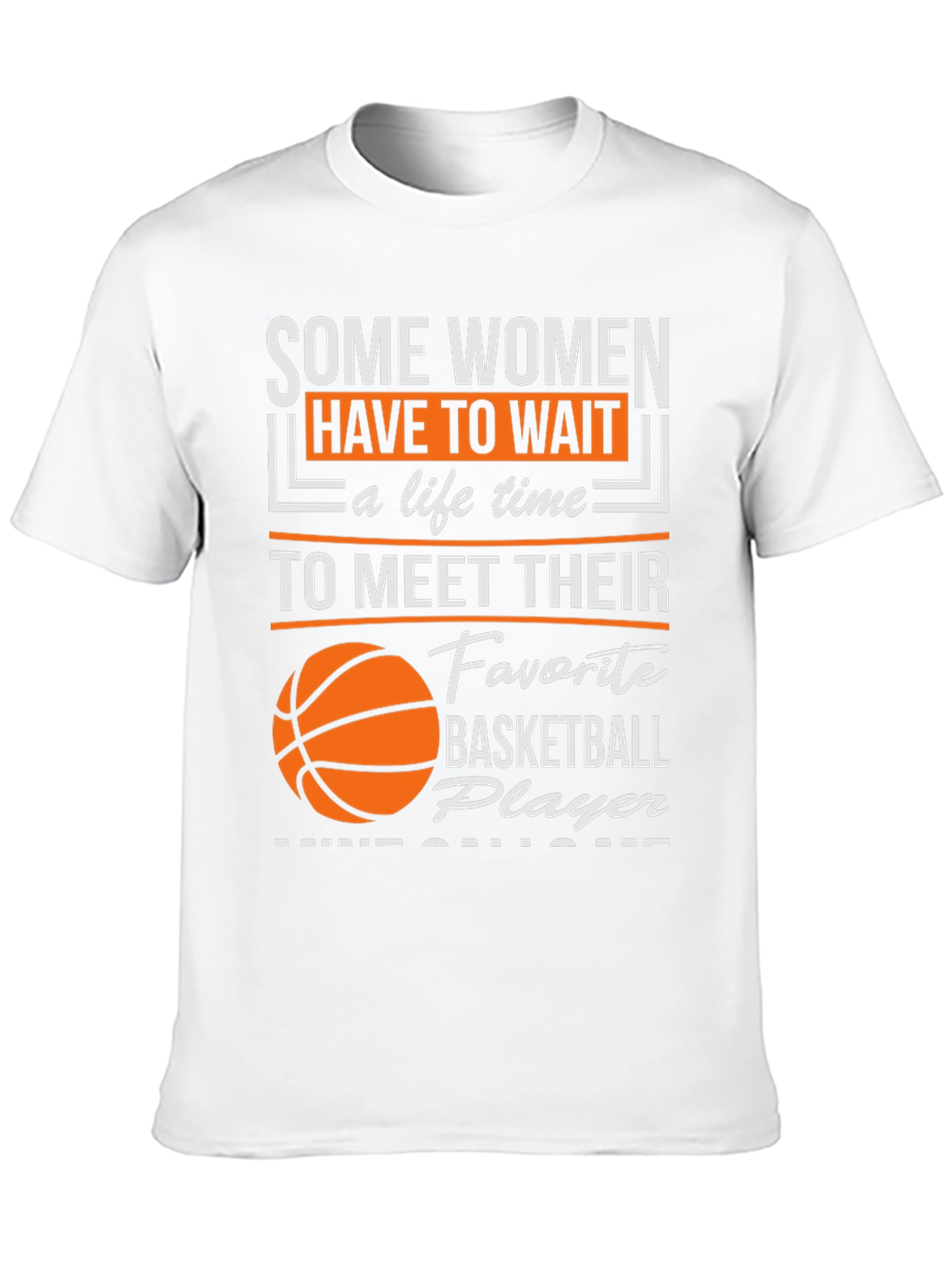 This black t-shirt is perfect for the basketball mom or girlfriend. The shirt features a humorous saying in white and orange lettering with a basketball graphic. 'Some women have to wait a life time to meet their favorite basketball player...mine calls me...' is displayed on the front. This classic tee is ideal for casual wear, games, practices, or any day you want to show off your love for your basketball star! Made from a soft and comfortable material, it's a great gift for any proud mom or loved one.