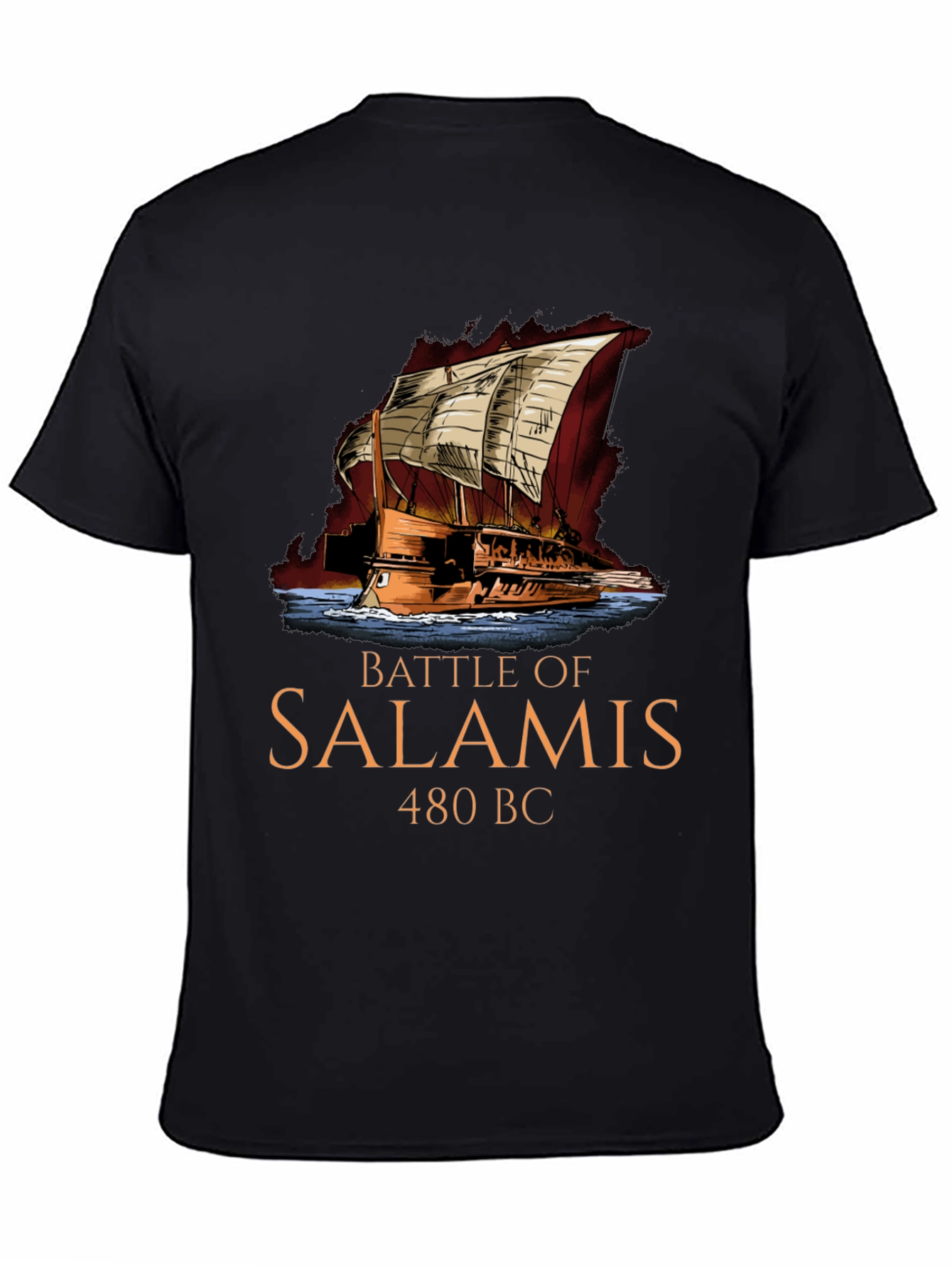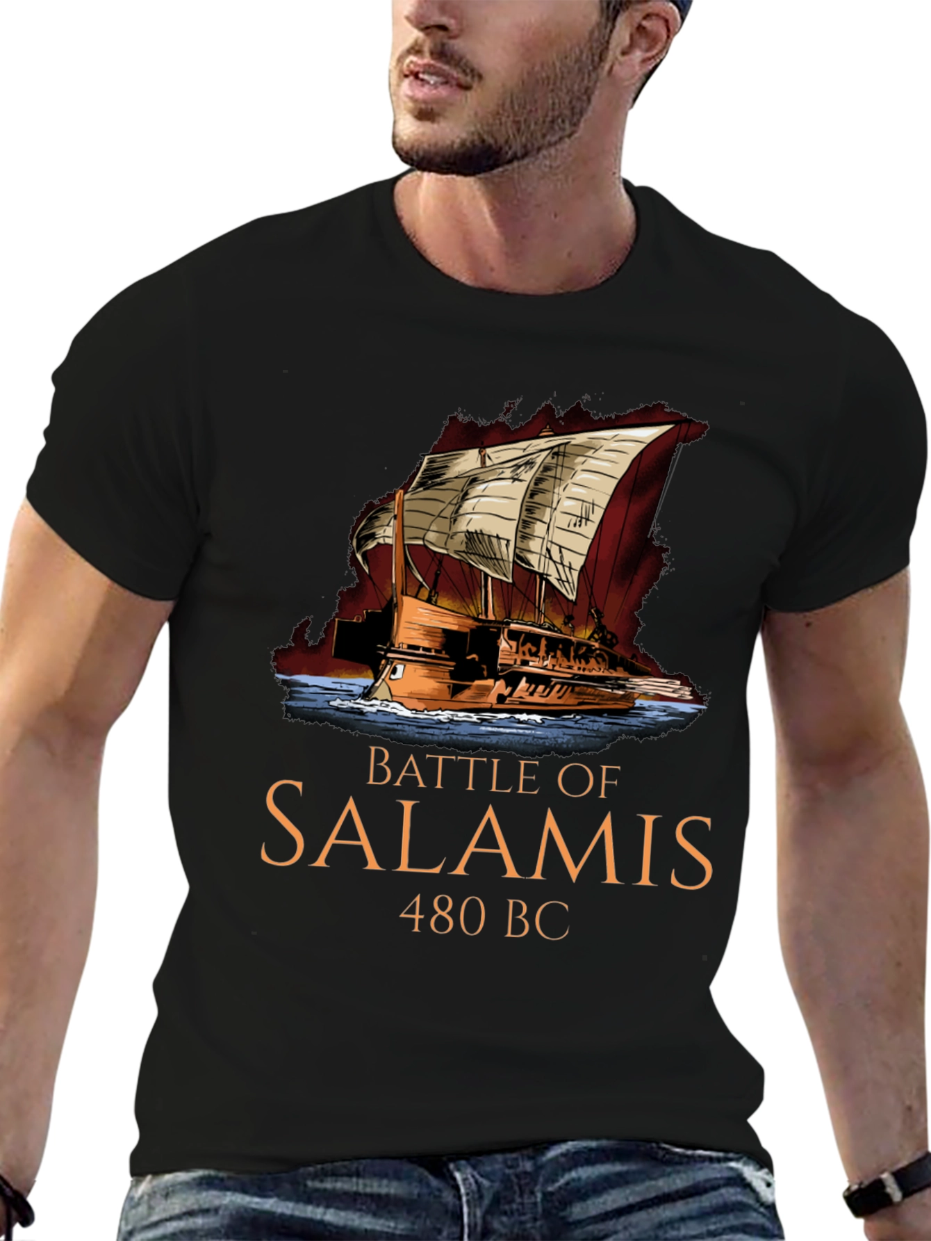This unique t-shirt commemorates the epic Battle of Salamis in 480 BC. The design features a detailed illustration of an ancient Greek warship, set against a dramatic backdrop. The text "Battle of Salamis" and "480 BC" are emblazoned below the ship in an eye-catching font. Made from a soft, breathable fabric, this shirt is both comfortable and stylish. Perfect for history buffs, maritime enthusiasts, or anyone who appreciates a bold and unique design. Wear it to historical events, casual outings, or as a statement piece in your everyday wardrobe. Show off your love for ancient history with this distinctive t-shirt!