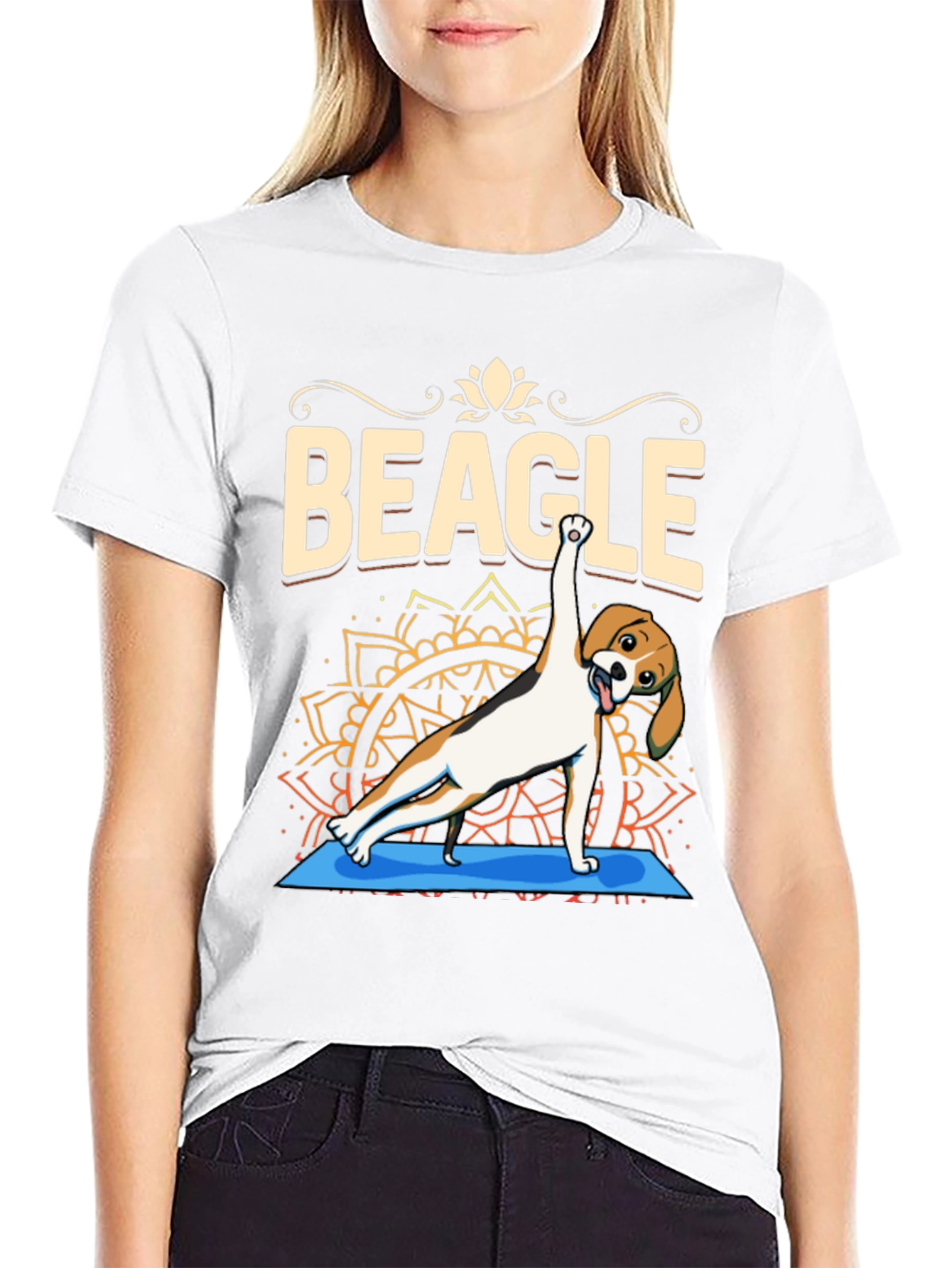 Show your love for beagles and yoga with this unique graphic t-shirt. The black tee features a playful beagle illustration in a yoga side plank pose on a blue mat. Above, the word "BEAGLE" is printed in a tan color, along with a lotus-like design. A symmetrical, orange, mandala-like pattern sits behind the beagle. This shirt is perfect for casual wear, yoga class, or dog lovers events. Made from soft, comfortable material, this eye-catching design is sure to be a conversation starter and makes a great gift for beagle owners and yoga enthusiasts alike.