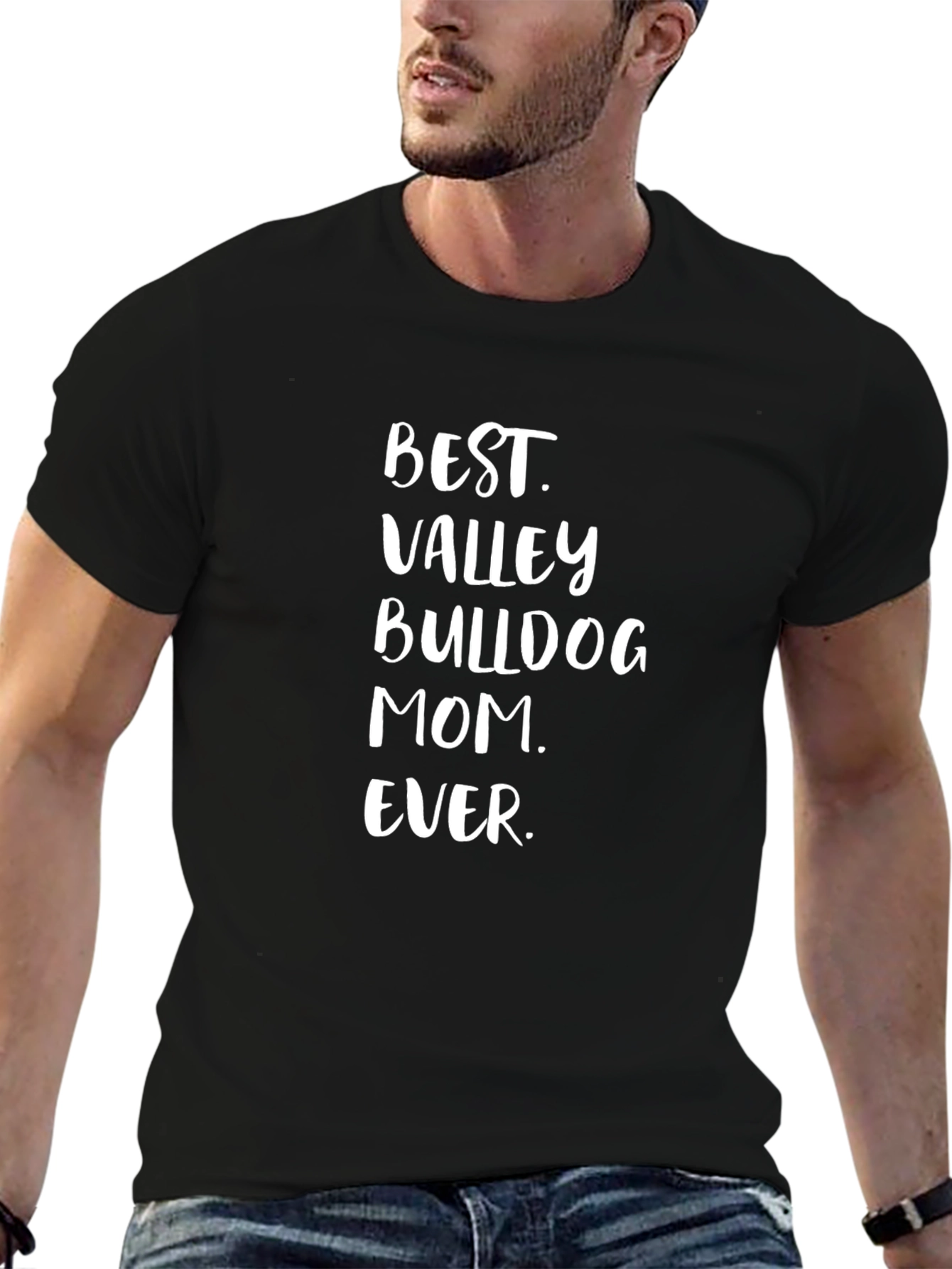 Show your love for your Valley Bulldog with this stylish and comfortable t-shirt. Made from soft, breathable fabric, this classic crew neck features the bold white print 'BEST. VALLEY BULLDOG MOM. EVER.' in a playful, stacked design. The simple design is perfect for casual wear, whether you're running errands, walking your dog, or relaxing at home. This shirt makes a great gift for the proud Bulldog mom in your life. It's a fun and fashionable way to show off her favorite dog breed.