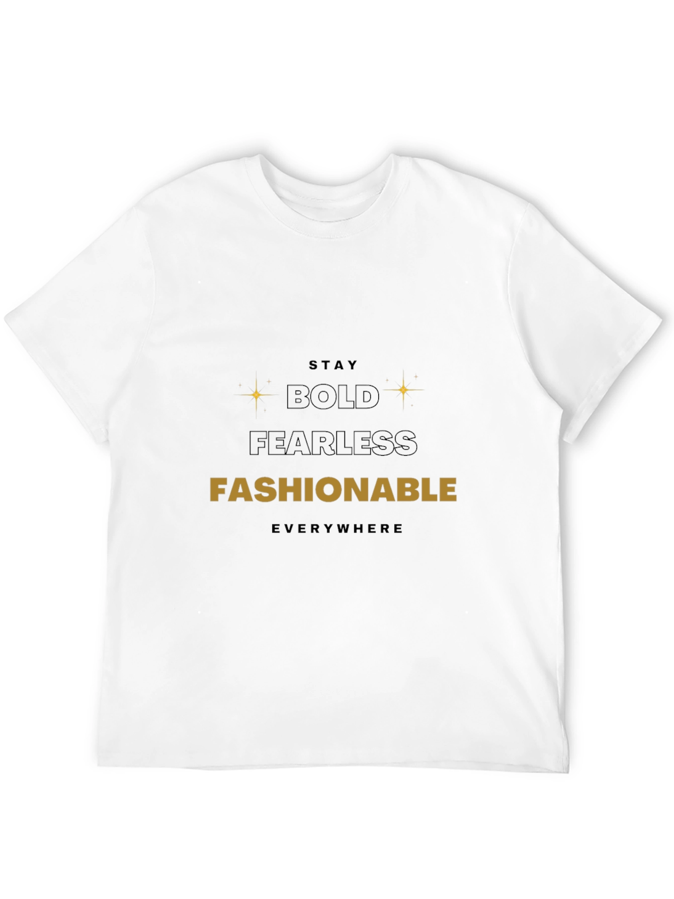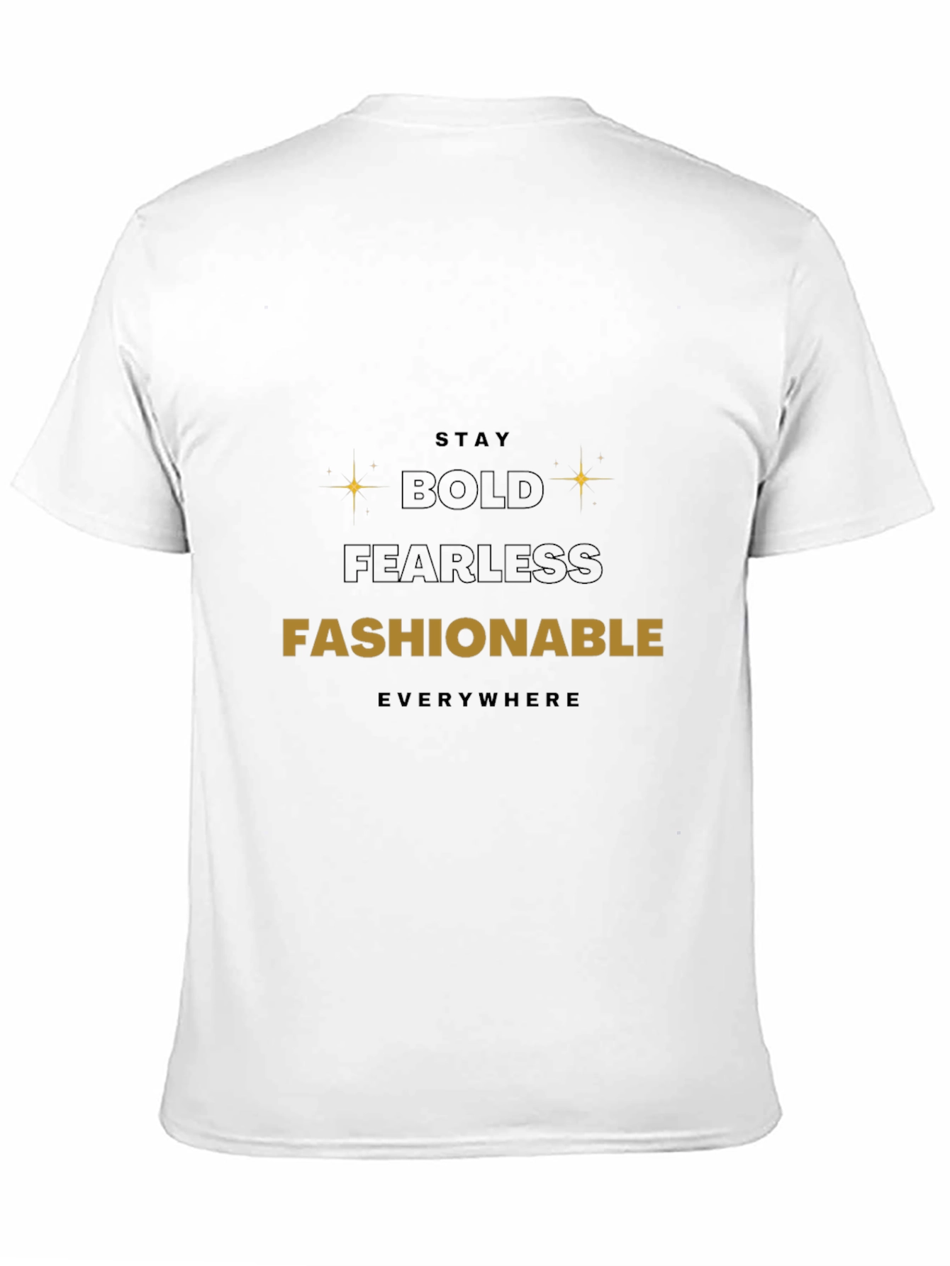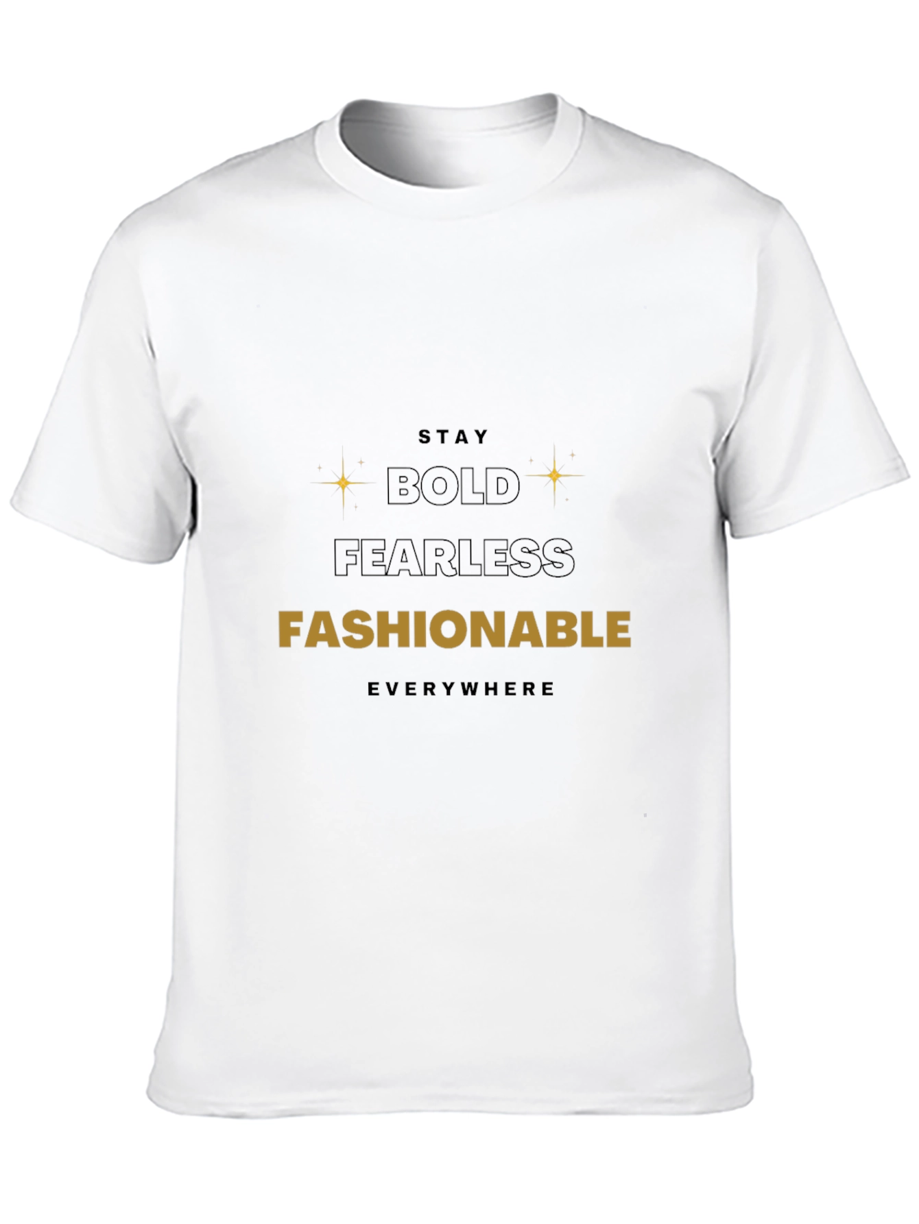 Show your fierce spirit with this stylish black t-shirt. Featuring a striking gold-toned inscription "Fashionable Everywhere", this tee boldly declares your confidence. The design also includes the words "Stay Bold Fearless". Its classic fit makes it a versatile choice for everyday wear, casual outings, or a night with friends. Whether you're hitting the town or relaxing at home, this shirt is sure to make a statement. Own your style with this wardrobe essential. Available in various sizes.
