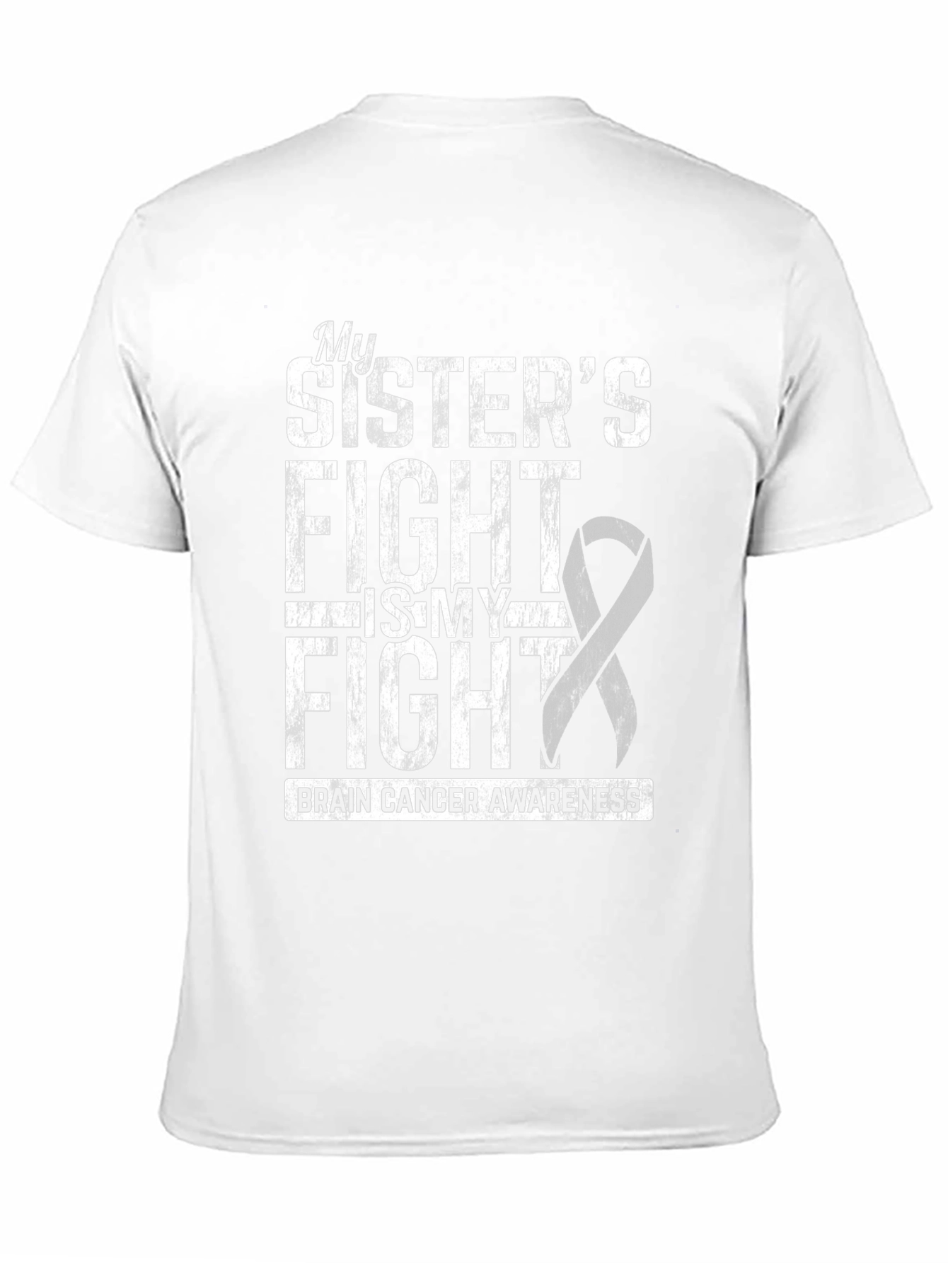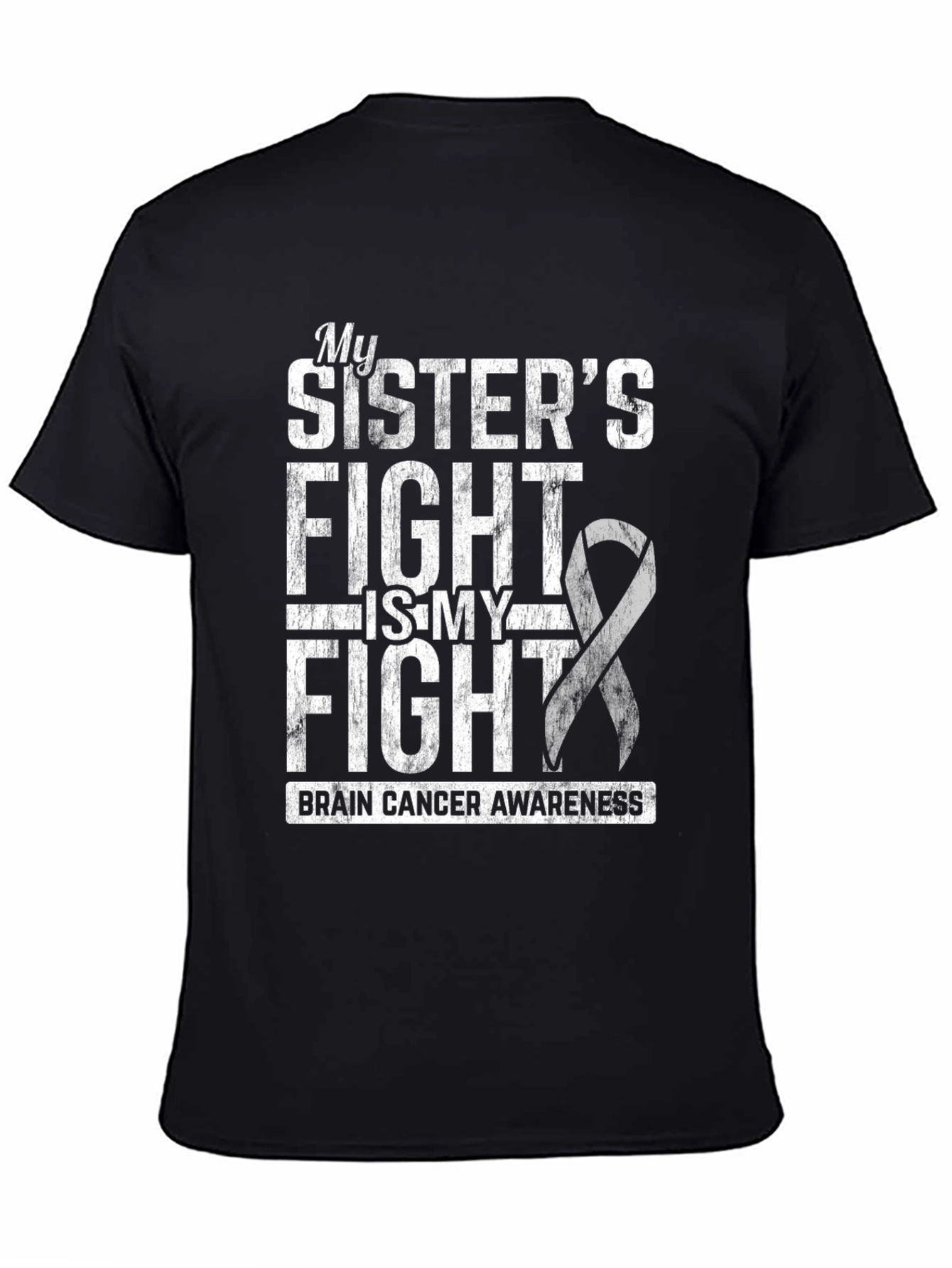 Show your support with this powerful black t-shirt. Featuring a bold white graphic that reads "My Sister's Fight is My Fight" along with a brain cancer awareness ribbon, this tee makes a statement. Ideal for walks, events, or everyday wear. A comfortable and meaningful way to raise awareness for brain cancer.