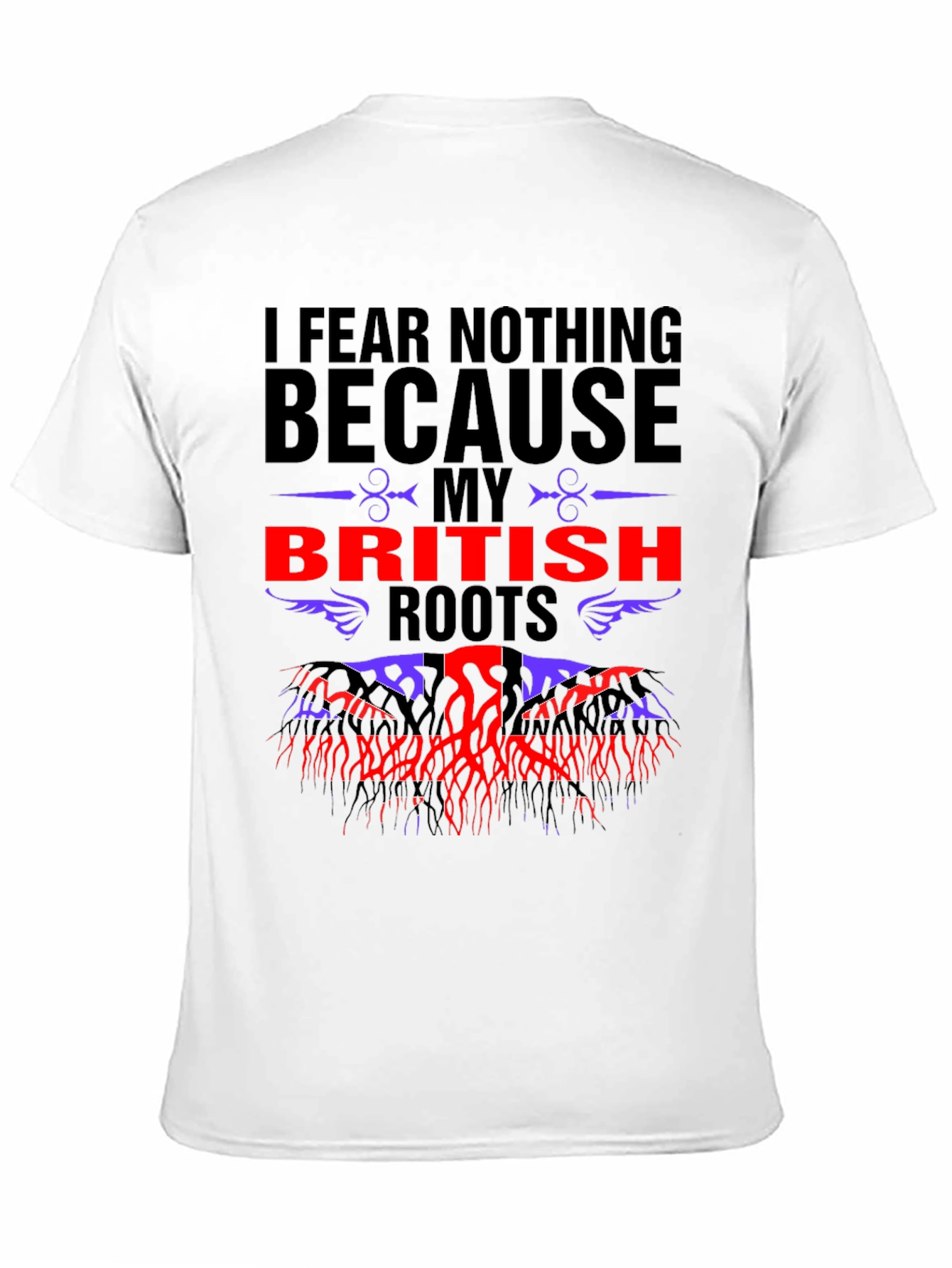 Show off your heritage with this bold "I Fear Nothing Because My British Roots" graphic tee. This eye-catching design features a stylized Union Jack flag as roots, creating a powerful visual statement. The shirt is made from a comfortable, breathable fabric, perfect for everyday wear. The vibrant graphic makes it a standout piece in any wardrobe, showcasing pride in your British heritage. Whether you're attending a cultural event, hanging out with friends, or simply want to express your identity, this tee is an excellent choice. Its unique design and powerful message will surely turn heads and spark conversations. Get yours today and celebrate your roots in style!