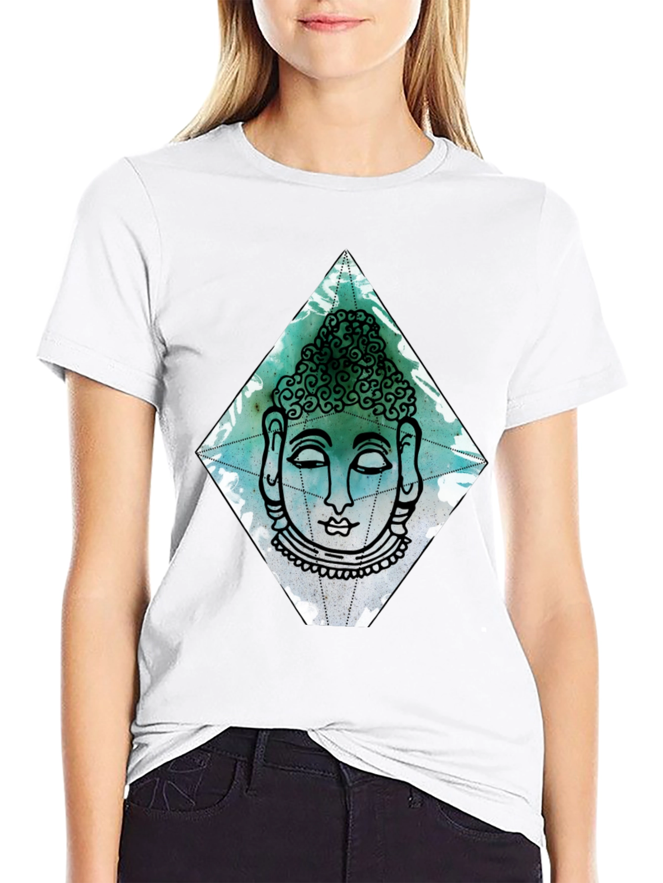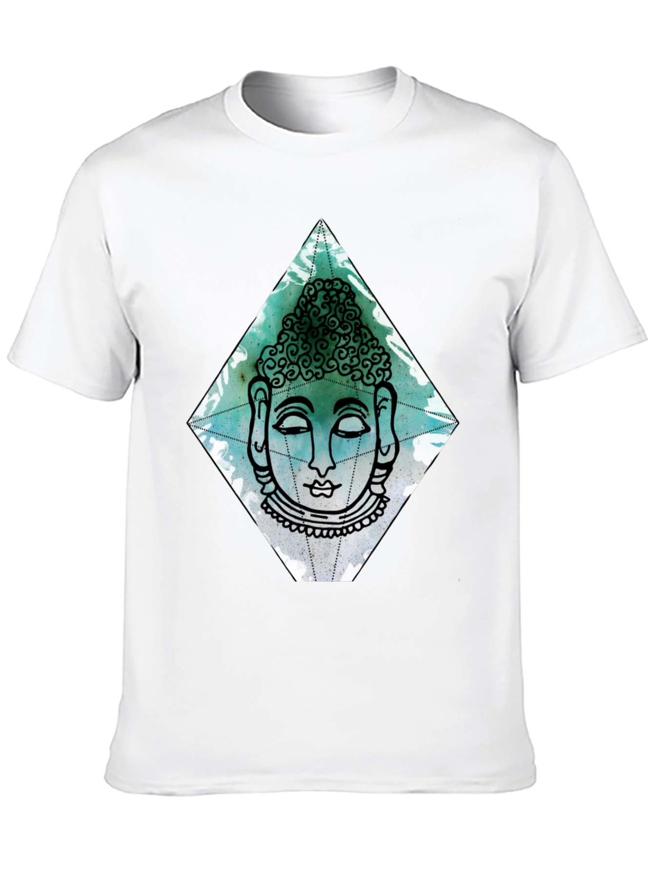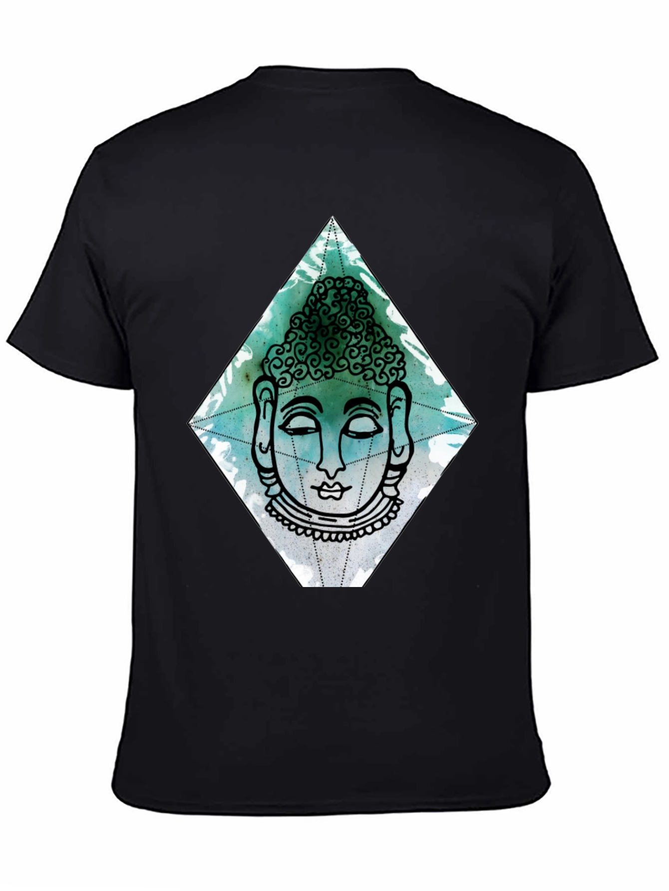 Elevate your style with this striking black t-shirt featuring a unique Buddha graphic. The design showcases a serene Buddha face within a diamond shape, rendered in artistic teal and black line art. Made from comfortable, breathable fabric, this tee is perfect for everyday wear. The eye-catching design is sure to make a statement. Whether you're meditating, hanging out with friends, or simply expressing your individuality, this tee is a great choice. A perfect addition to any wardrobe, combining comfort with mindful fashion. Get yours today and embrace a sense of calm and style!