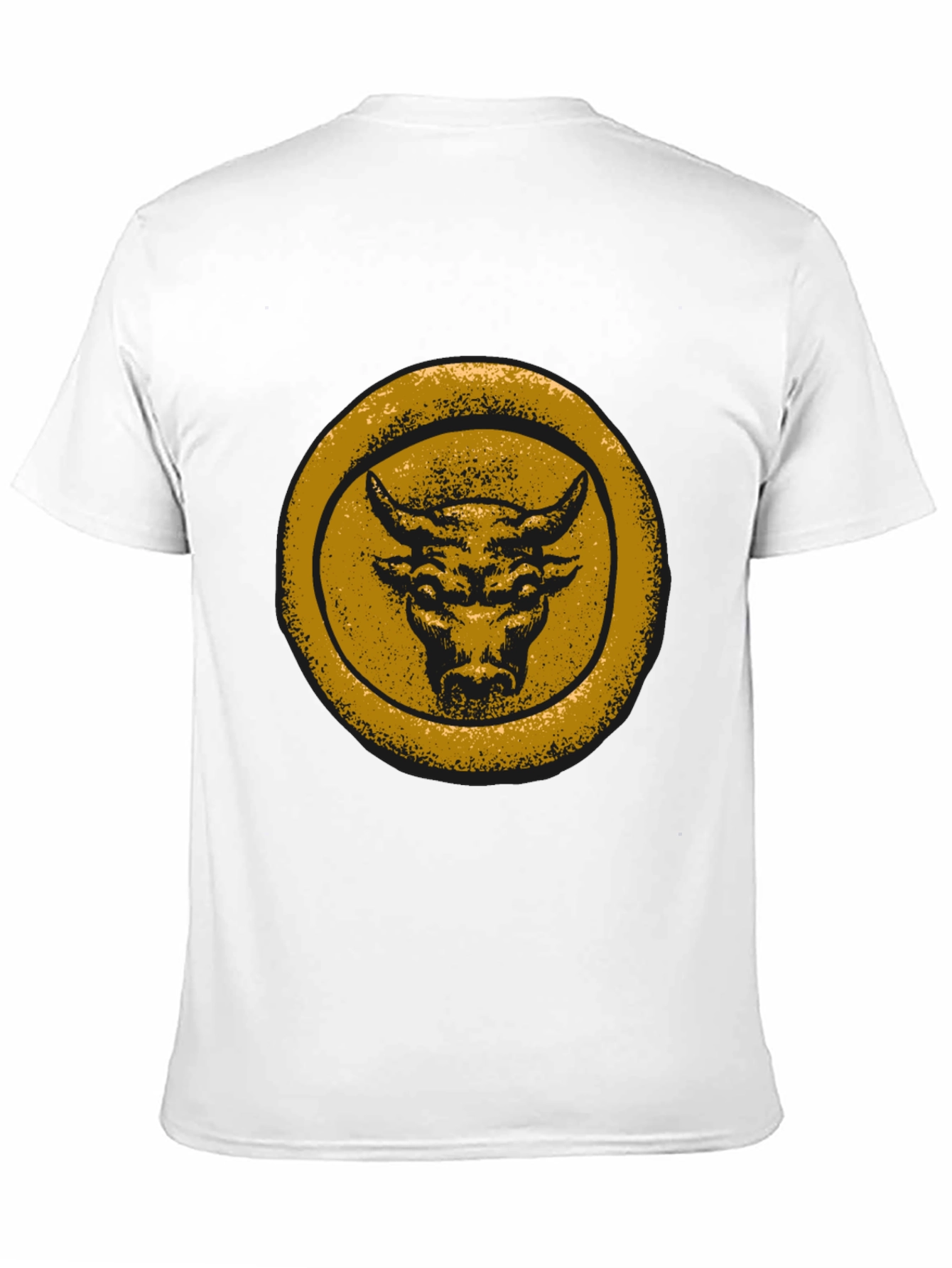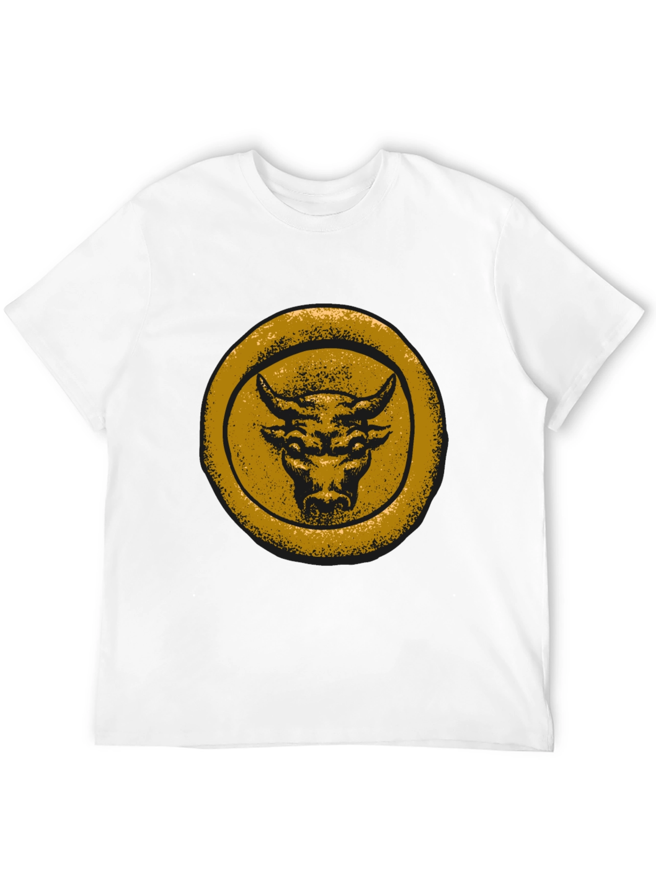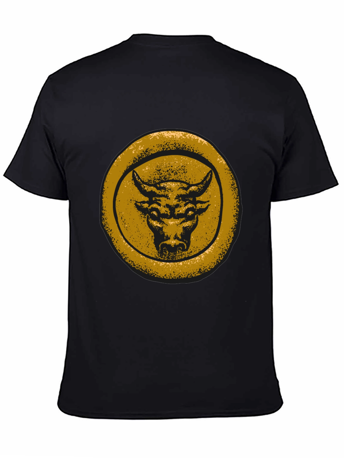 Make a statement with this bold, black t-shirt featuring a striking distressed gold bull graphic. The design showcases a powerful bull head within a circular frame, giving it a vintage and rugged appeal. The t-shirt appears to be made from soft, comfortable cotton, perfect for everyday wear. Its classic fit makes it a versatile addition to any wardrobe. Ideal for casual outings, concerts, or expressing your unique style. Pair it with jeans or shorts for a relaxed, effortless look. This tee is sure to turn heads and become a favorite in your collection.