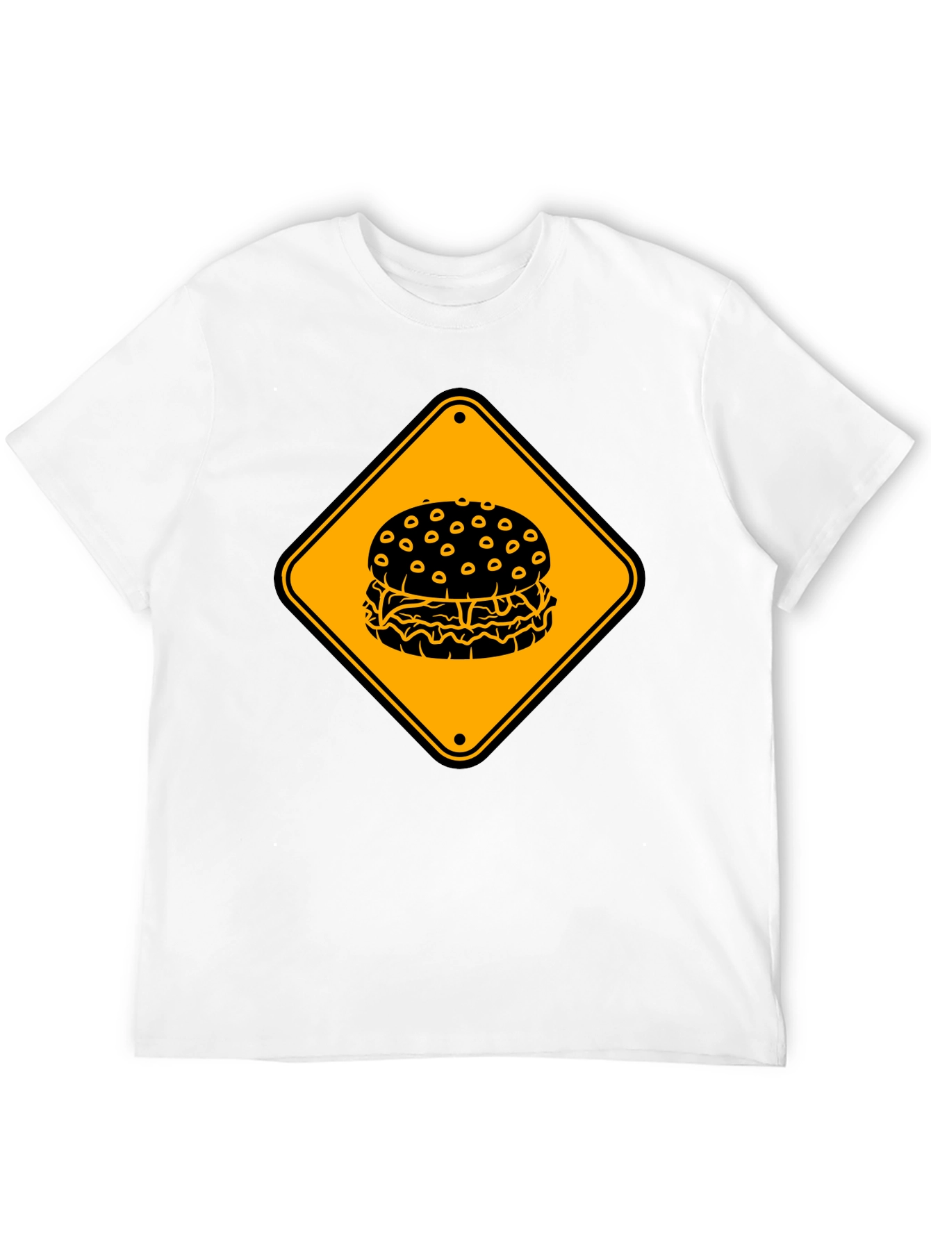 Craving a cool and quirky tee? Feast your eyes on this black unisex t-shirt featuring a bold burger graphic. A bright yellow road sign frames the burger, making it a standout piece. Made from comfortable fabric, it's perfect for everyday wear. Whether you're a burger enthusiast or just love unique designs, this tee is sure to turn heads. Pair it with jeans or shorts for a casual, stylish look. Show off your love for burgers with this must-have addition to your wardrobe.