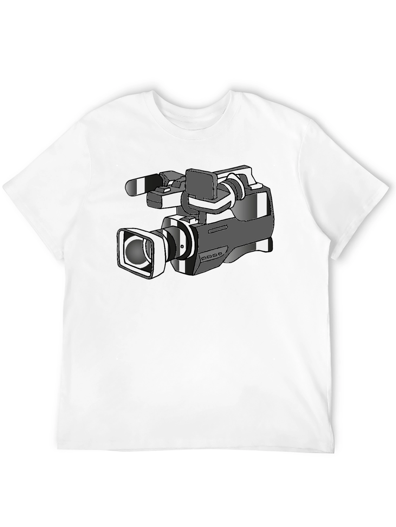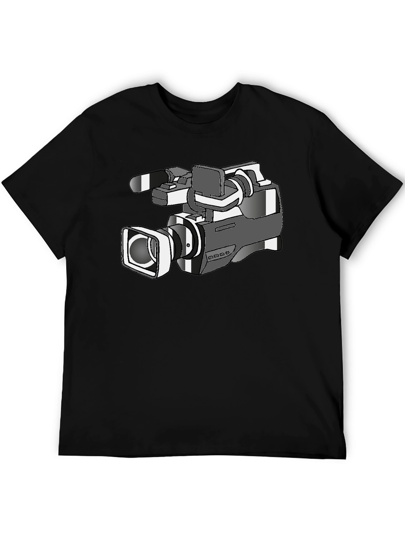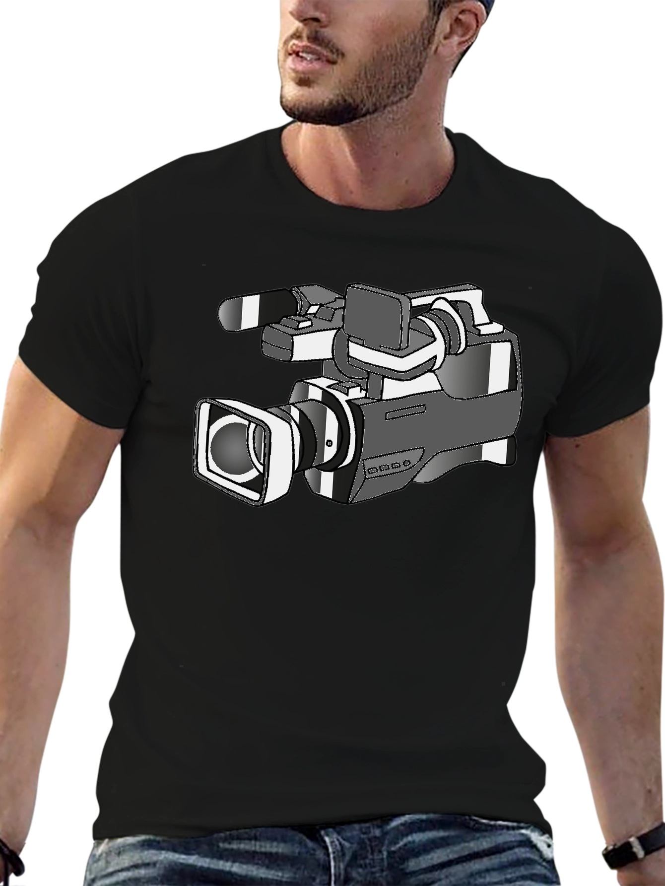 Capture attention with this unique camera graphic tee! Made from comfortable, breathable fabric, this black t-shirt features a detailed illustration of a professional video camera. The monochrome design provides a sleek, modern look perfect for film enthusiasts, videographers, or anyone who loves creative technology. This shirt is ideal for casual outings, film festivals, or as a conversation starter. Showcase your passion for filmmaking with this stylish and eye-catching tee.