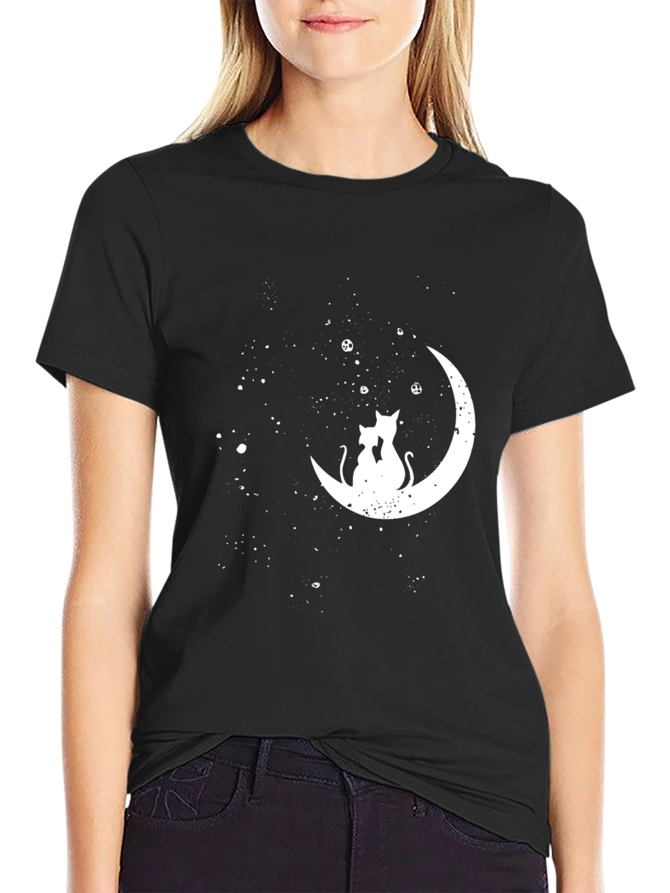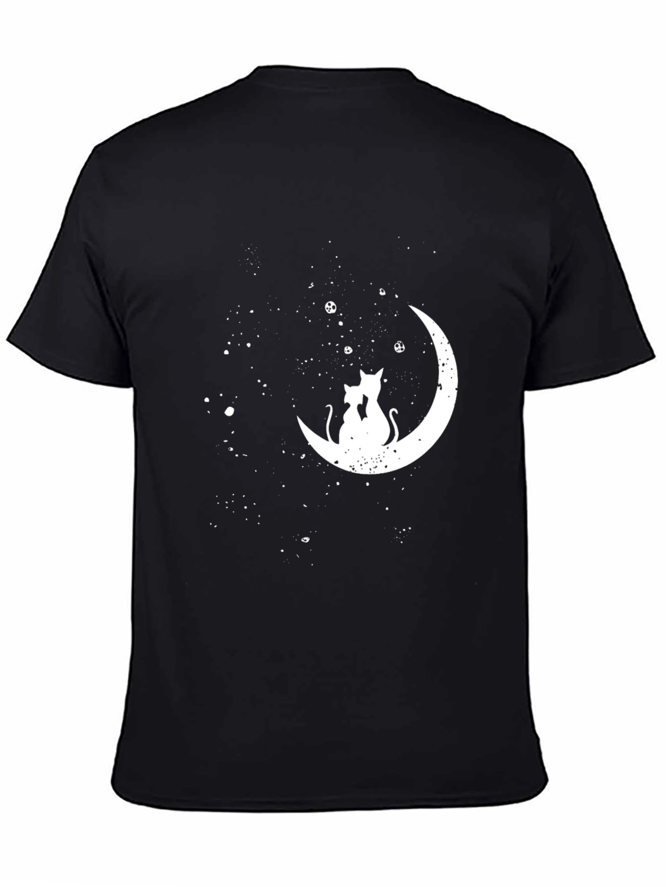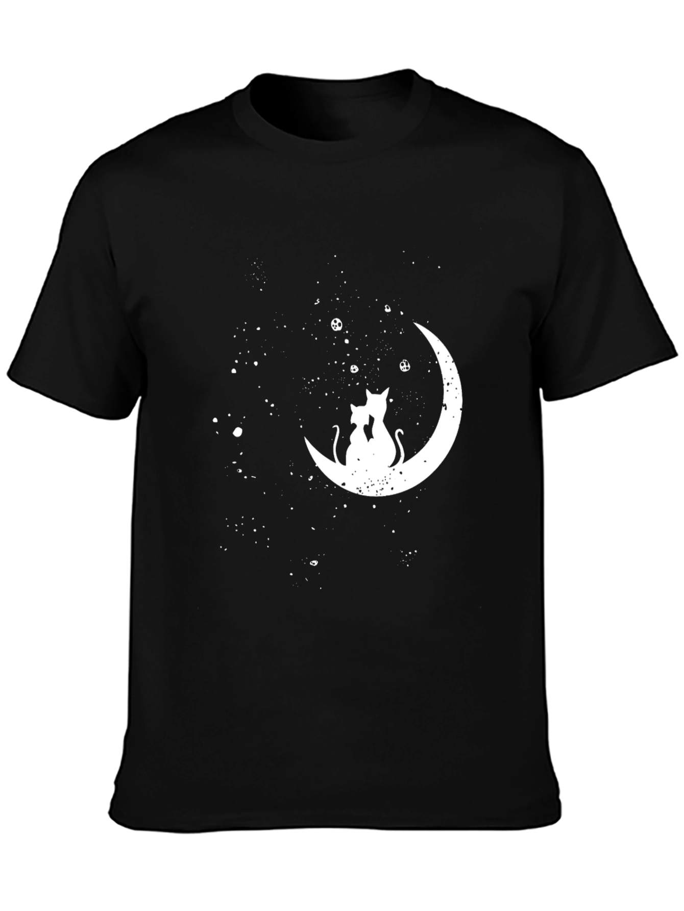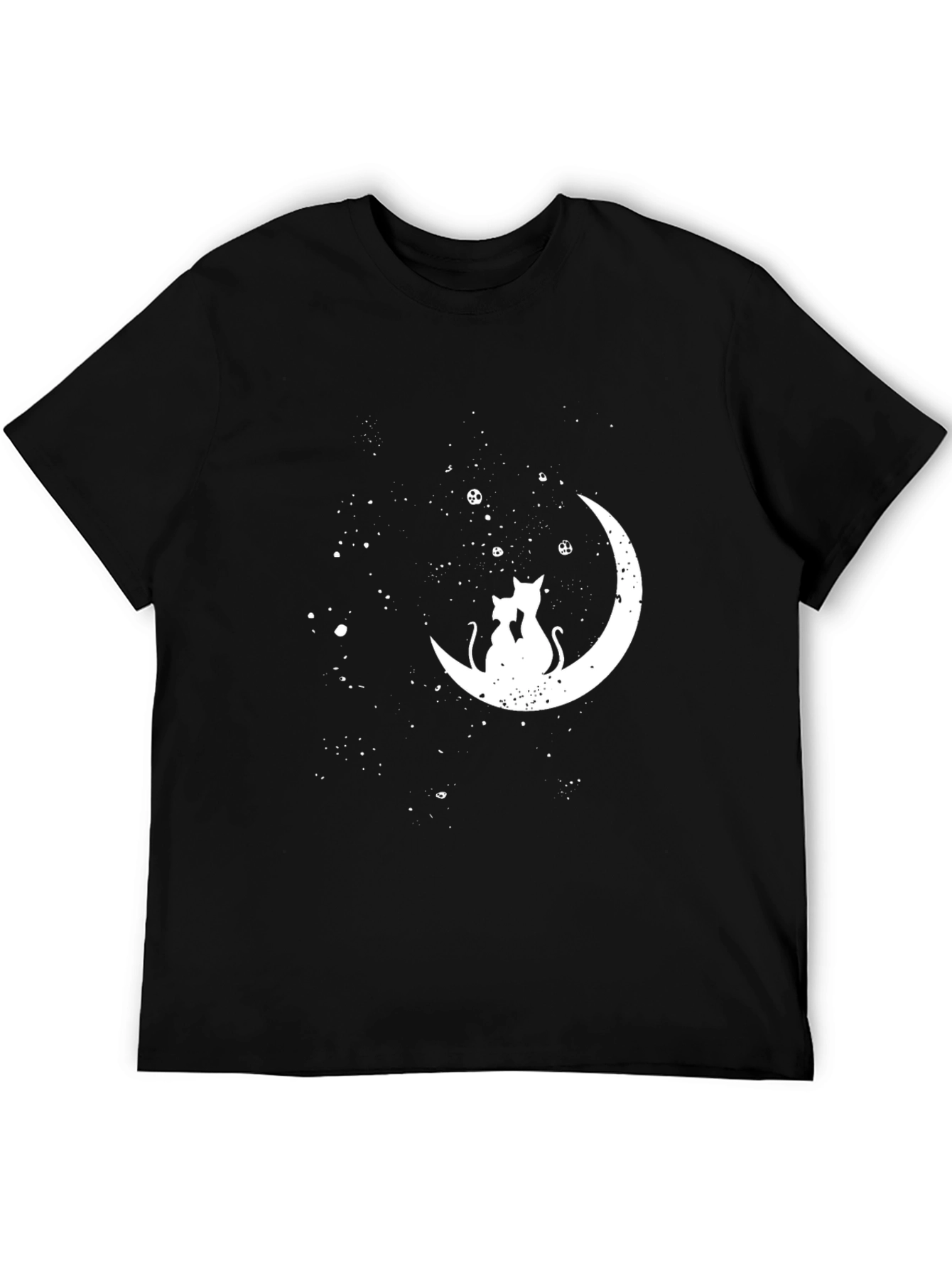 Embrace celestial charm with this stylish black crew neck t-shirt. The shirt features a captivating graphic of two cats silhouetted against a crescent moon, accented by scattered stars. Crafted from comfortable fabric, this shirt offers both style and ease of wear. The crisp white design is eye-catching against the black backdrop, making it perfect for casual outings, lounging at home, or expressing your love for cats and astrology. Add a touch of whimsy to your wardrobe with this unique and versatile tee.