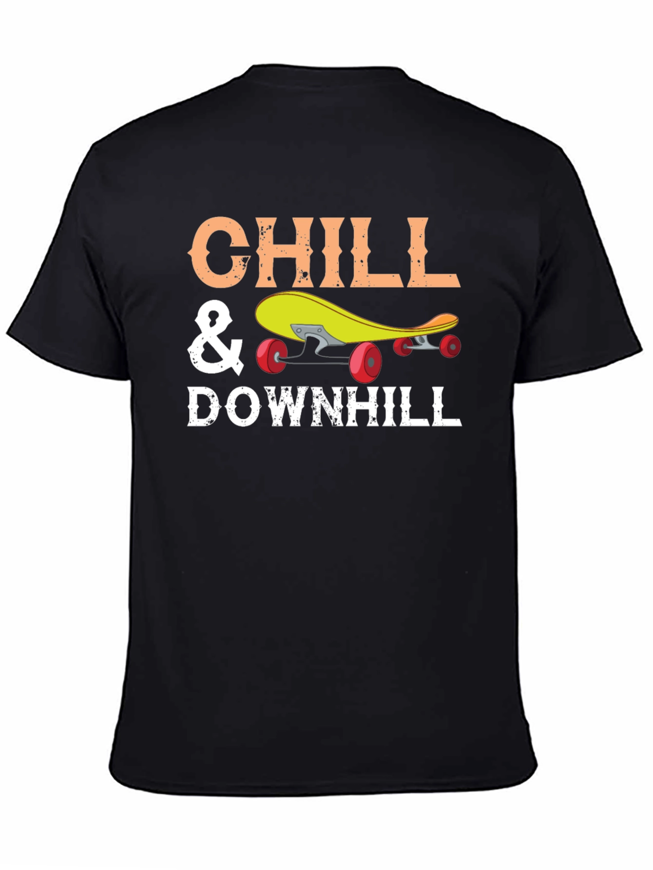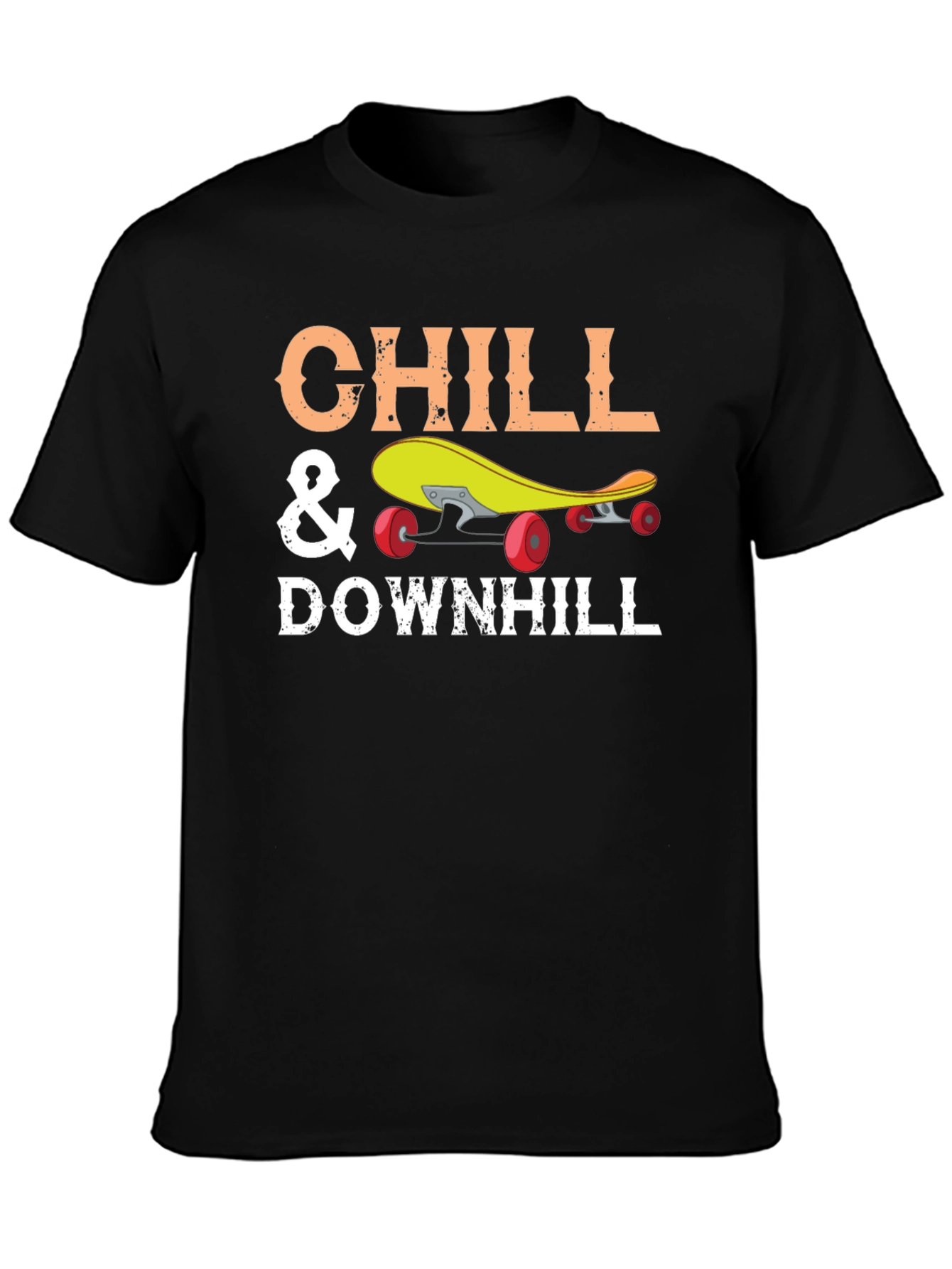 Show off your love for skateboarding with this stylish black t-shirt. Featuring a bold design with the words "Chill & Downhill" alongside a vibrant skateboard graphic, this shirt is perfect for skaters and casual wearers alike. The design includes a yellow skateboard with red wheels, adding a pop of color. Made from comfortable materials, it's ideal for everyday wear. Whether you're hitting the skate park or just hanging out, this t-shirt is sure to turn heads. A must-have for any skateboard enthusiast's wardrobe!