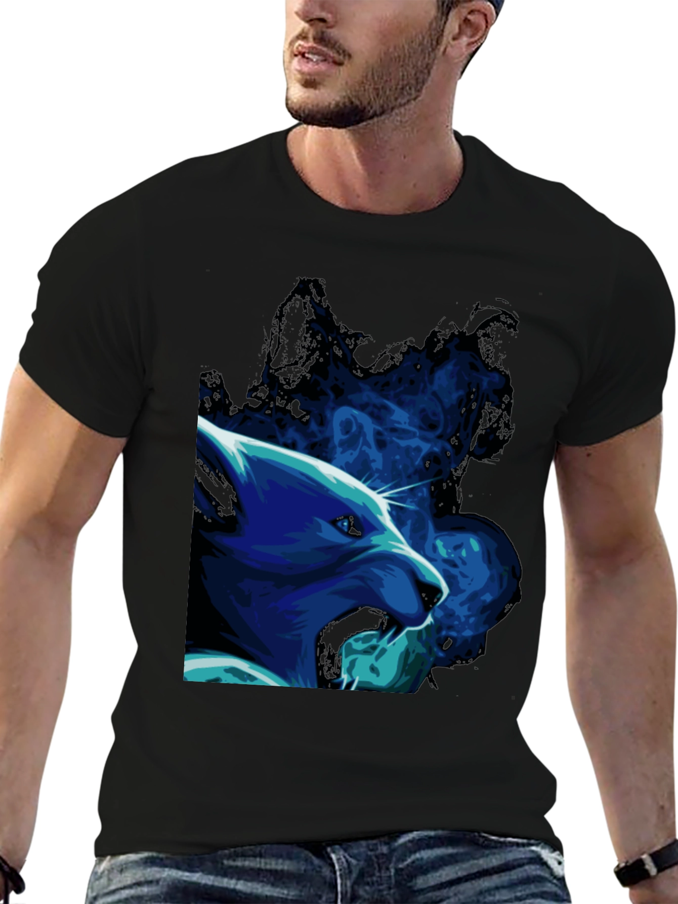 Unleash your inner spirit with this striking black t-shirt featuring a captivating blue wolf graphic. The design showcases a fierce wolf head amidst swirling smoke, creating a bold and edgy look. Made from comfortable, breathable fabric, this tee is perfect for everyday wear. Its unique design makes it ideal for casual outings, concerts, or expressing your individuality. Stand out from the crowd and make a statement with this eye-catching t-shirt. A must-have addition to any wardrobe!