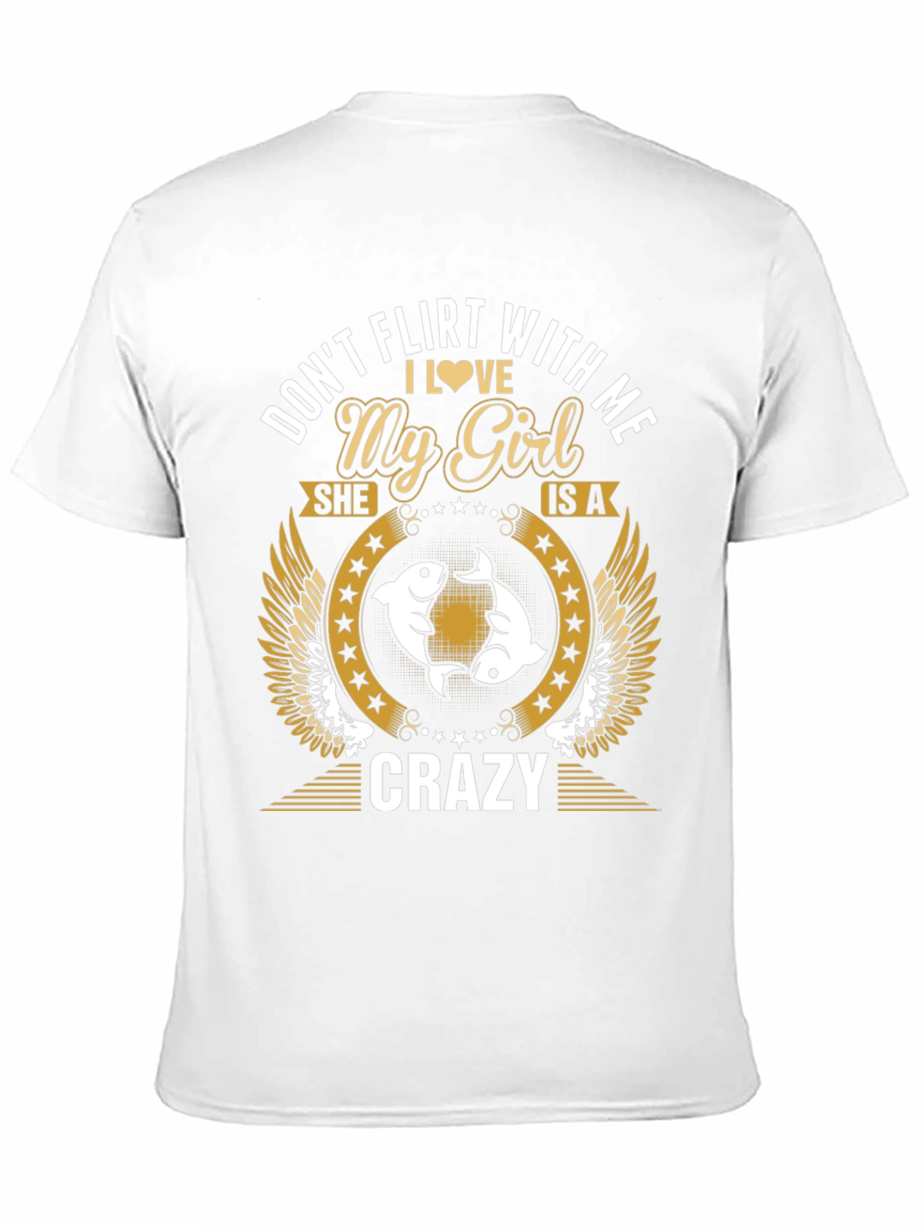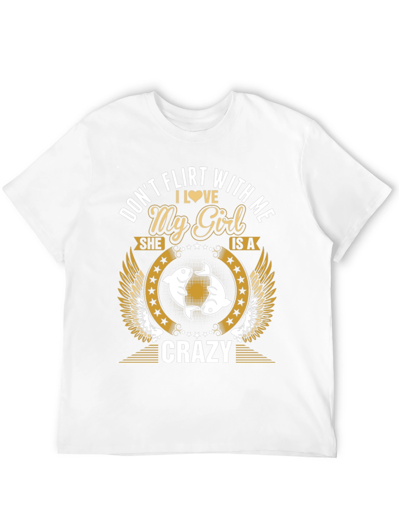 This eye-catching black t-shirt features a bold graphic design with a humorous warning: "Don't Flirt With Me, I Love My Girl, She Is A Crazy." The design incorporates artistic elements like stars, wings, and fish. Made from a soft, breathable fabric, this shirt offers both comfort and style. It's perfect for casual wear, outings with friends, or as a fun gift for someone who wants to proudly display their affection. Show off your playful side and protect your territory with this unique tee!