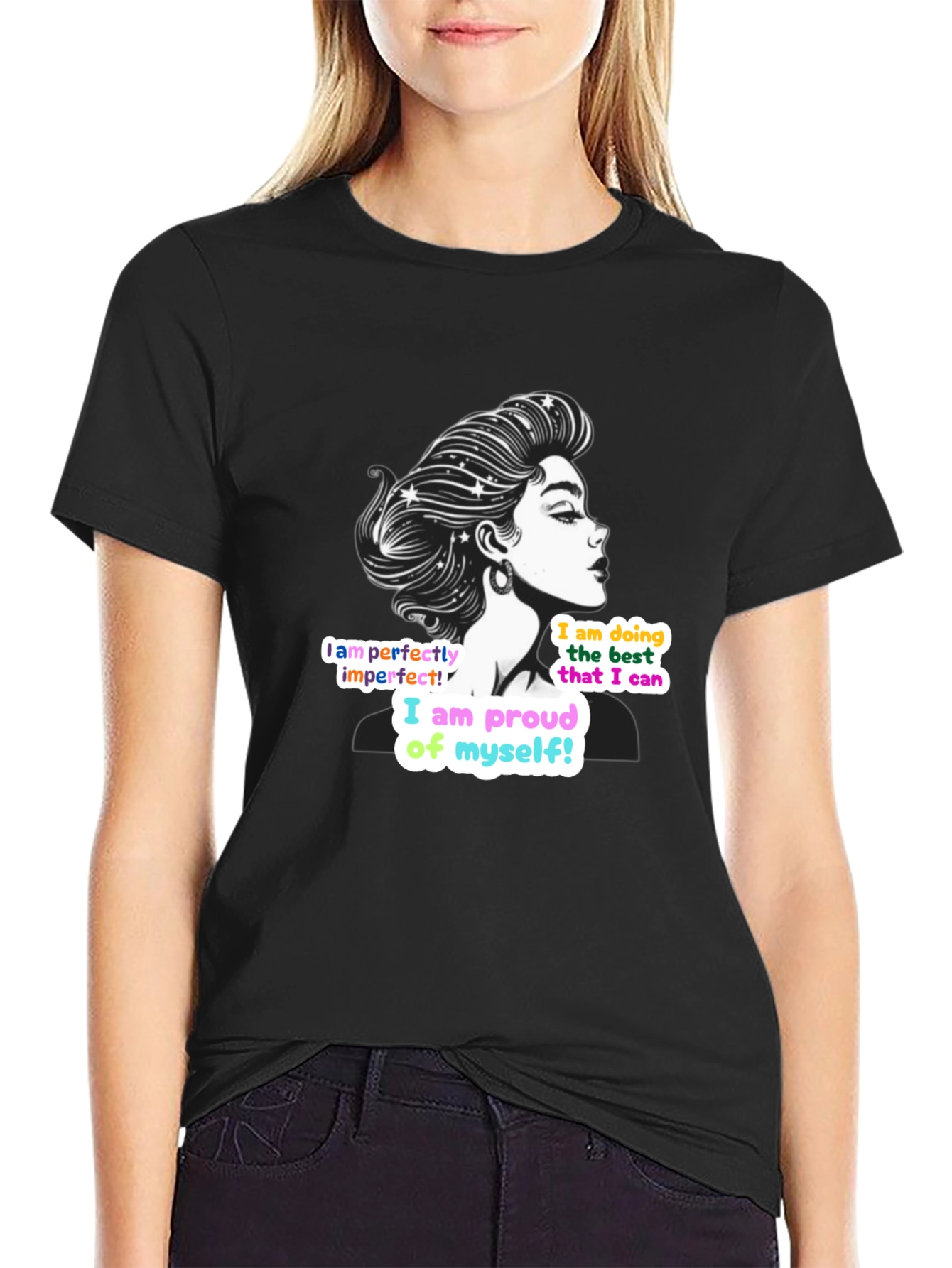 Showcase your self-love and confidence with this empowering women's t-shirt. The design features a stylish graphic of a woman in profile, adorned with stars in her hair. Bold, colorful text reads "I am perfectly imperfect!", "I am doing the best that I can", and "I am proud of myself!", serving as a daily reminder of self-acceptance and positivity. Crafted from a soft, comfortable black fabric, this t-shirt is perfect for everyday wear. Its classic fit makes it easy to style with jeans, shorts, or a skirt. Whether you're running errands, meeting friends, or just relaxing at home, this tee is a stylish and meaningful choice. Embrace your imperfections and wear your self-love proudly!