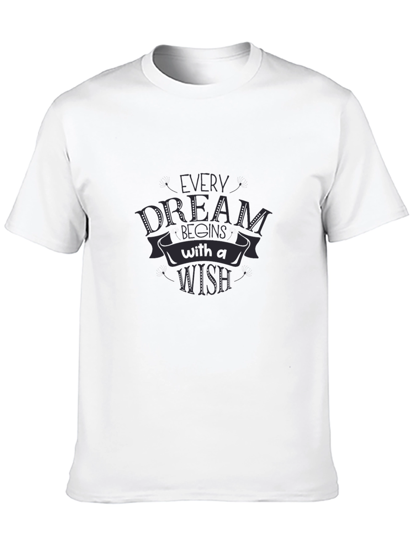 This classic black t-shirt features a stylish graphic print that reads "Every Dream Begins With a Wish." The design is eye-catching and subtly inspiring. Made from what appears to be a soft and comfortable material, this tee is perfect for casual wear. Its versatile design makes it suitable for everyday use, whether you're running errands, hanging out with friends, or simply relaxing at home. Show off your style with this inspirational t-shirt that combines comfort and a positive message.