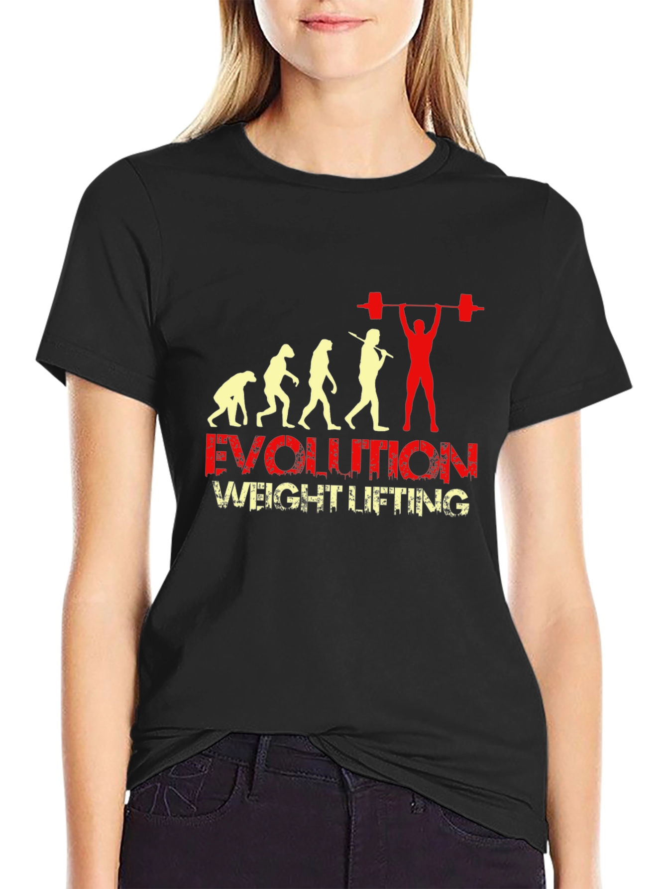 Show off your love of weight lifting with this unique black t-shirt. Made from a comfortable-looking fabric, this short-sleeved shirt features a creative design of evolution, ending with a weightlifter. The text "EVOLUTION WEIGHT LIFTING" adds to the sporty look. The print is a mix of red and yellow. This shirt is perfect for workouts at the gym, casual wear, or as a gift for the fitness enthusiast in your life. Let everyone know about your passion for fitness with this statement piece.
