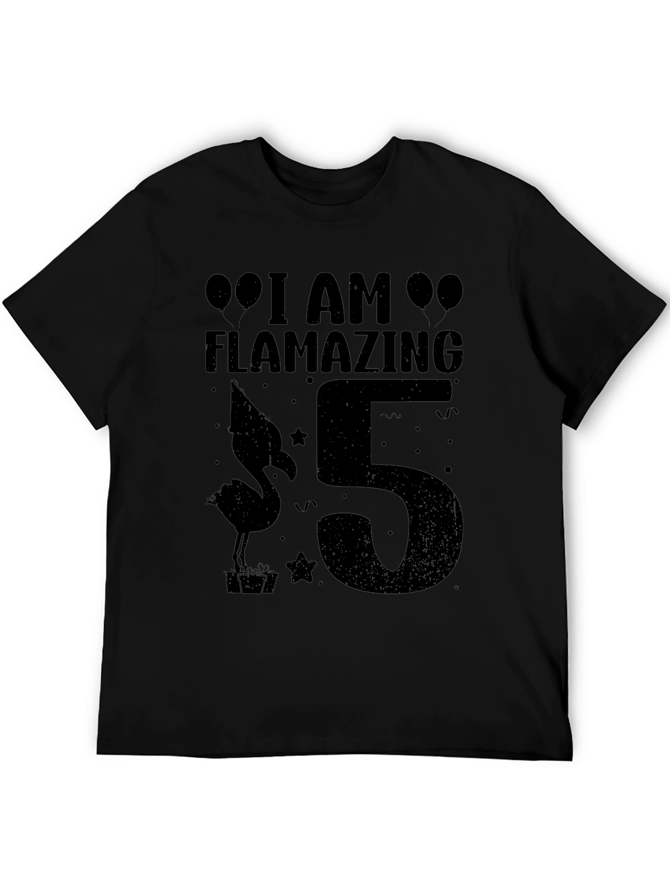 Celebrate a special milestone with this fun and stylish black t-shirt! Featuring a playful "I am Flamazing 5" design, complete with balloons, a flamingo, and a celebratory number 5, this shirt is perfect for a 5th birthday party. The bold black color makes the design pop, ensuring the birthday boy or girl stands out. Constructed from a comfortable material, this tee is ideal for all-day wear, whether at a party or just hanging out. A memorable and adorable way to mark this significant year, this t-shirt will surely be a cherished keepsake.