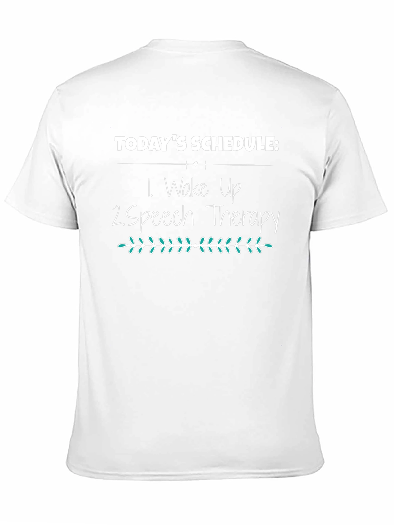 This black t-shirt features a humorous design that's perfect for speech therapists or anyone who appreciates a good laugh. The graphic on the front reads "TODAY'S SCHEDULE:" followed by "1. Wake Up" and "2. Speech Therapy" in a clear, readable font. An ornate, leaf-like design separates the text, adding a touch of elegance. Made from a soft-looking fabric, this tee appears comfortable for everyday wear. Whether you're heading to a therapy session or just relaxing, this shirt is sure to spark conversation and showcase your unique sense of humor. It's a great gift idea for speech therapists, students, or anyone in the field!