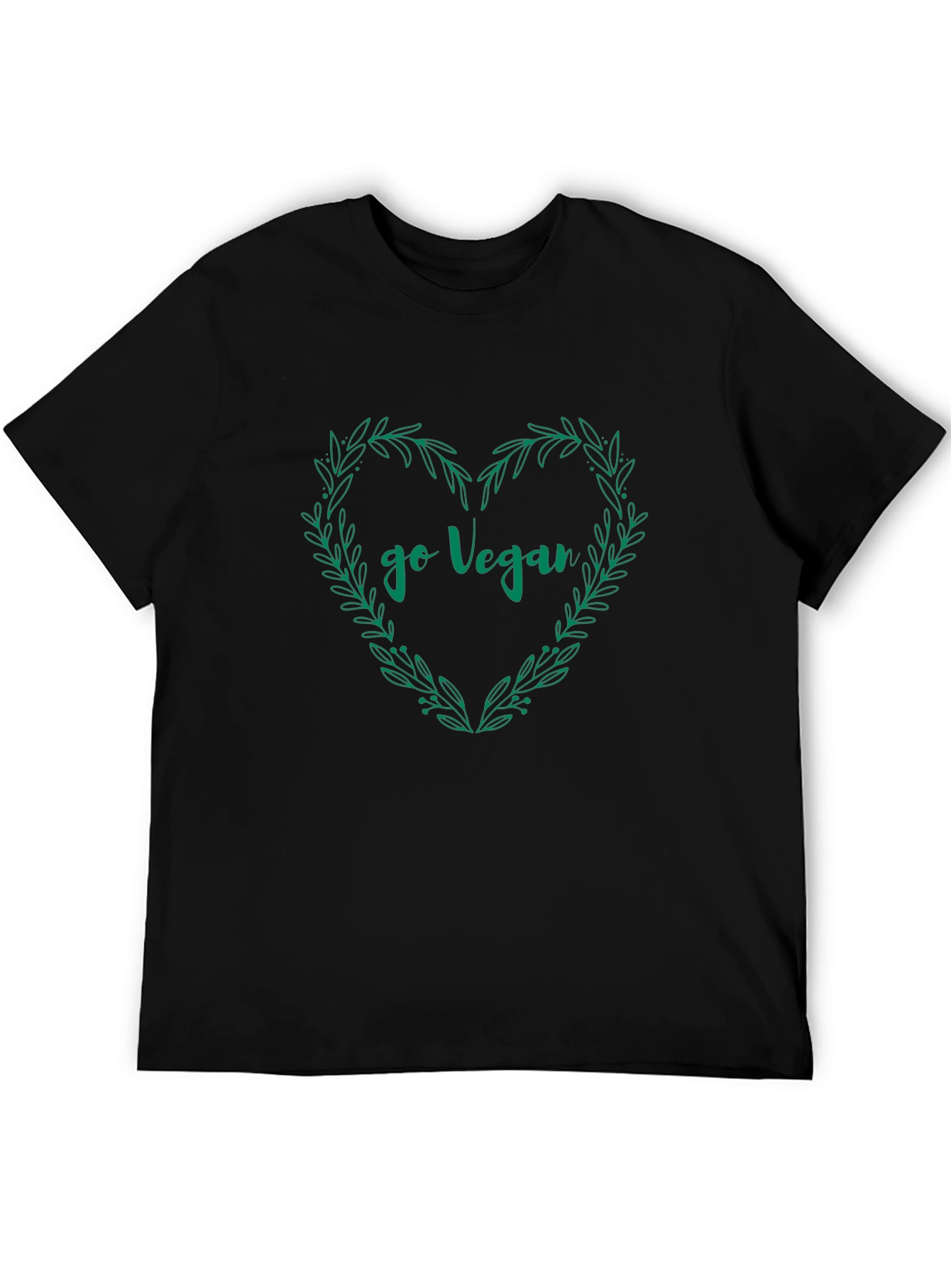 Show off your compassion with this stylish black T-shirt featuring a unique 'Go Vegan' design. The graphic displays the phrase 'go vegan' nestled inside a heart-shaped wreath of leaves. The shirt is made of what appears to be a soft cotton blend, ensuring a comfortable fit for everyday wear. This T-shirt is perfect for spreading awareness about veganism or simply expressing your values in a fashionable way. Wear it to rallies, meetups, or as a conversation starter in your daily life. Its relaxed fit and classic cut make it a versatile addition to any wardrobe. A great gift for the vegan activist in your life!