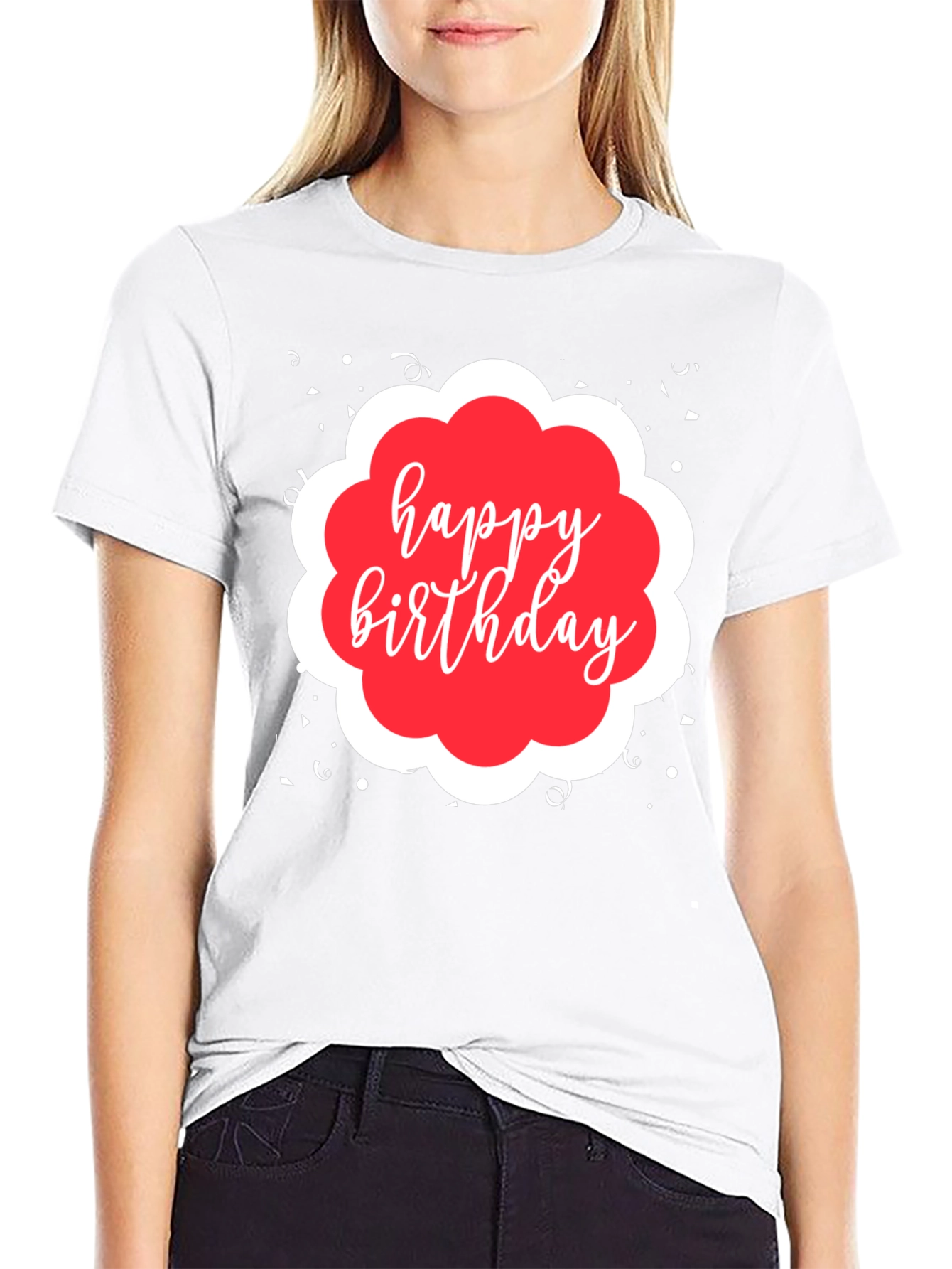 Celebrate in style with this eye-catching black t-shirt! Featuring a festive "Happy Birthday" graphic in a playful, red and white design, this shirt is perfect for birthday parties, celebrations, or everyday wear for the birthday person. The shirt appears to be made from a comfortable, breathable fabric, ensuring a great fit and feel. The design also includes confetti accents for an added touch of fun. Get ready to make a statement and spread the birthday cheer with this fun and stylish tee.