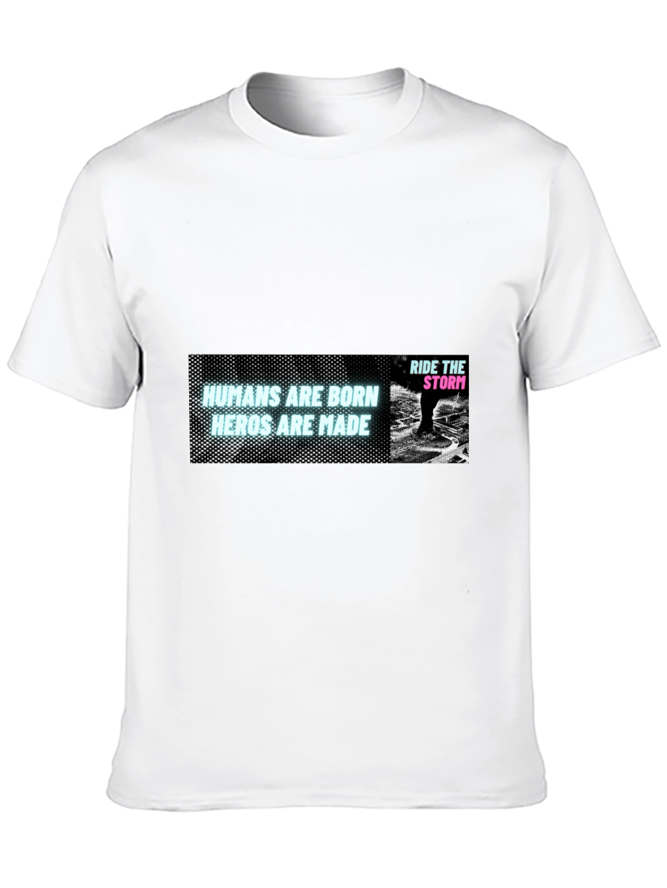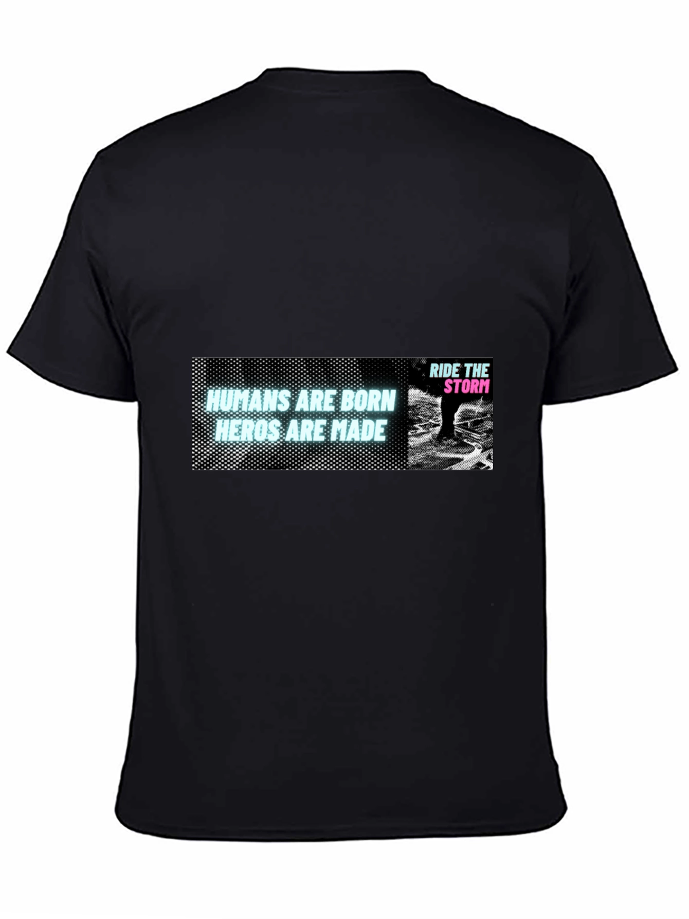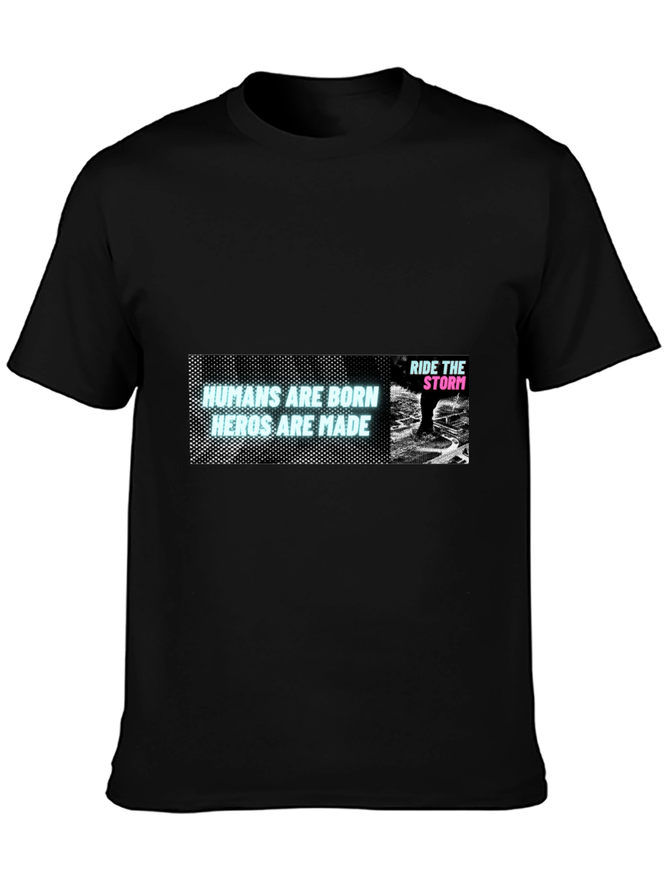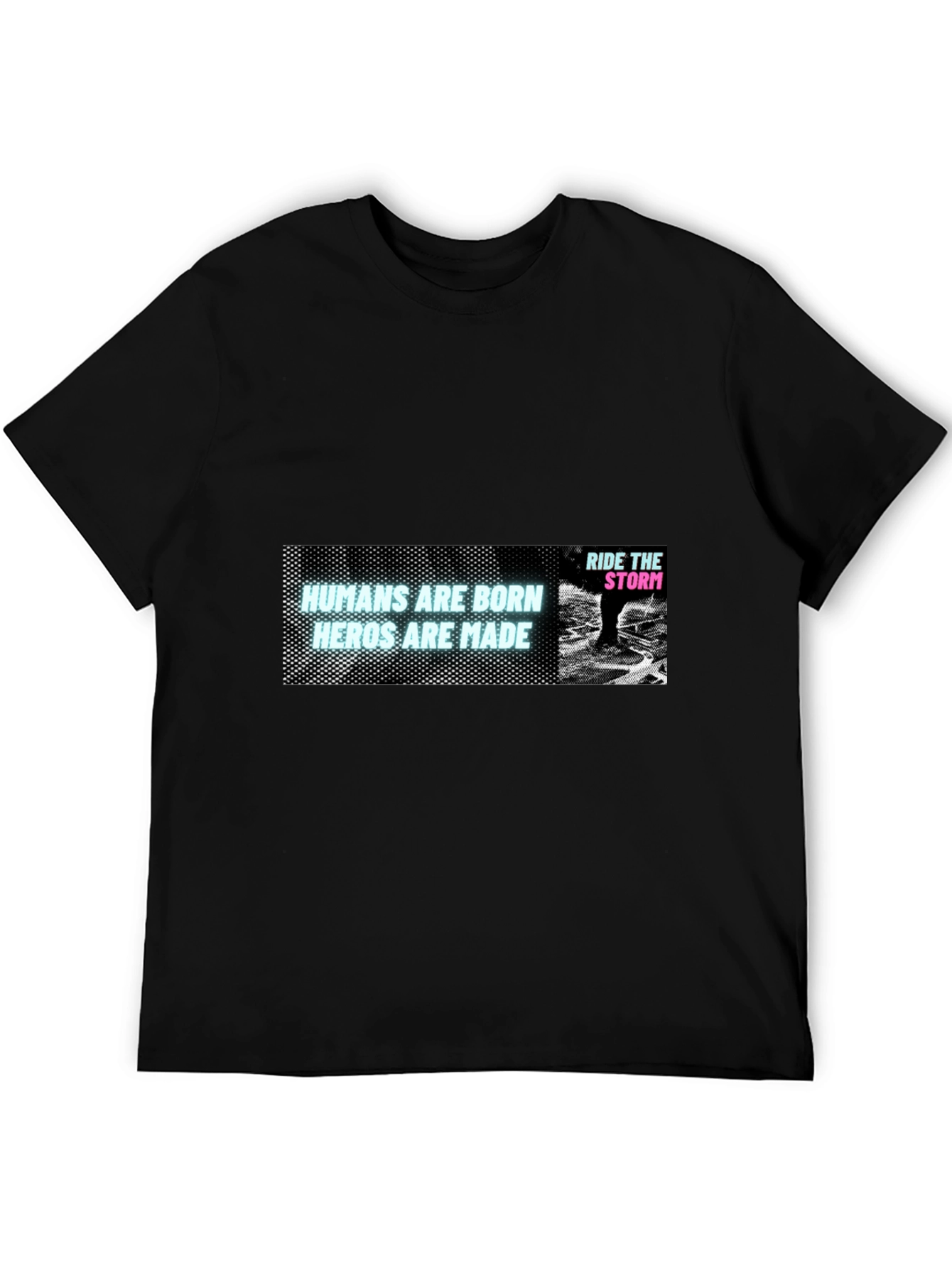 This stylish black t-shirt features a unique and inspiring graphic design. On the left, the words "HUMANS ARE BORN HEROES ARE MADE" are printed in a vibrant, neon-style font with a dot matrix background, giving it a modern, tech-inspired look. To the right, an image shows a person riding in the storm with "RIDE THE STORM" text. The shirt itself appears to be made of a soft and comfortable fabric, ideal for everyday wear. This shirt is perfect for those who want to express their individuality and wear a message of courage and determination. Its bold design is sure to turn heads and spark conversations, making it a standout piece in any wardrobe.