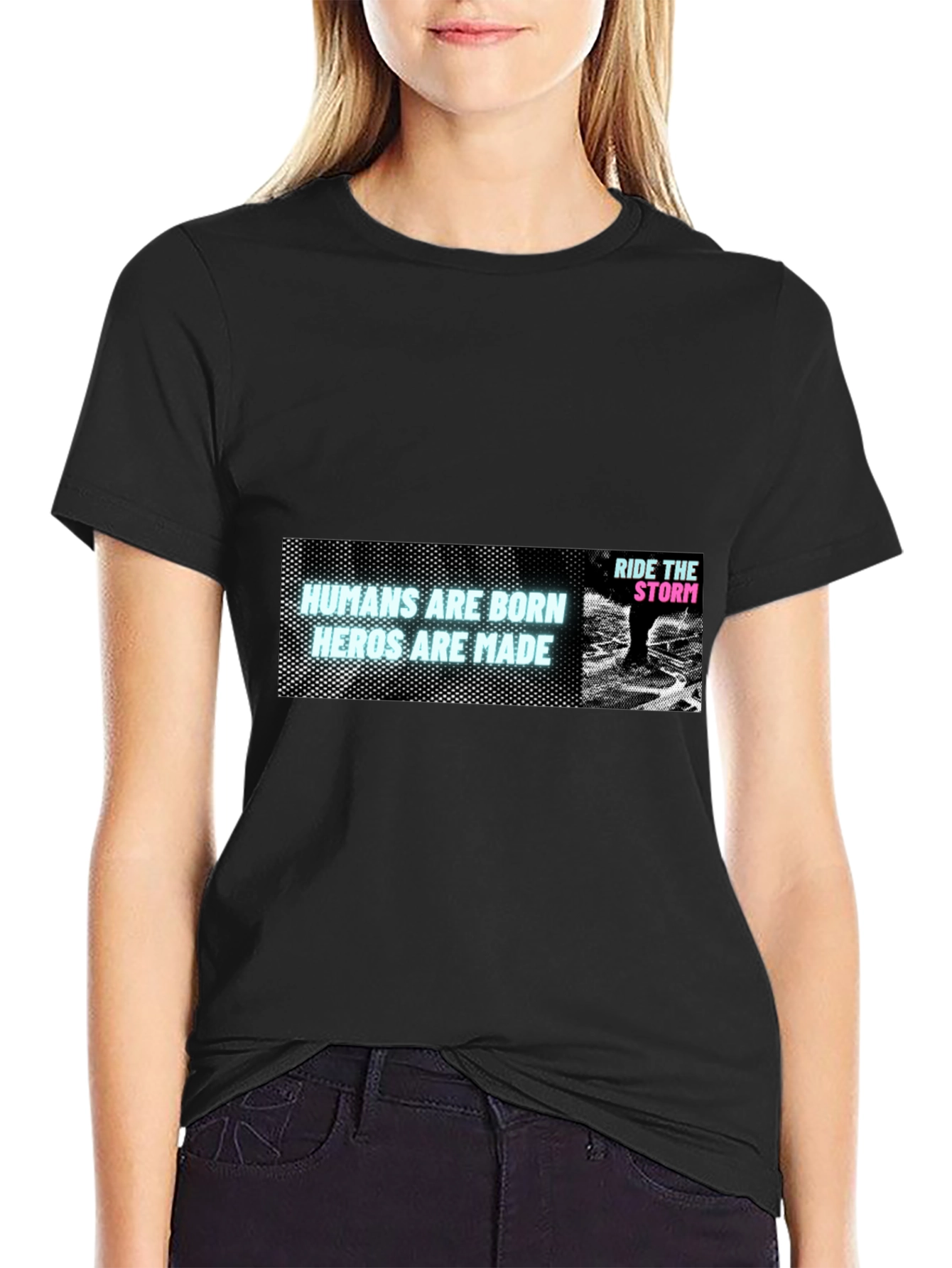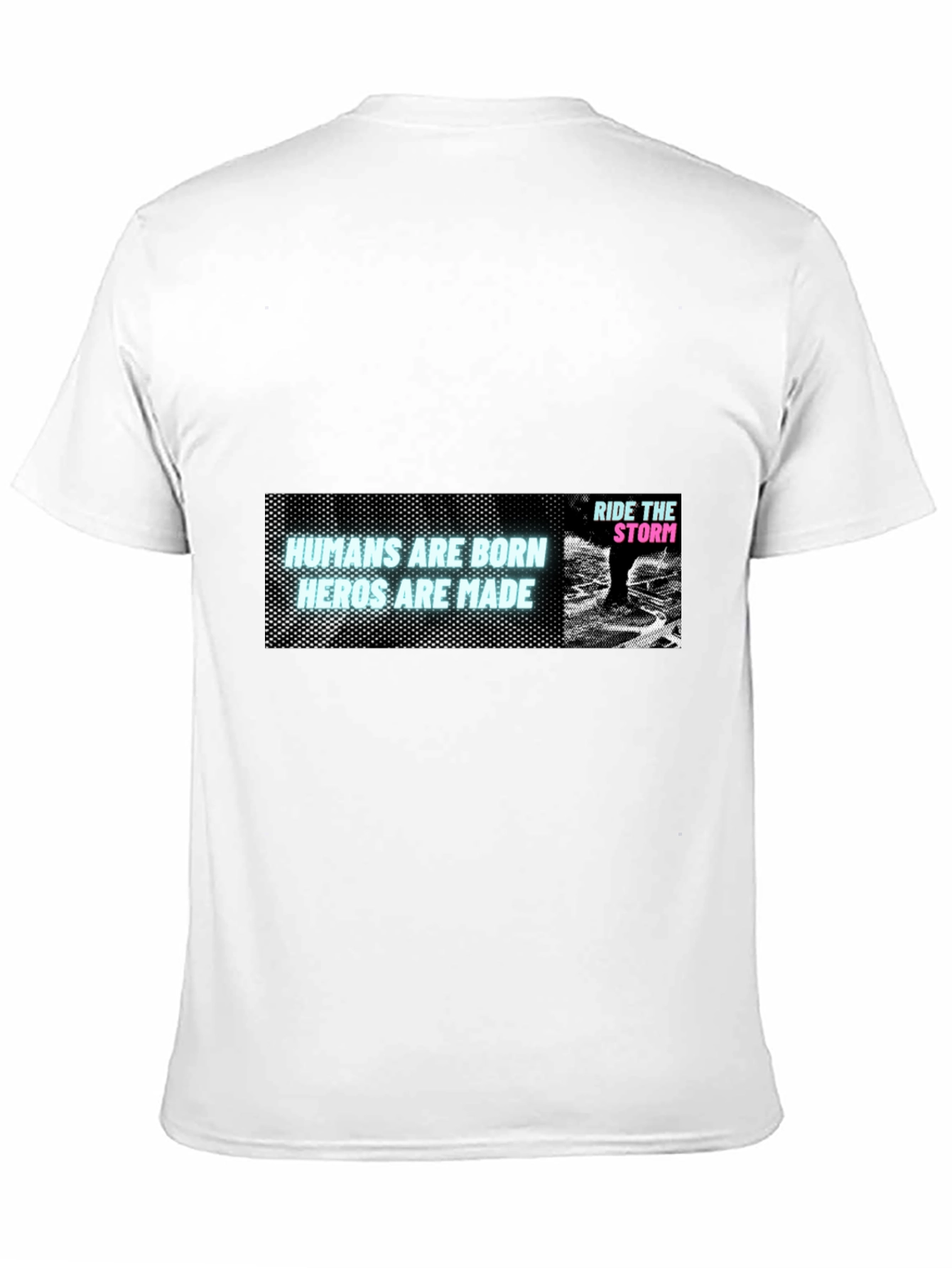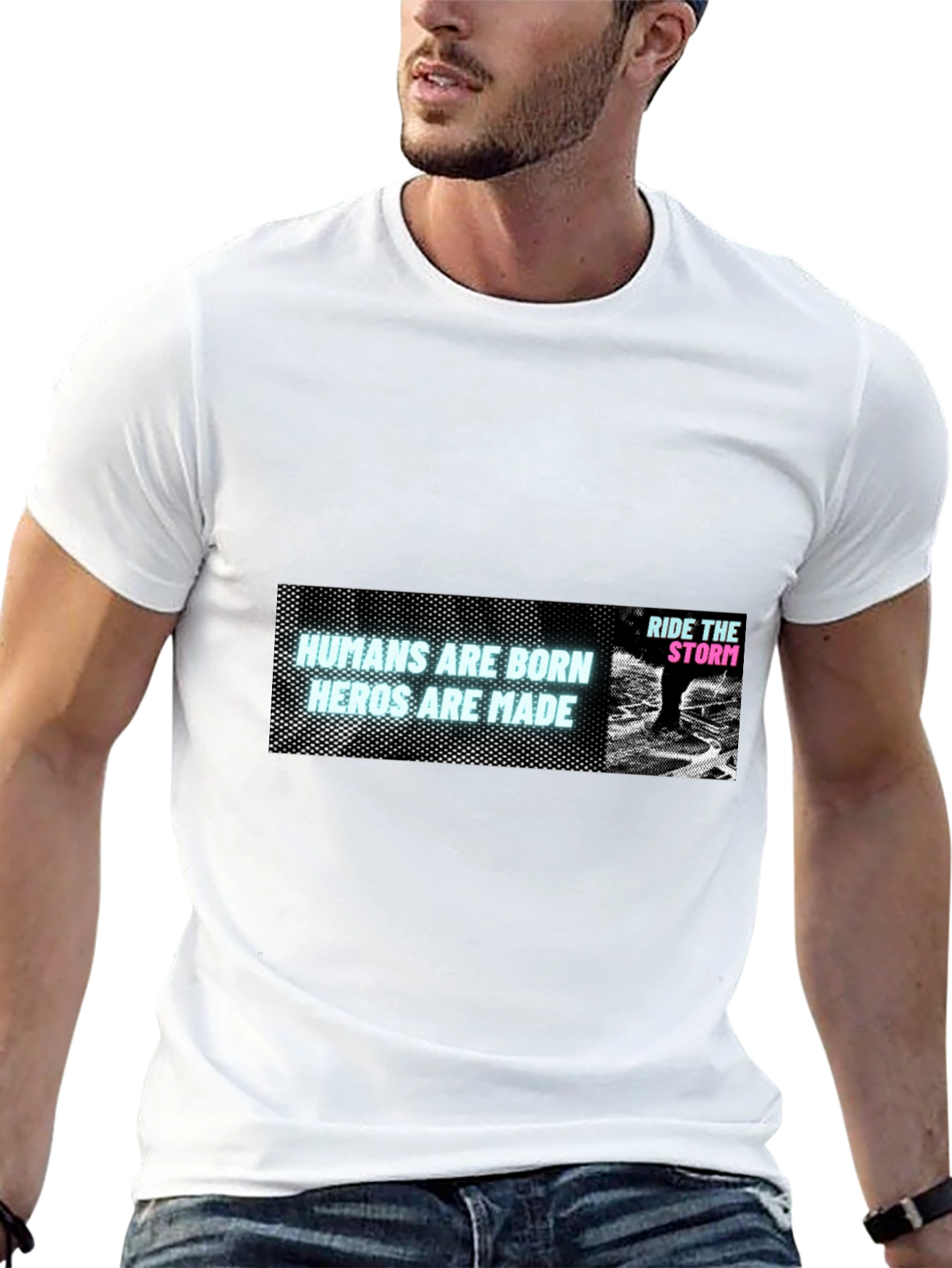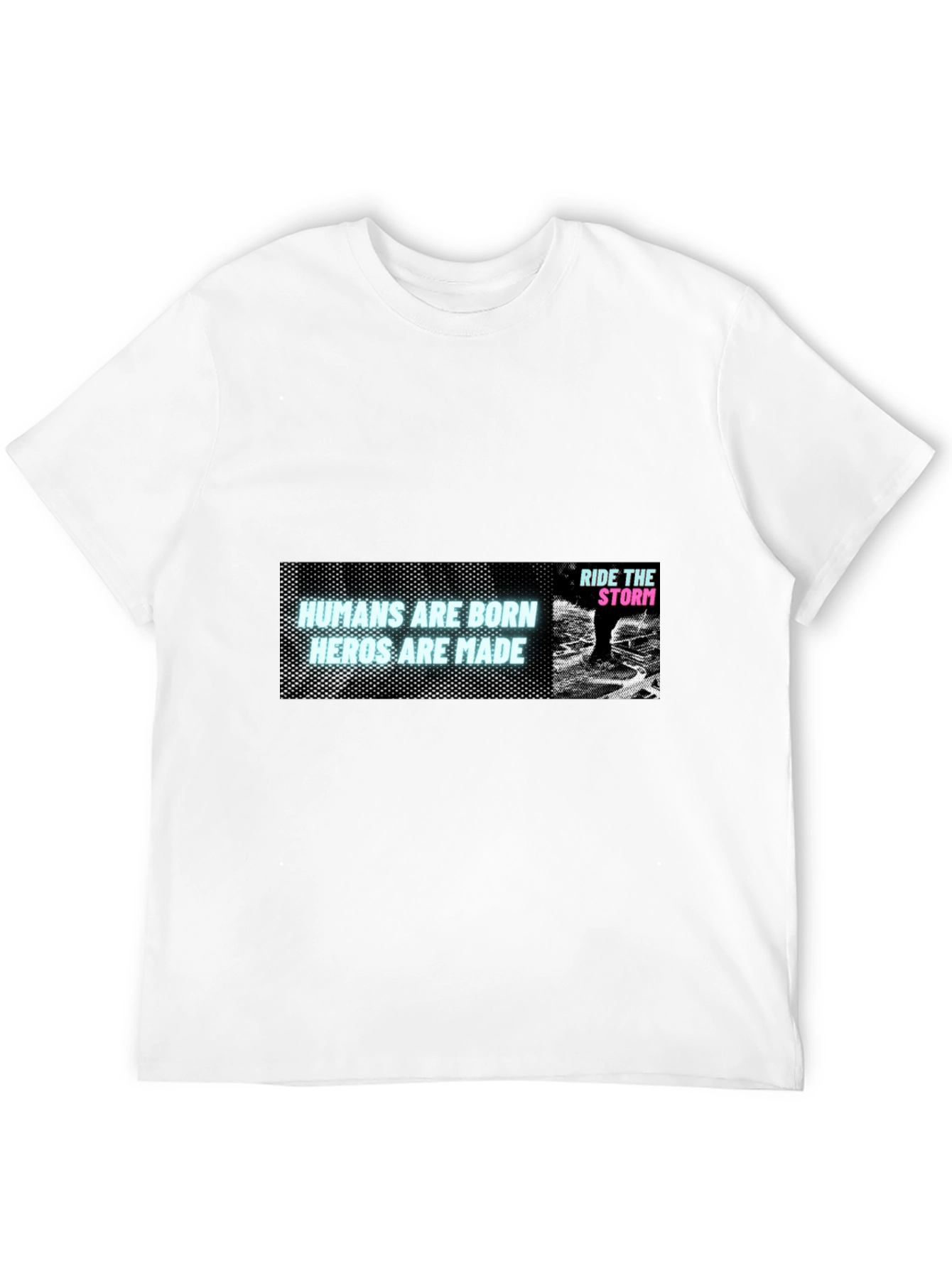 This stylish black t-shirt features a unique and inspiring graphic design. On the left, the words "HUMANS ARE BORN HEROES ARE MADE" are printed in a vibrant, neon-style font with a dot matrix background, giving it a modern, tech-inspired look. To the right, an image shows a person riding in the storm with "RIDE THE STORM" text. The shirt itself appears to be made of a soft and comfortable fabric, ideal for everyday wear. This shirt is perfect for those who want to express their individuality and wear a message of courage and determination. Its bold design is sure to turn heads and spark conversations, making it a standout piece in any wardrobe.