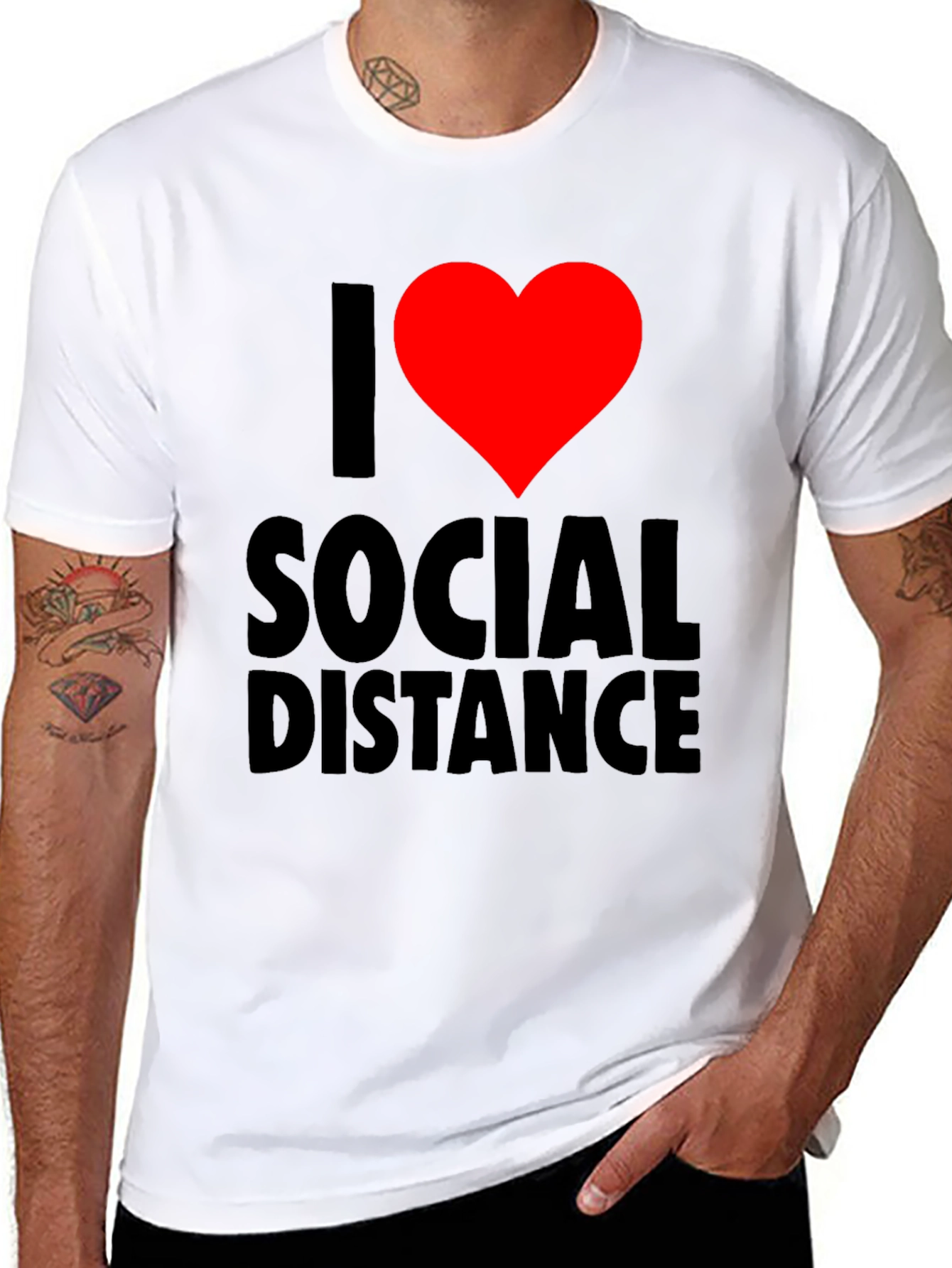 Show your love for personal space with this bold graphic tee! Featuring a playful design with a vibrant red heart replacing the word "love" in the phrase "I Heart Social Distance", this t-shirt makes a statement while keeping you comfortable. The design is printed on a soft, black tee. It's perfect for casual outings, running errands, or simply relaxing at home. Express your unique style and maybe keep people at a distance.