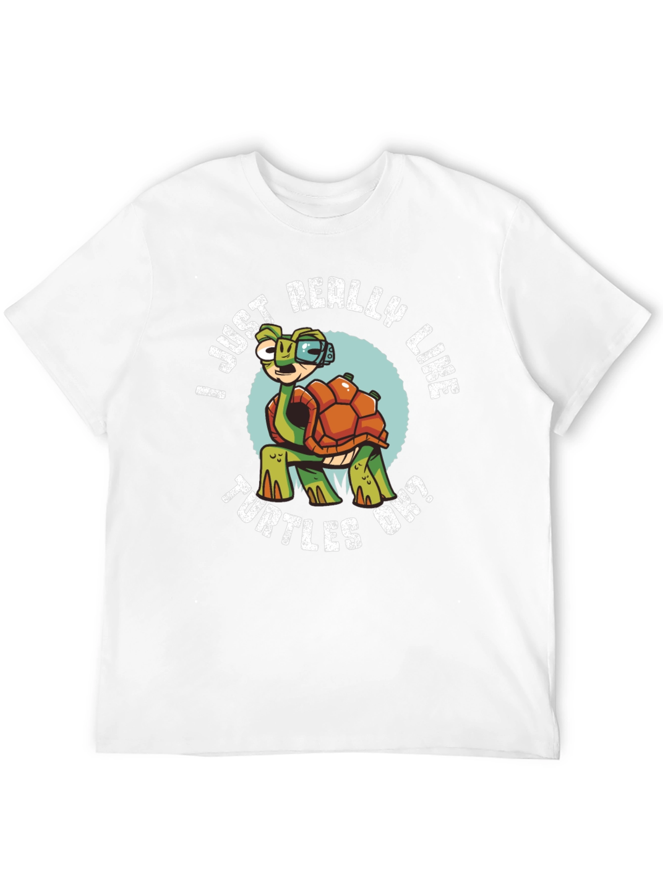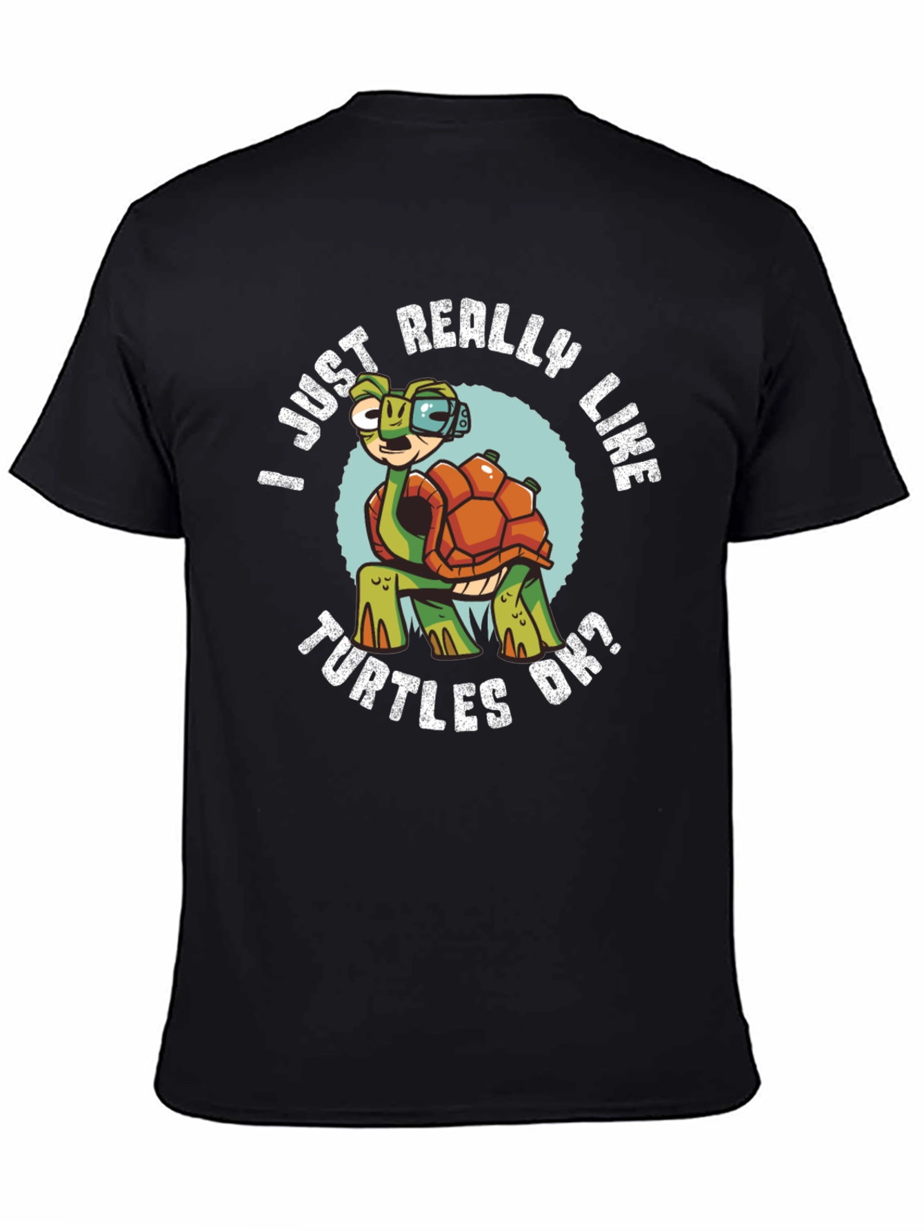 Show your love for turtles with this playful graphic t-shirt! Featuring a cartoon turtle wearing glasses and a circular design with the text "I Just Really Like Turtles OK?", this tee is perfect for turtle enthusiasts. The design is printed on a black, soft-fabric t-shirt and it's ideal for casual wear, animal lovers, or everyday style. Get yours and share your passion for turtles!