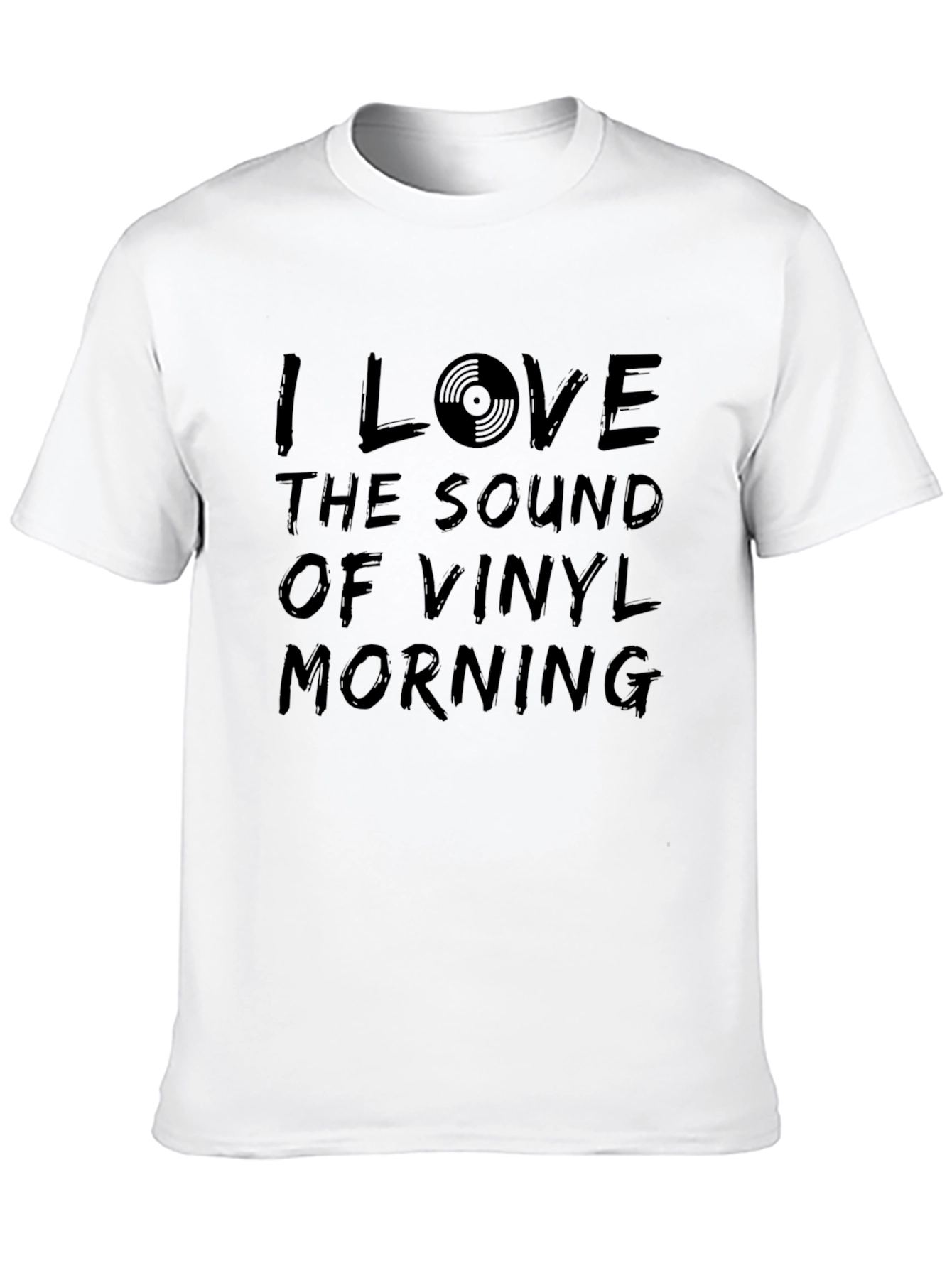 Show your love for classic vinyl music with this stylish black t-shirt. Featuring a bold graphic design with the phrase "I LOVE THE SOUND OF VINYL MORNING," this shirt is perfect for music lovers and vinyl enthusiasts. The design incorporates a vinyl record image, adding a visual element that pops. Made from a comfortable material, this tee is ideal for casual wear, music events, or just lounging around. It’s a great way to express your passion for music and start conversations. A must-have for any vinyl collector's wardrobe!
