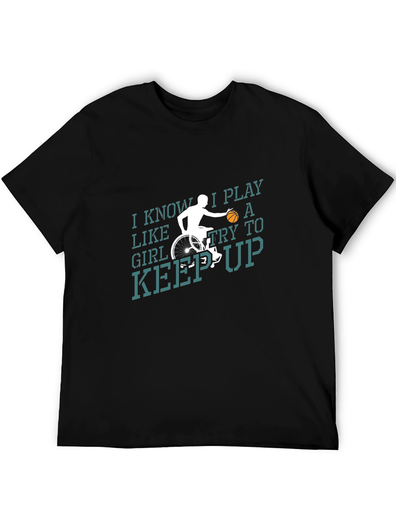 Show your love for basketball with this stylish black t-shirt! The shirt features a unique design with a graphic of a person in a wheelchair playing basketball. The text reads "I Know I Play Like A Girl Try To Keep Up", making it a perfect gift for any female basketball lover. The shirt is made of comfortable material and has a classic fit. Great for casual wear, sports events, or as a statement piece.
