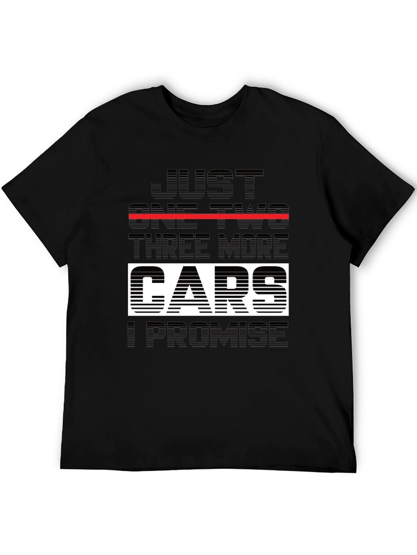 Show off your passion with this bold graphic tee! This black T-shirt features a humorous automotive-themed design. The text includes the saying "JUST ONE TWO THREE MORE CARS I PROMISE." The word "CARS" is highlighted with a white fill and horizontal stripes. Crafted from a soft-looking fabric, it offers a comfortable fit for everyday wear. Perfect for car enthusiasts and casual outings, this tee adds a fun twist to your wardrobe.