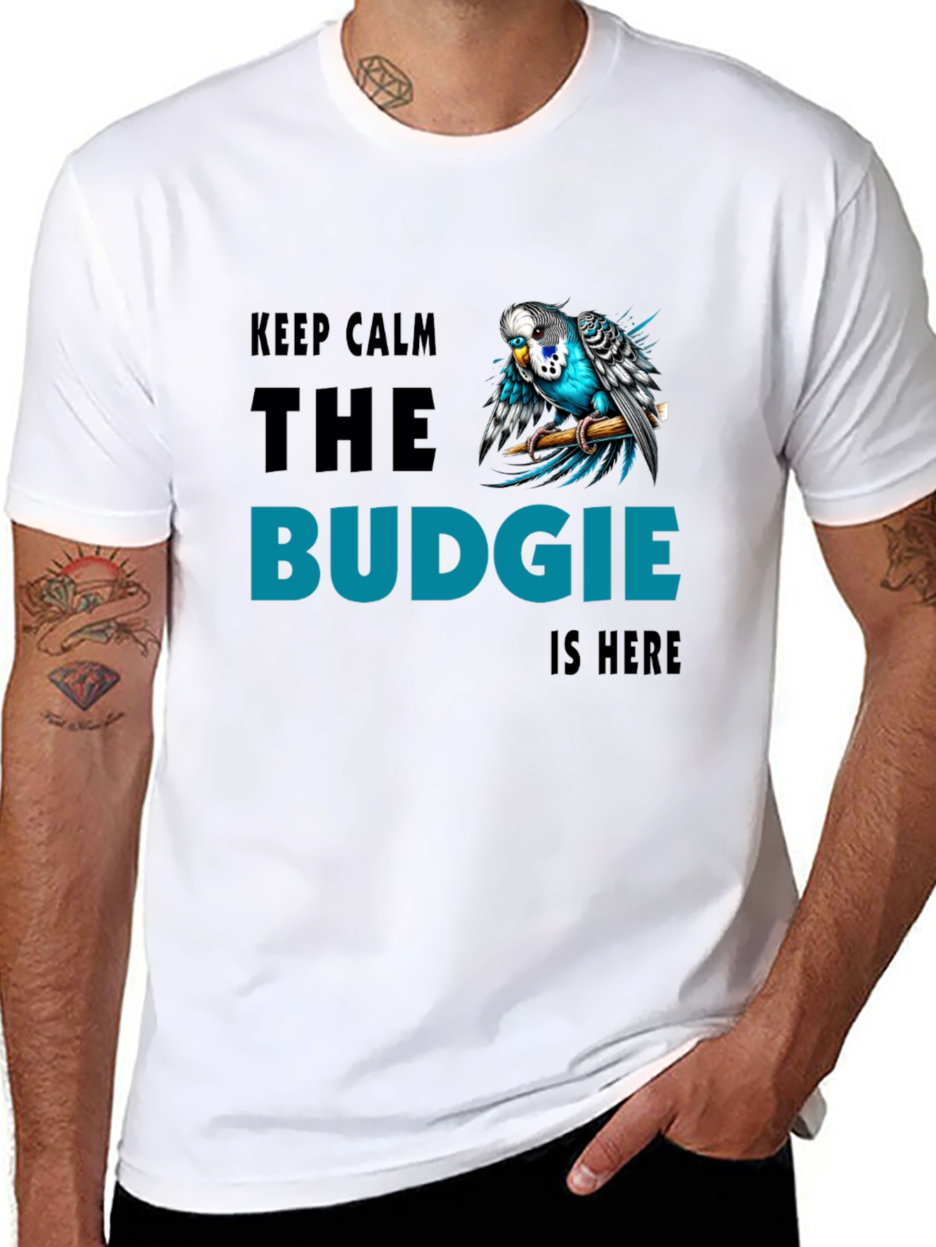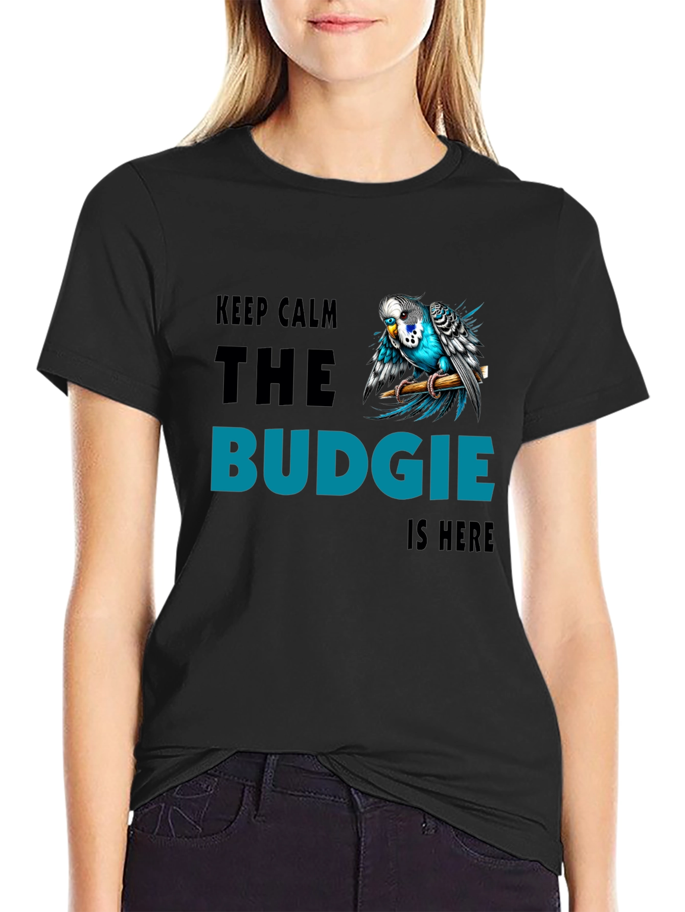Show your love for budgies with this unique and eye-catching t-shirt! Featuring a vibrant graphic of a blue and white budgie perched on a branch, this shirt is perfect for bird enthusiasts. The design incorporates the playful phrase "Keep Calm THE BUDGIE Is Here" in bold, contrasting fonts. Made from comfortable material, this tee is ideal for casual wear, birdwatching outings, or as a fun gift for any budgie lover. Stand out from the flock with this charming and stylish t-shirt that celebrates your favorite feathered friend!
