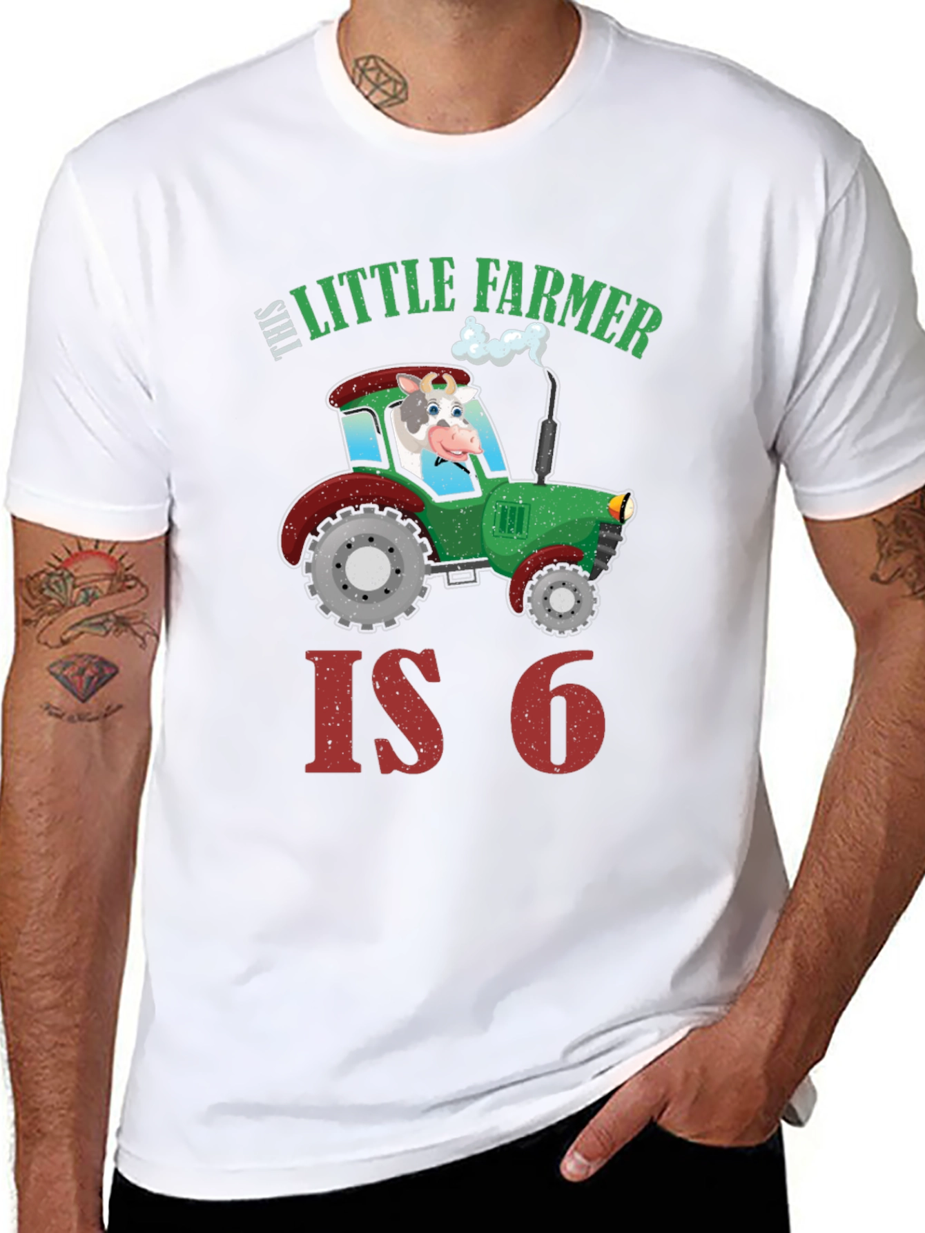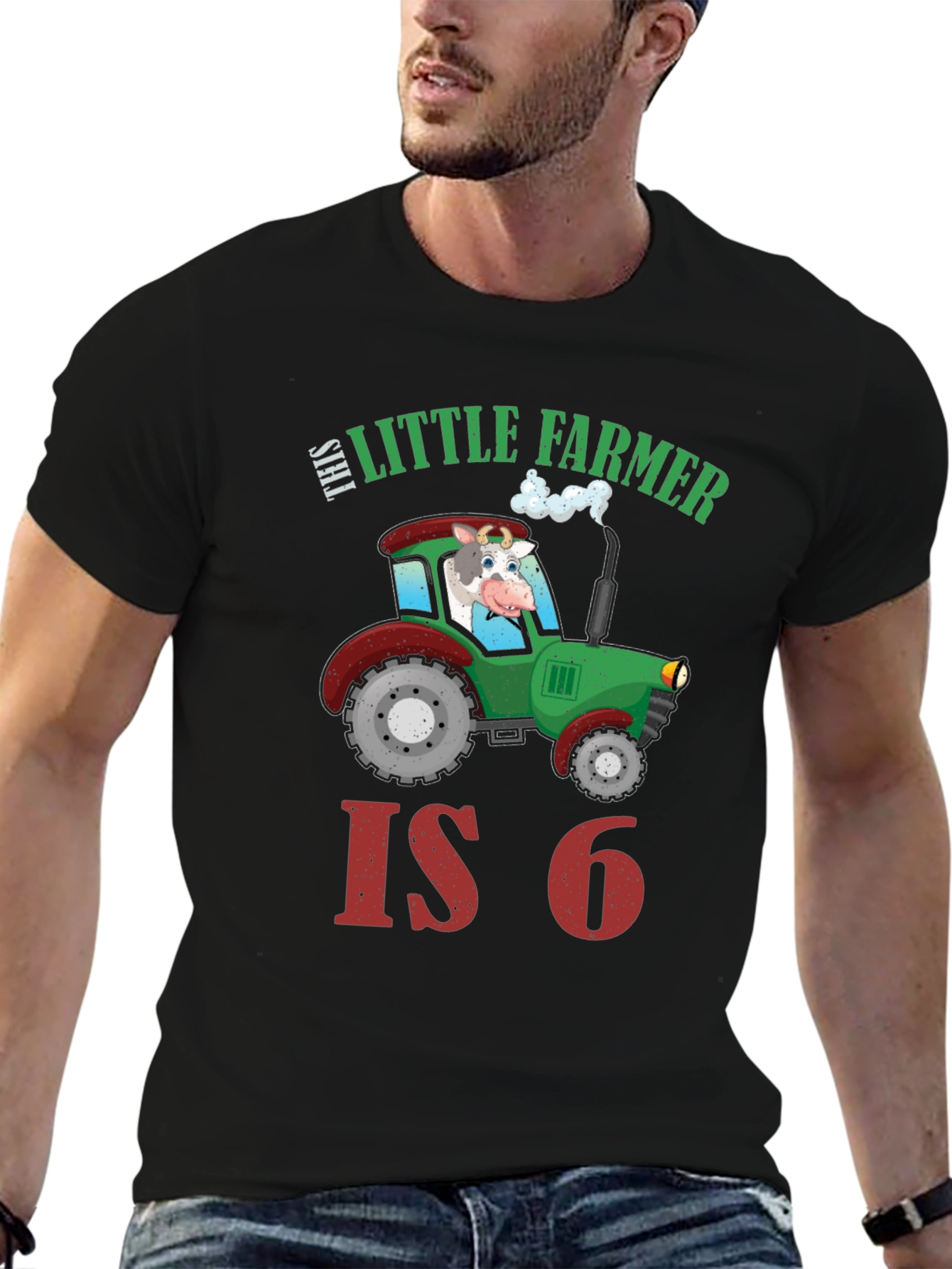 Celebrate your little one's 6th birthday with this adorable t-shirt. The design features a cute cow driving a green tractor, accompanied by the text "This Little Farmer is 6." Perfect for a farm-themed birthday party or everyday wear, this shirt is sure to bring a smile to everyone's face. The print is high-quality and durable, so your little farmer can wear it again and again. A fun and memorable gift for your child's special day!
