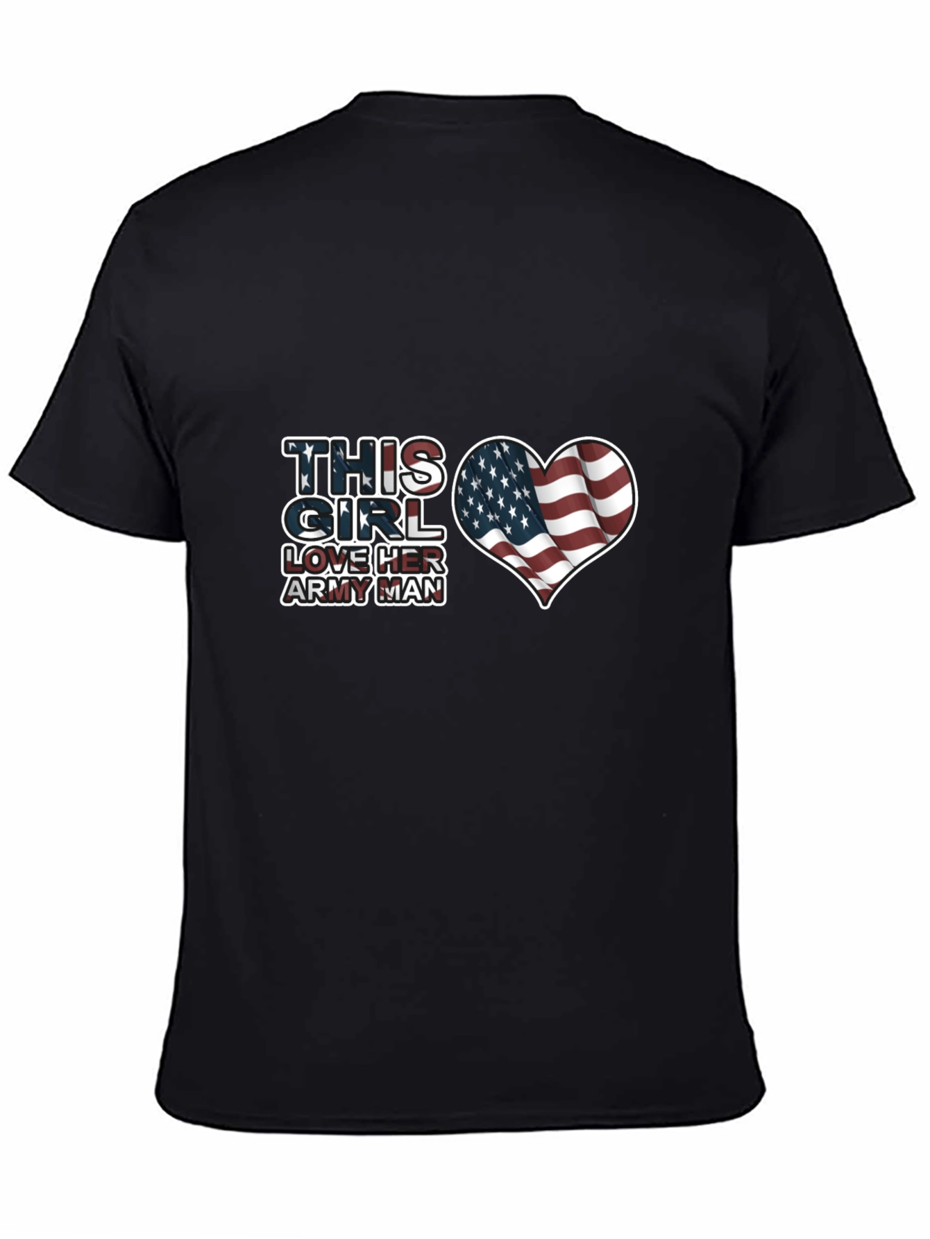 Show your love and support with this eye-catching t-shirt. The design features the phrase "THIS GIRL LOVE HER ARMY MAN" alongside a vibrant heart graphic filled with the American flag. Made from comfortable black fabric, this tee is perfect for everyday wear or special occasions. Ideal for proud girlfriends, wives, or family members of those serving in the Army. Express your patriotism and dedication in style! Great for wearing to parades, military events, or just to show your support. This shirt is sure to turn heads and spark conversations.